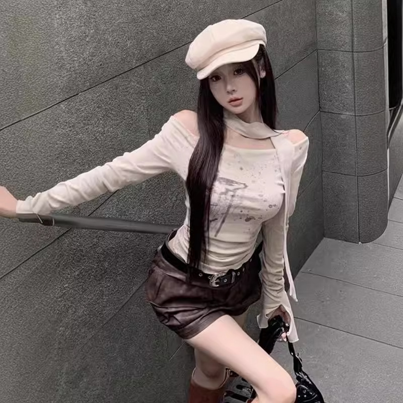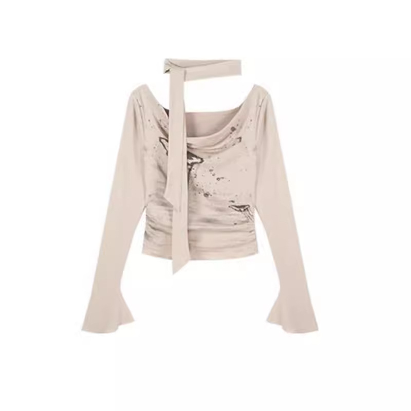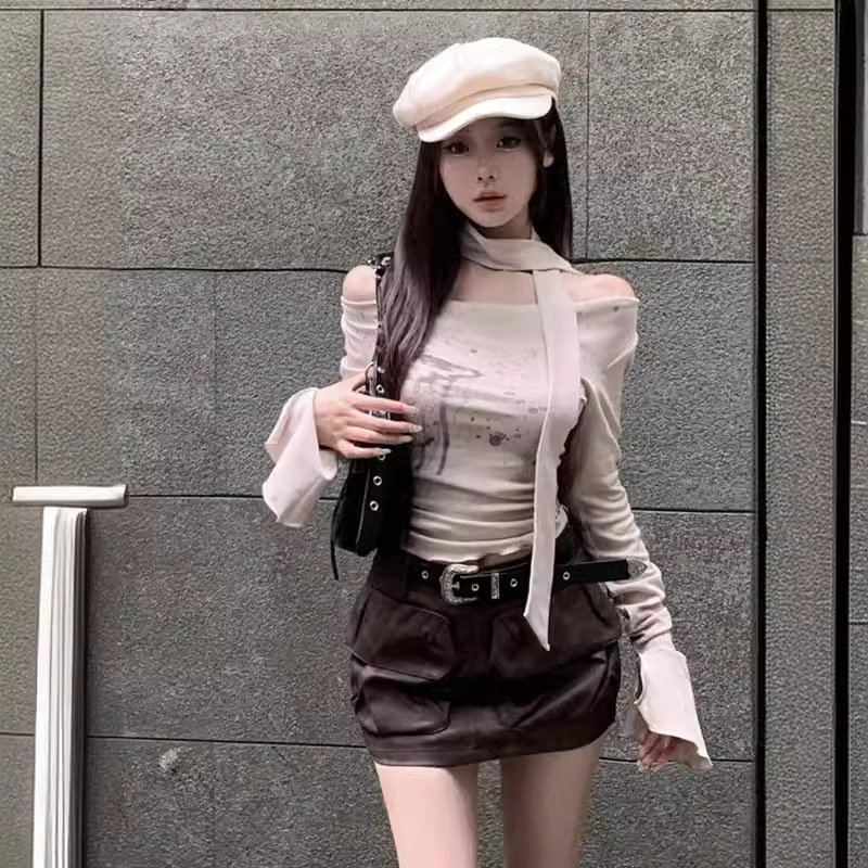 纯欲辣妹一字肩印花T恤女装秋季修身短款别致设计感露肩长袖上衣