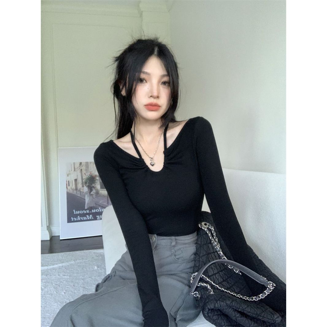 纯欲风挂脖v领露锁骨别致上衣女秋冬长袖打底衫小众设计感短款T恤