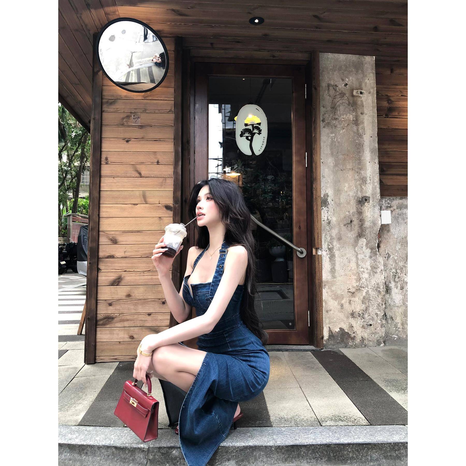灰尘邓邓 牛仔挂脖连衣裙女2025夏季辣妹开叉包臀长裙抹胸裙子