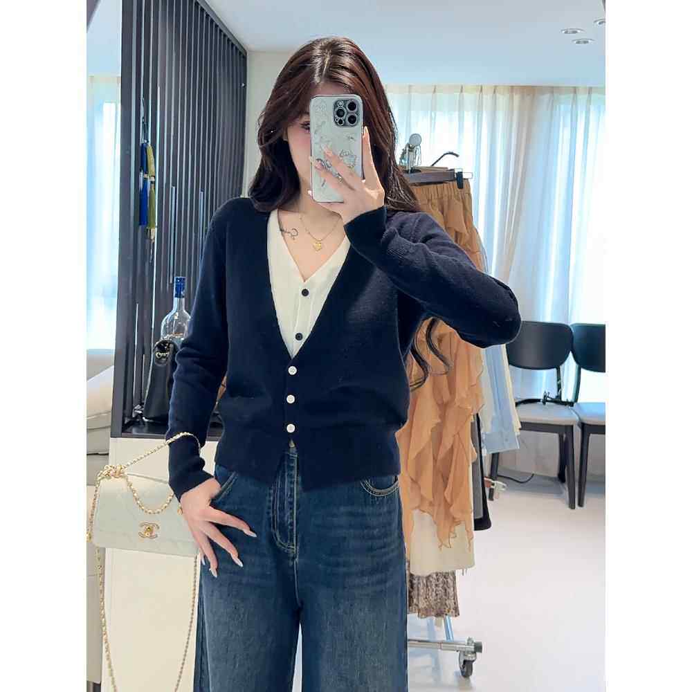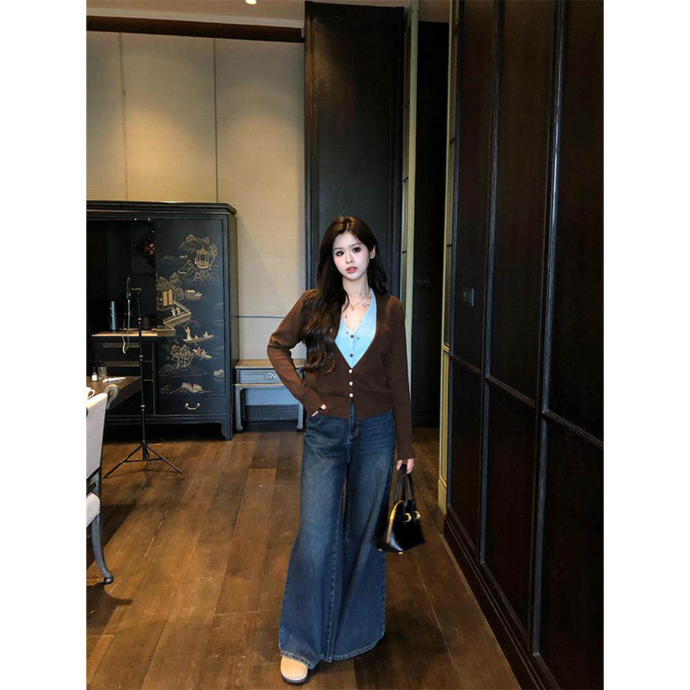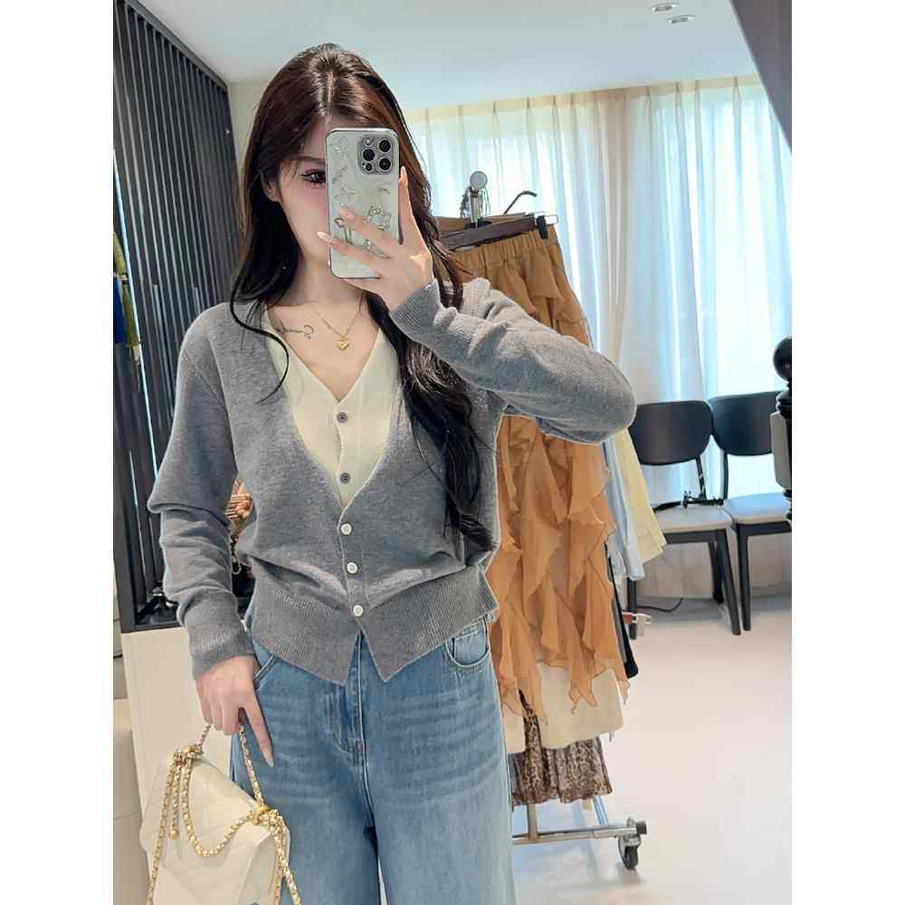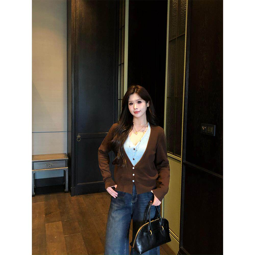 李潇洒【早八穿搭】咖色假两件针织开衫女秋韩系微胖大码V领毛衣