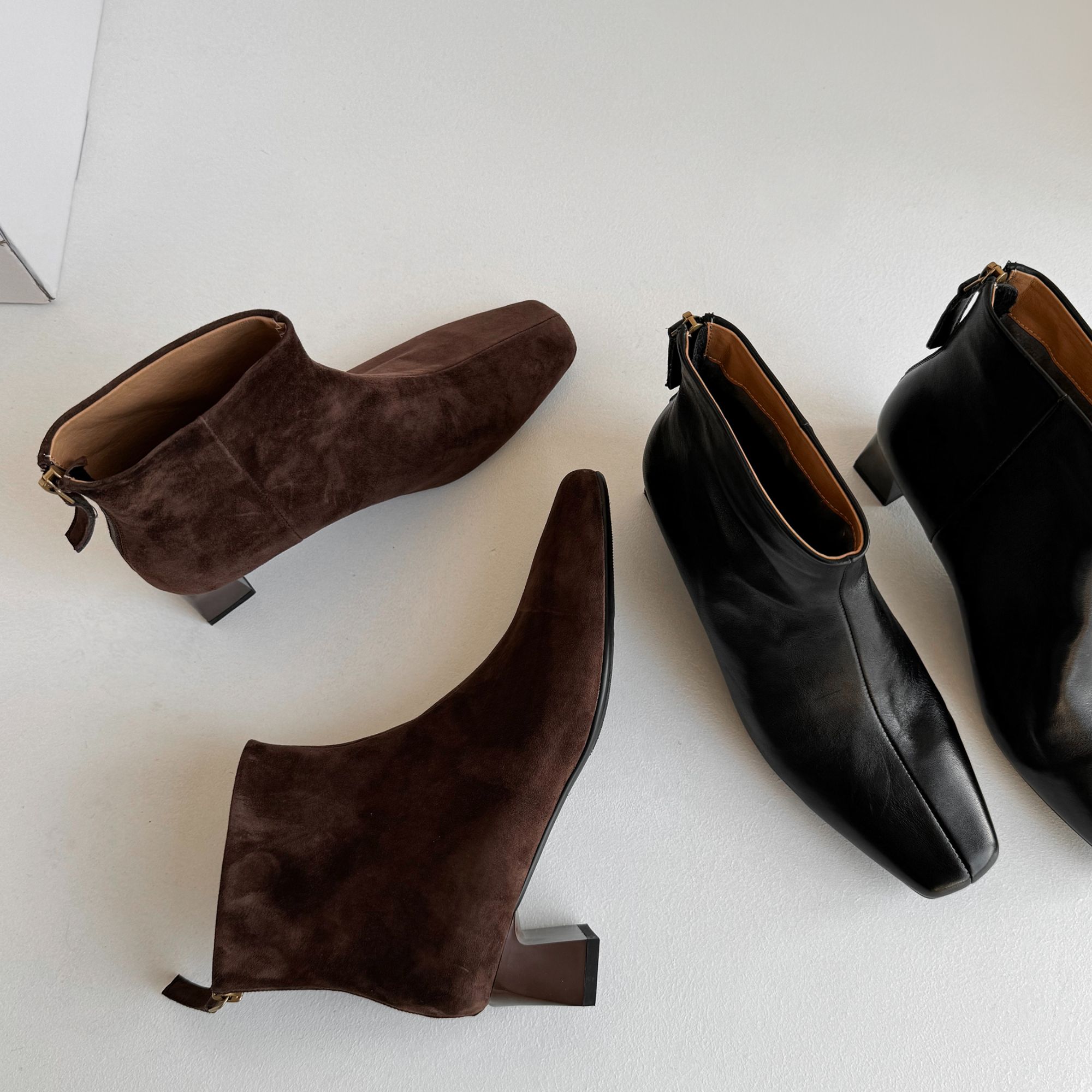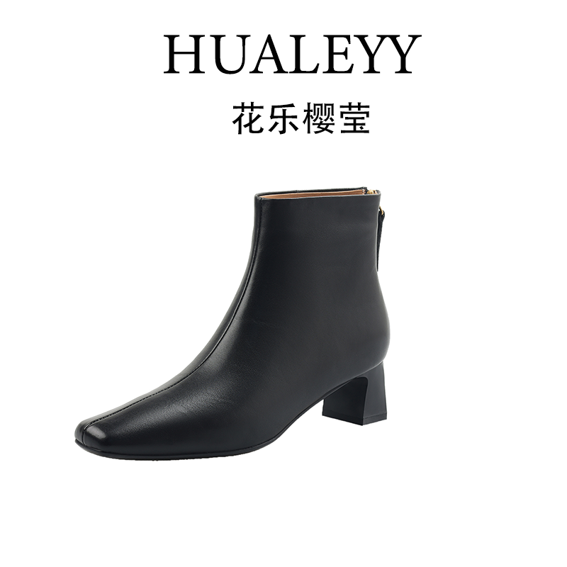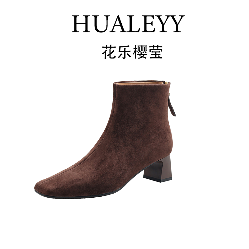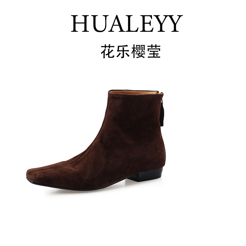 HUALEYY 2CM/34-40/牛皮羊翻皮/极简方头内增高老钱风短靴