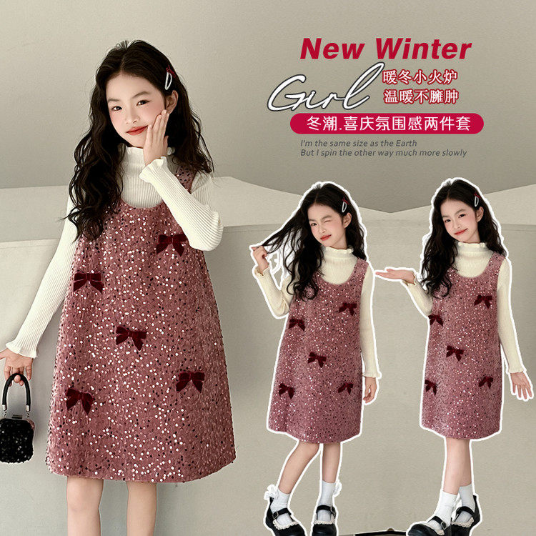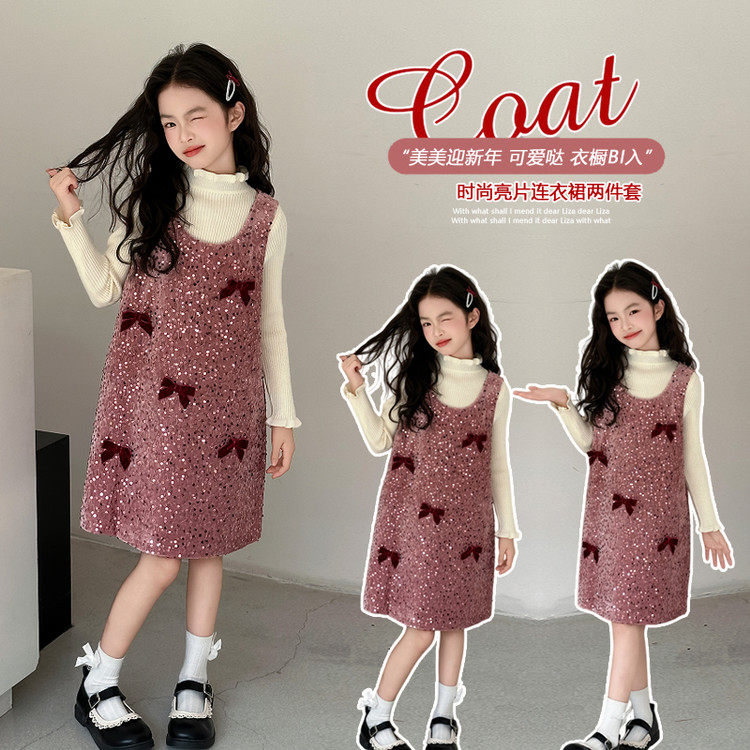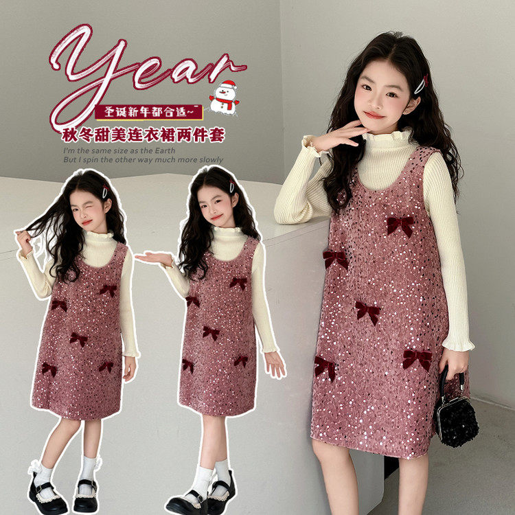 韩版女童粉色亮片连衣裙两件套秋冬加厚保暖中裙公主裙