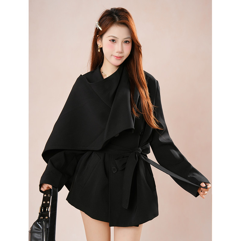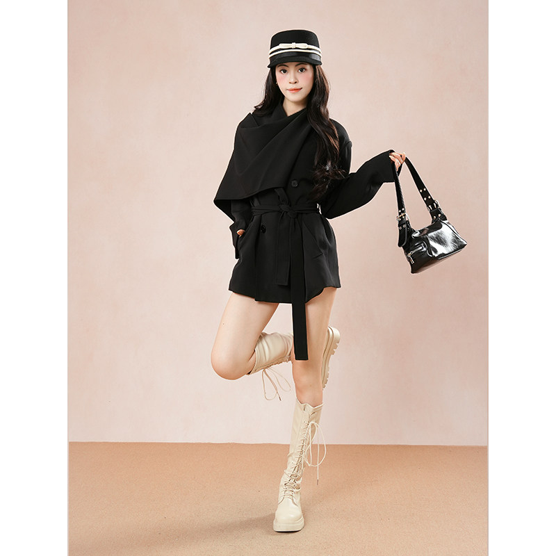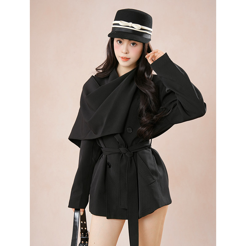 短款黑武士 黑色廓形围巾短款风衣女秋冬设计感修身显瘦披肩外套