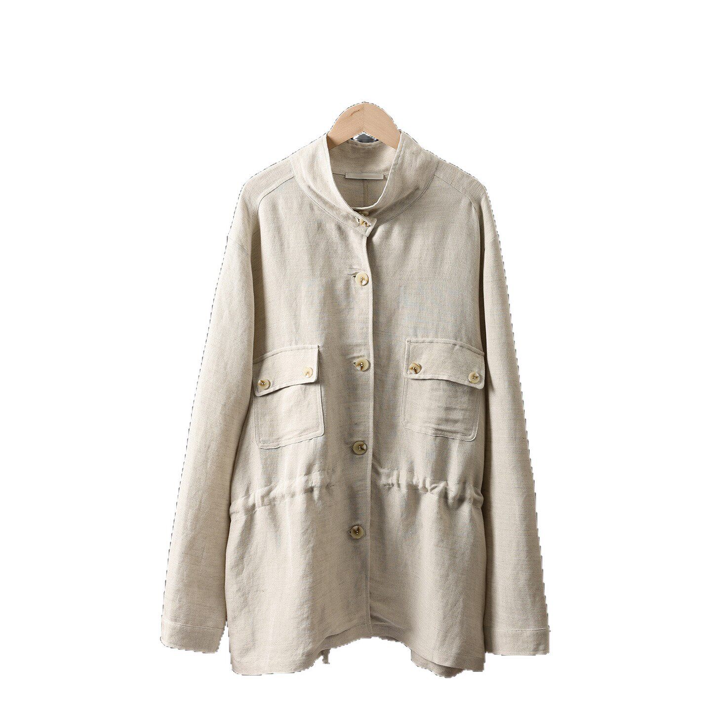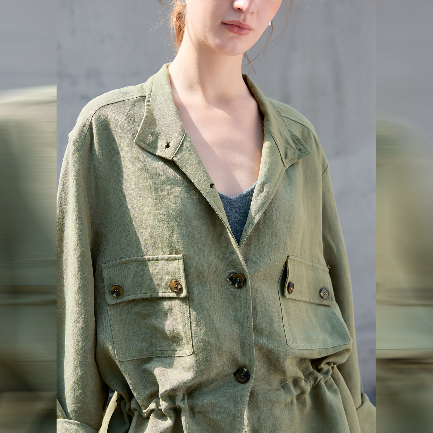 亚麻工装风衣廓形翻领衬衫2026春小众收腰麻料老钱风军绿棉麻外套