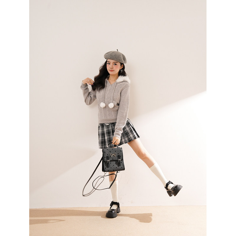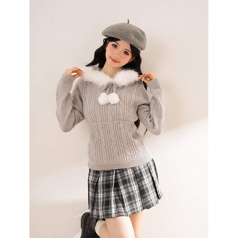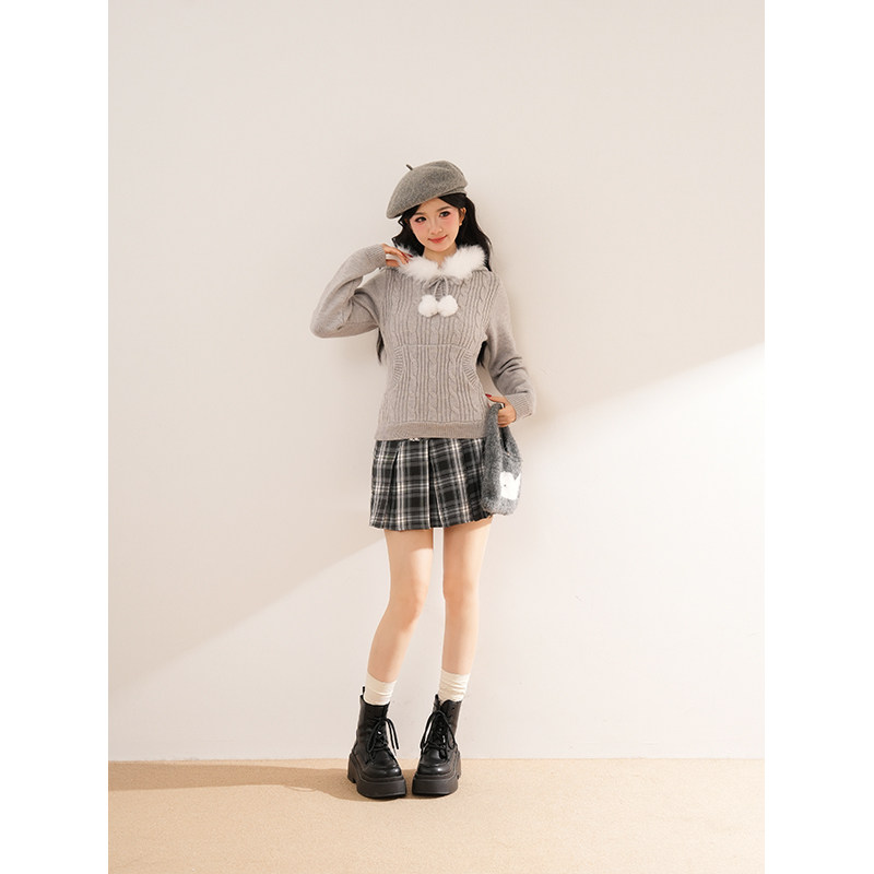 薄雾冬日 冬季新款日系古早奈奈风毛领连帽毛衣外套格纹半裙套装