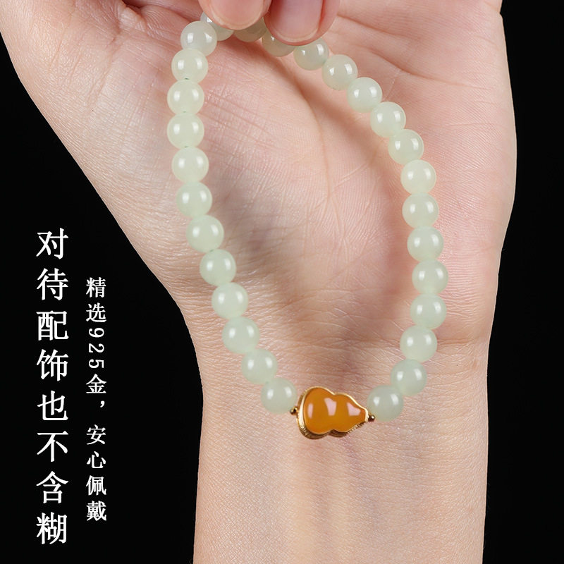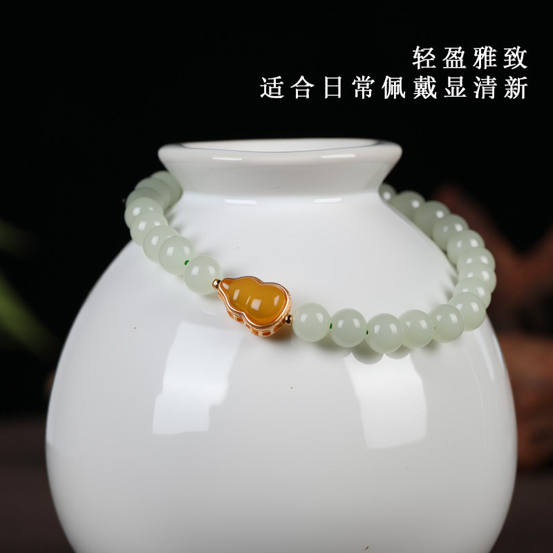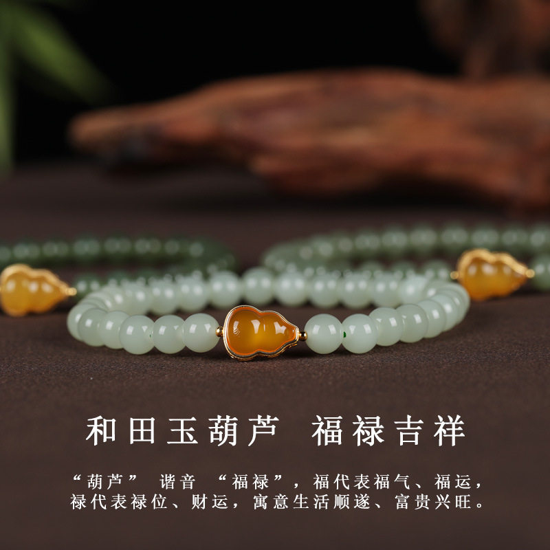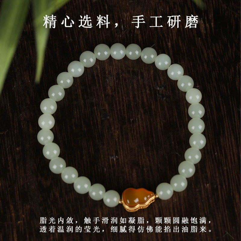 唐今玉原创手工天然晴水青海青湖水绿和田玉手链6mm珠葫芦蜜蜡925