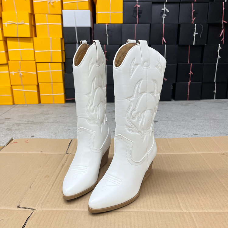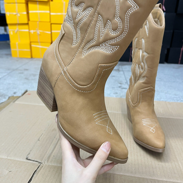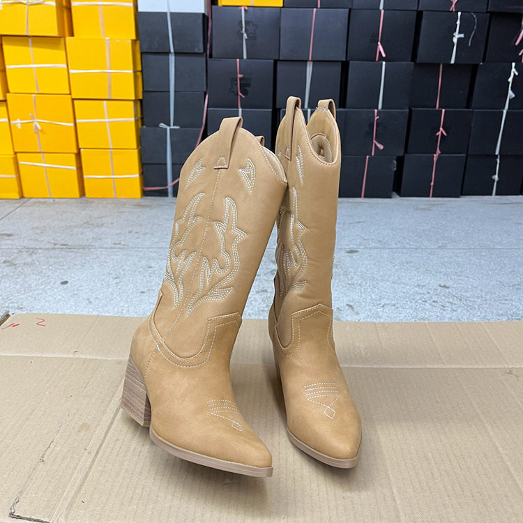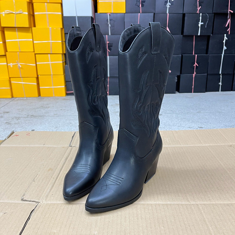 Lady Shoes外贸原单女靴新款时尚尖头纯色粗跟套筒复古时装长靴