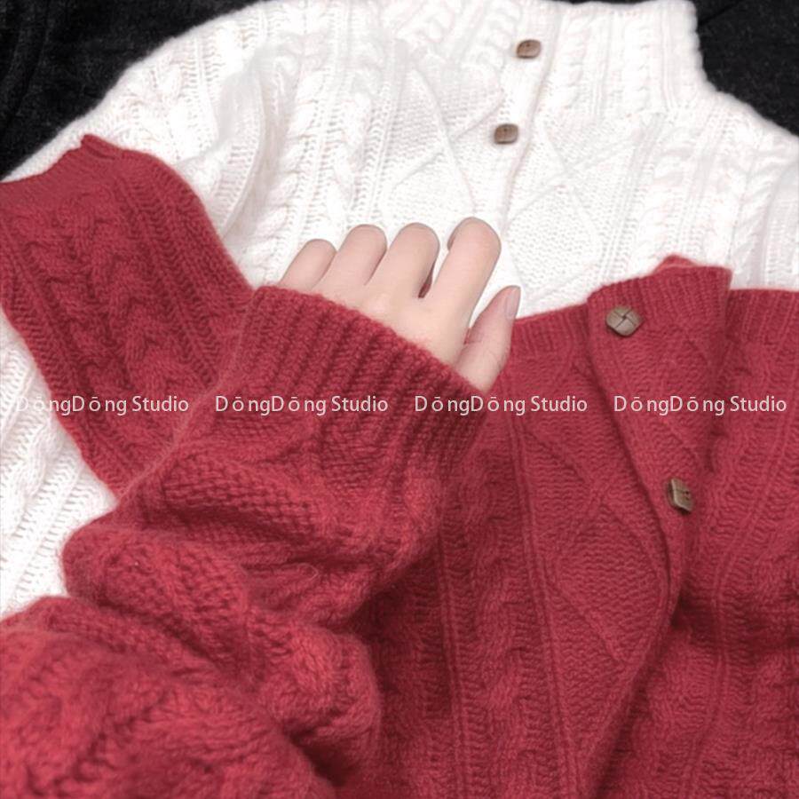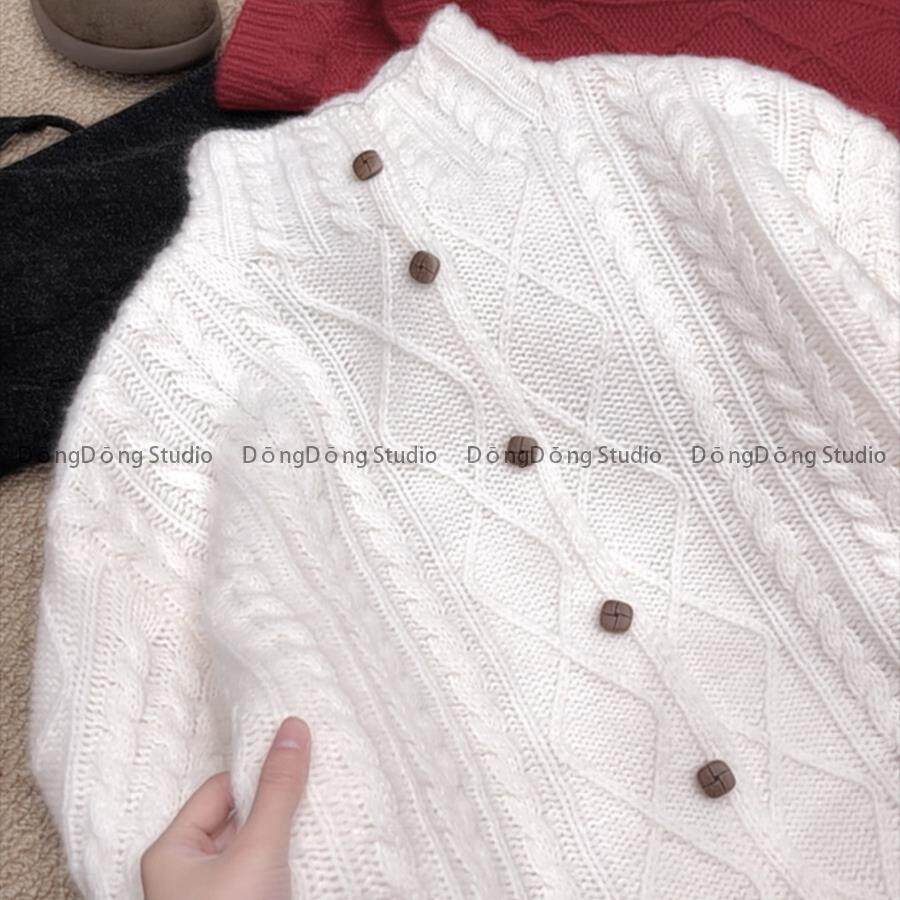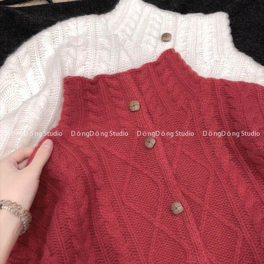 冬季新品【全毛木扣开衫】麻花半高领宽松长袖针织毛衣外套253005