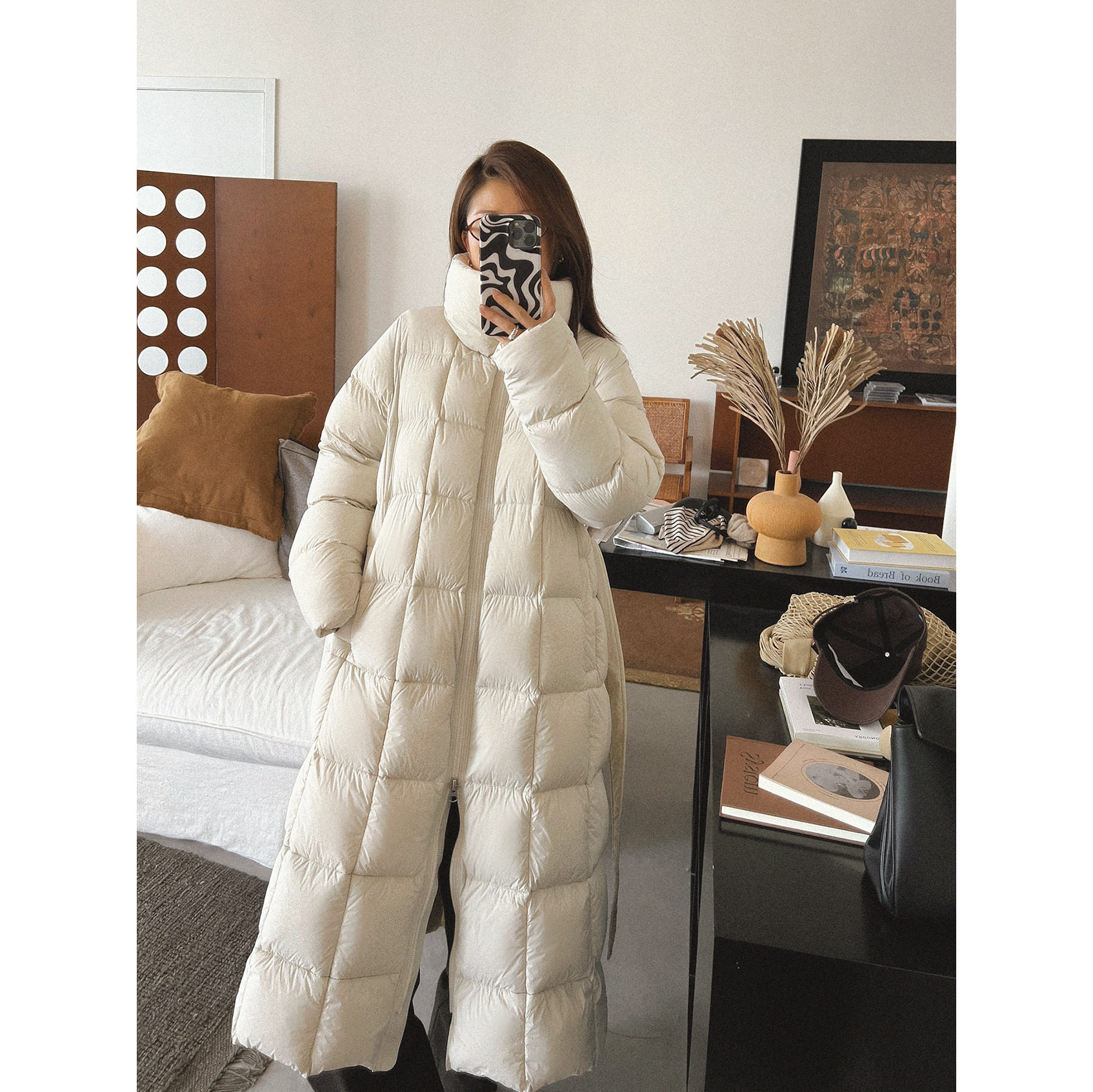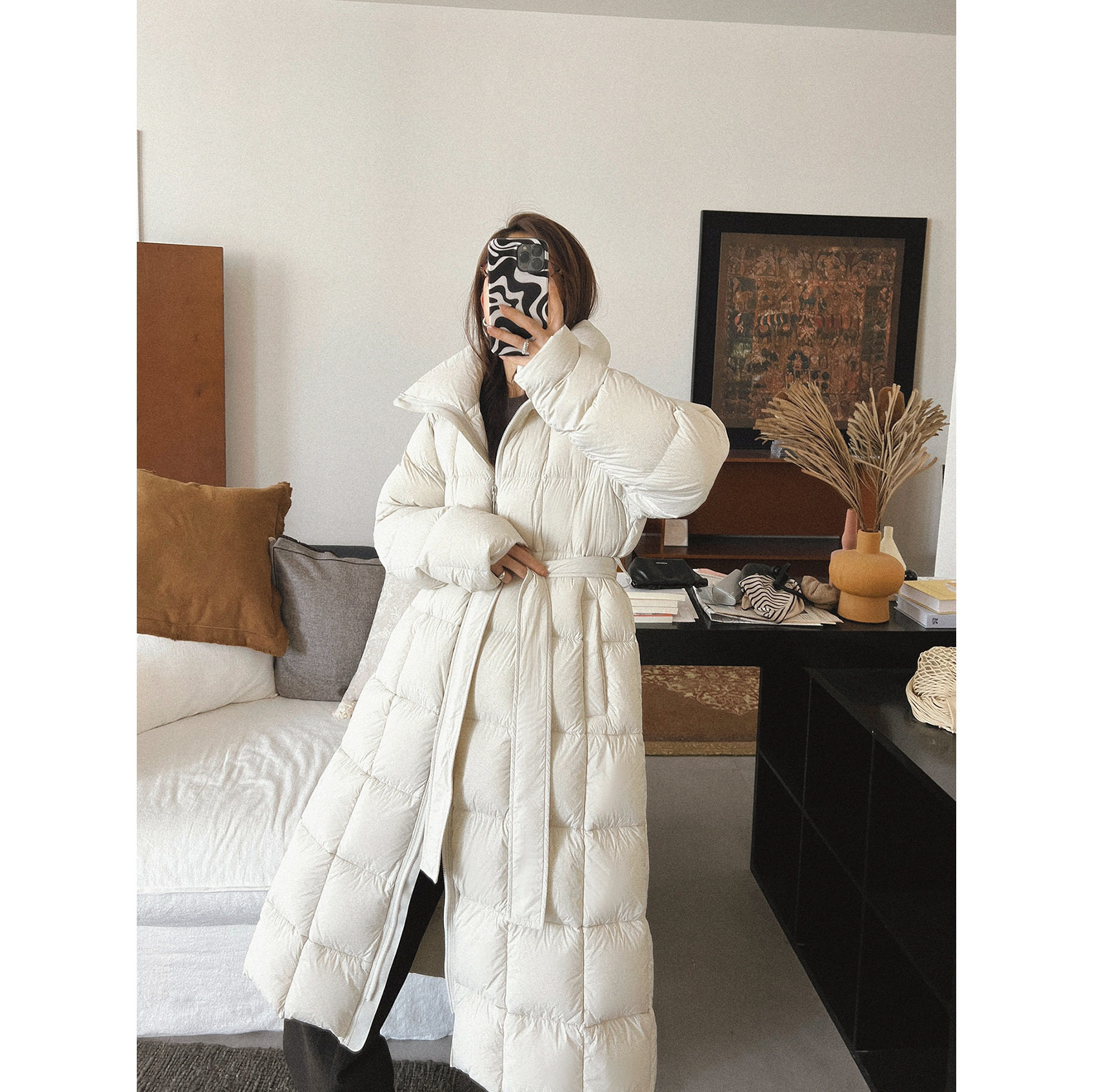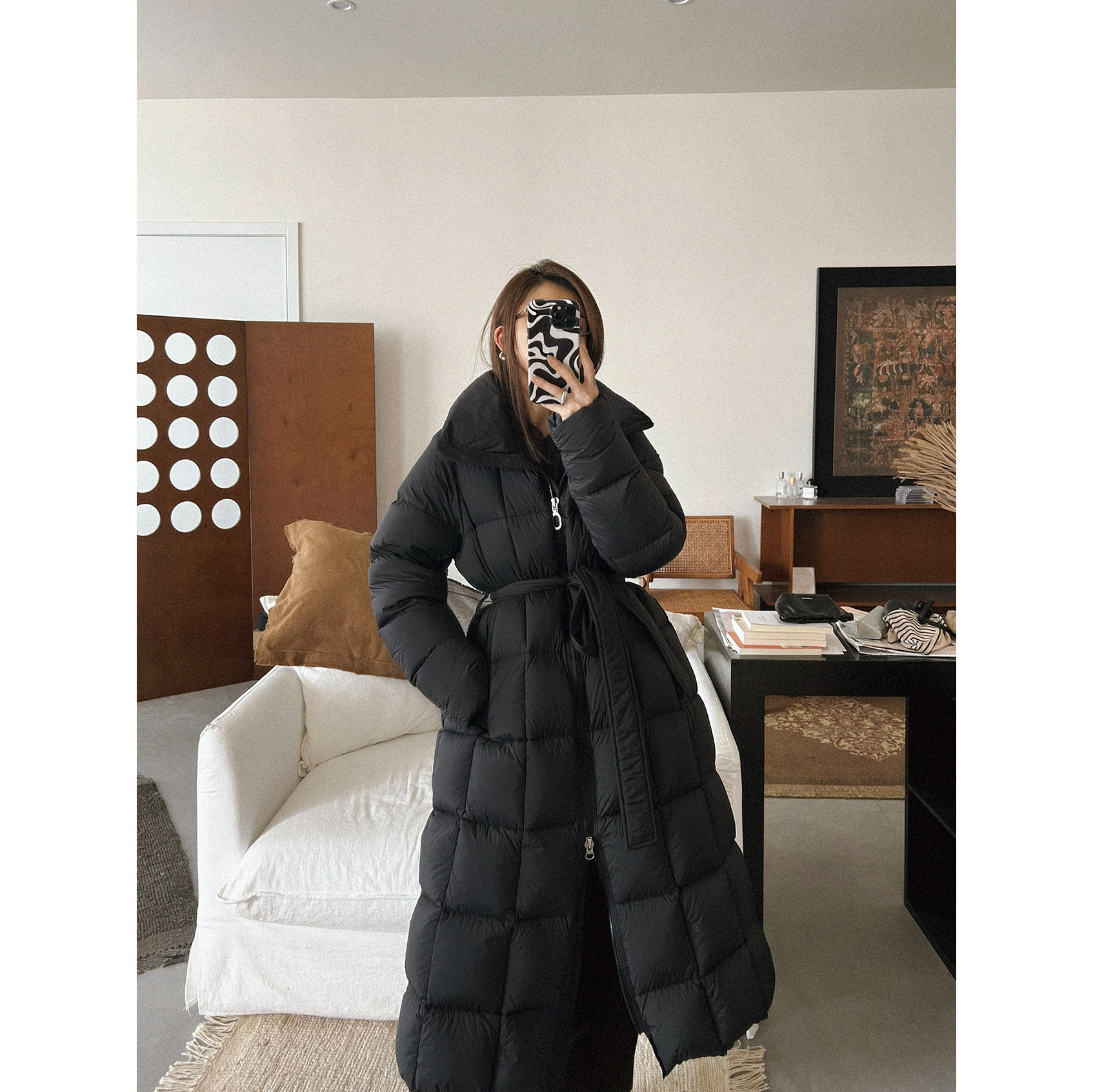 Tania 95白鸭绒 简约纯色腰带款加长冬季控温哑光女士翻领羽绒服