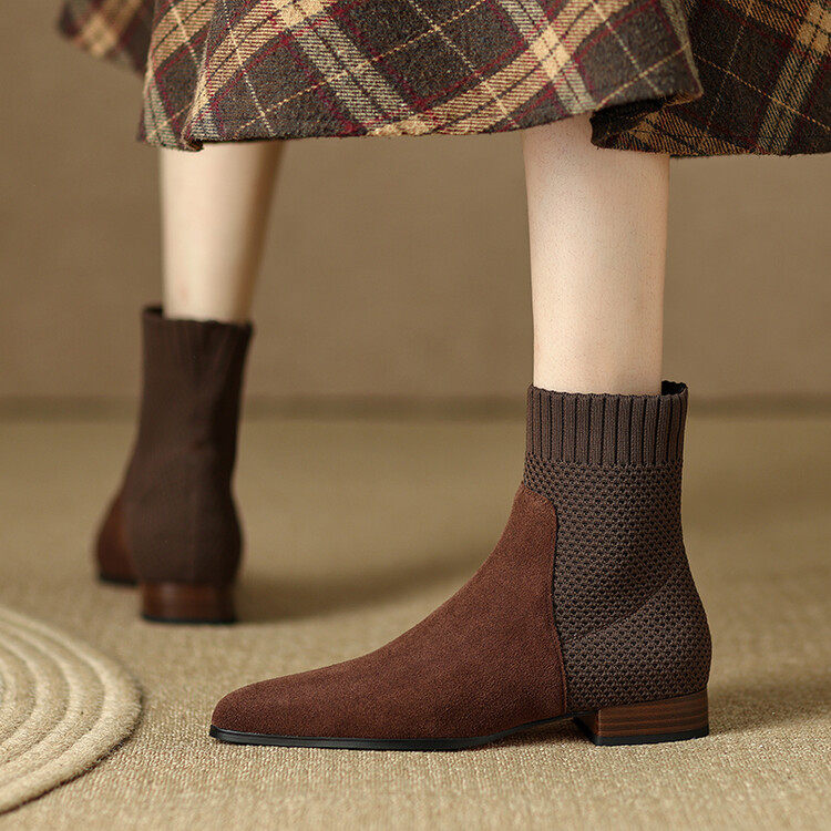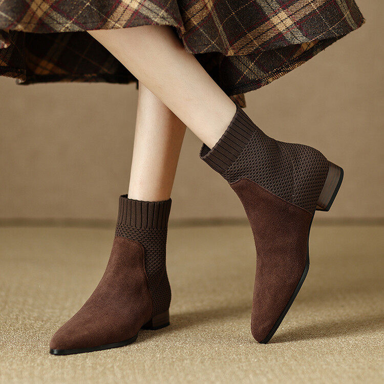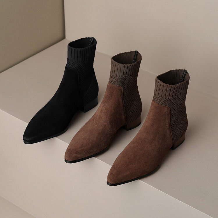 34-39码12.5cm跟高|黑/深棕|休闲尖头粗跟套脚针织复古弹力短靴秋