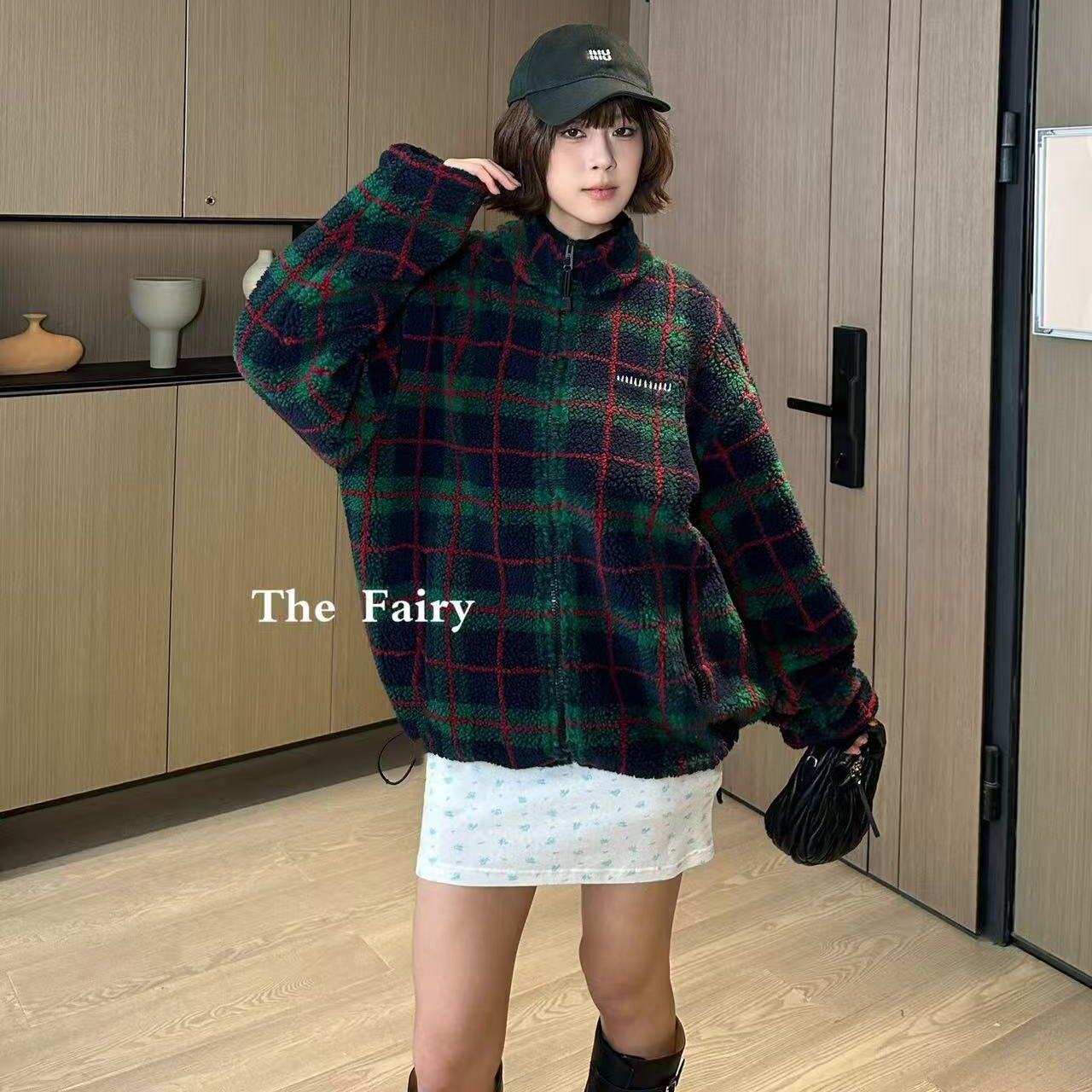 好漂亮复古日杂感摇粒绒立领格子外套女短款拉链宽松百搭时尚显瘦