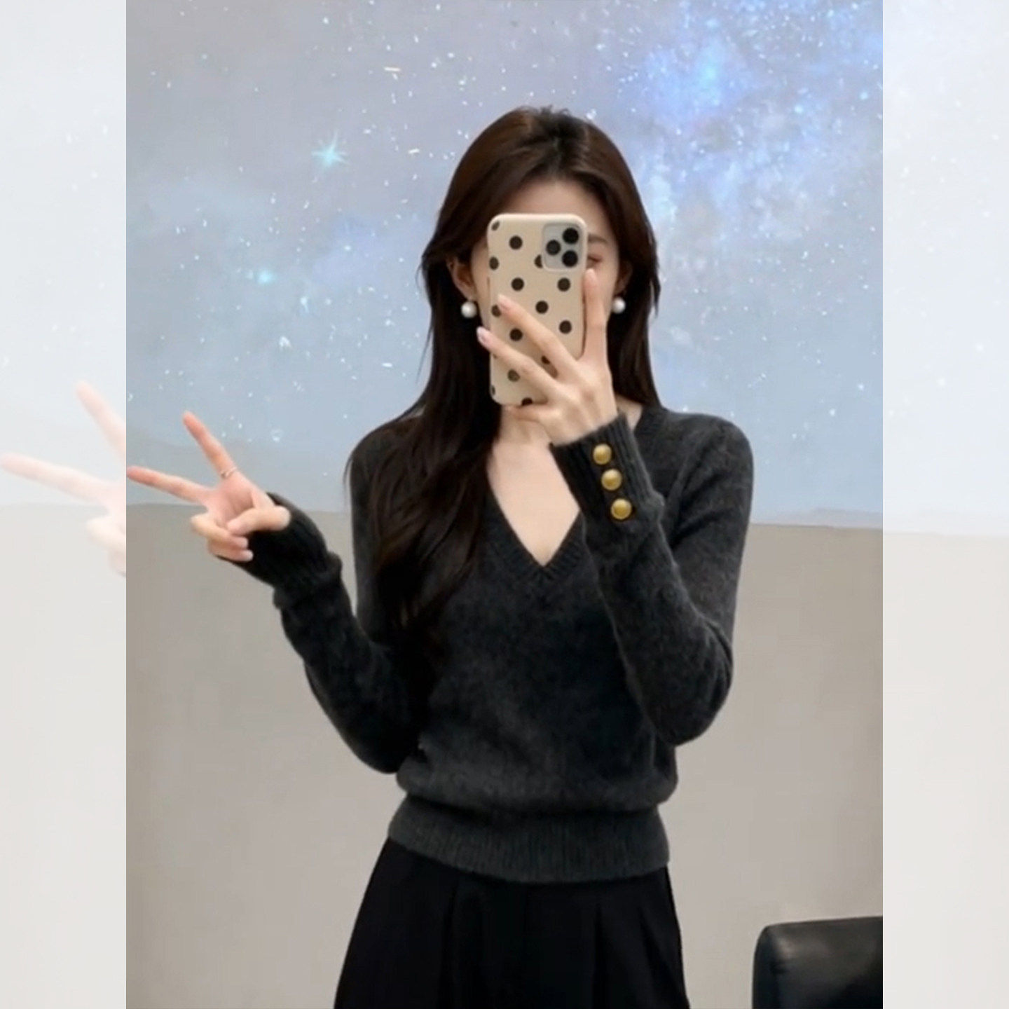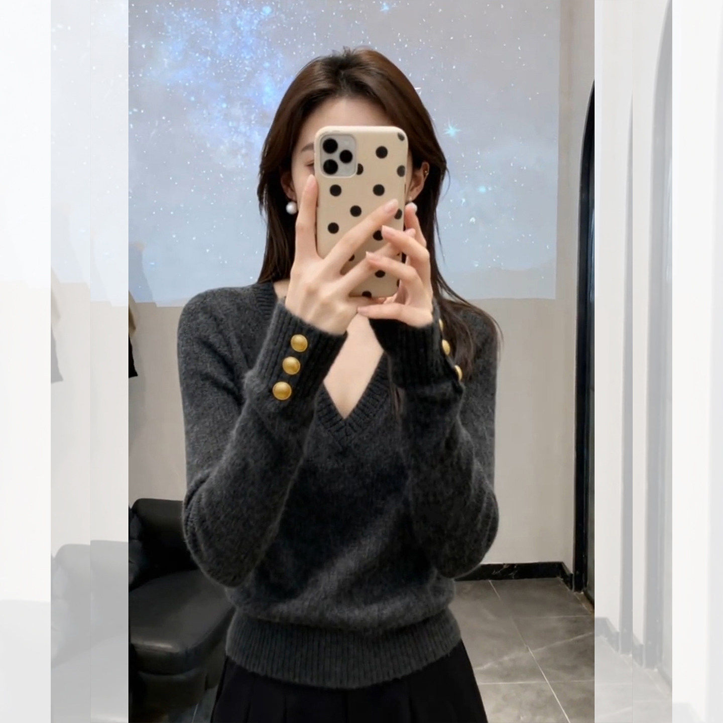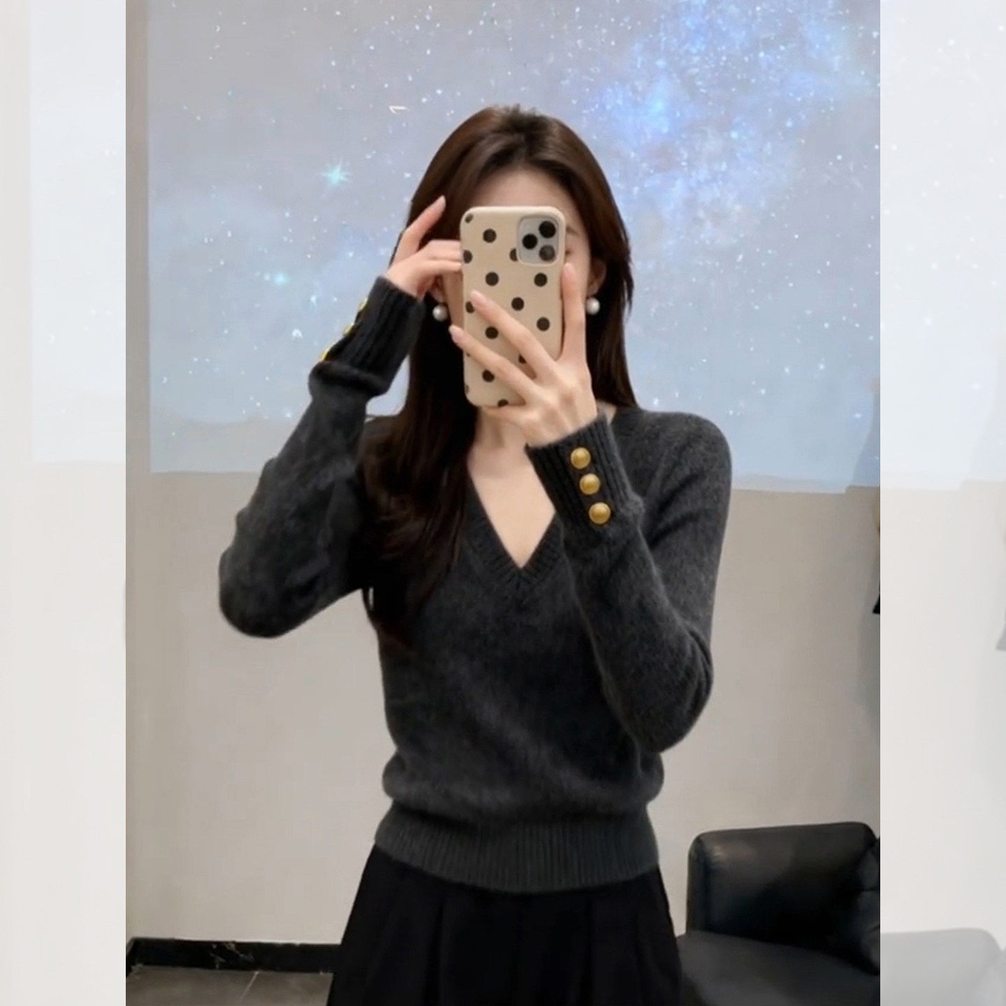 法式小香风灰色V领针织打底衫女秋冬轻奢高级感毛衣内搭气质上衣