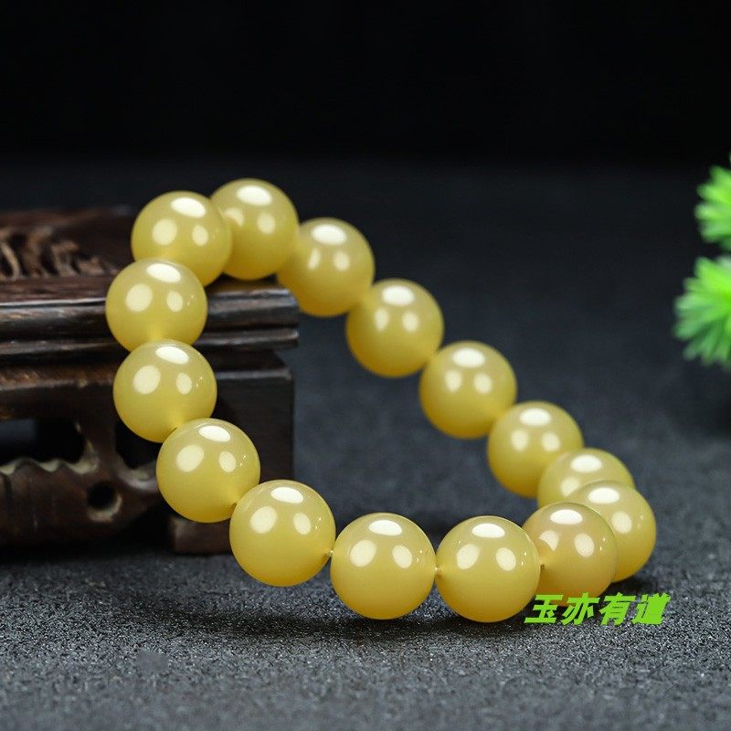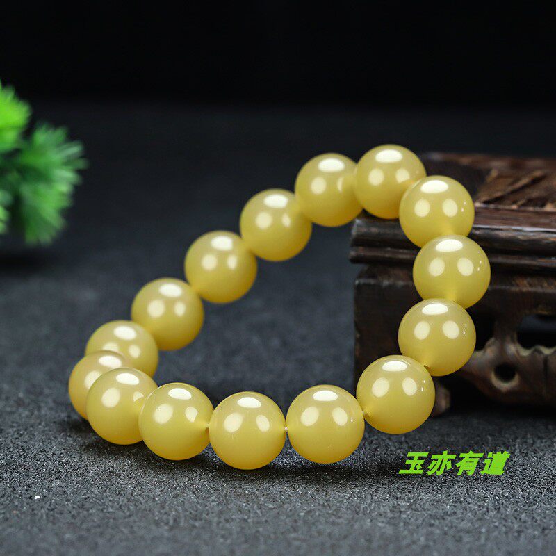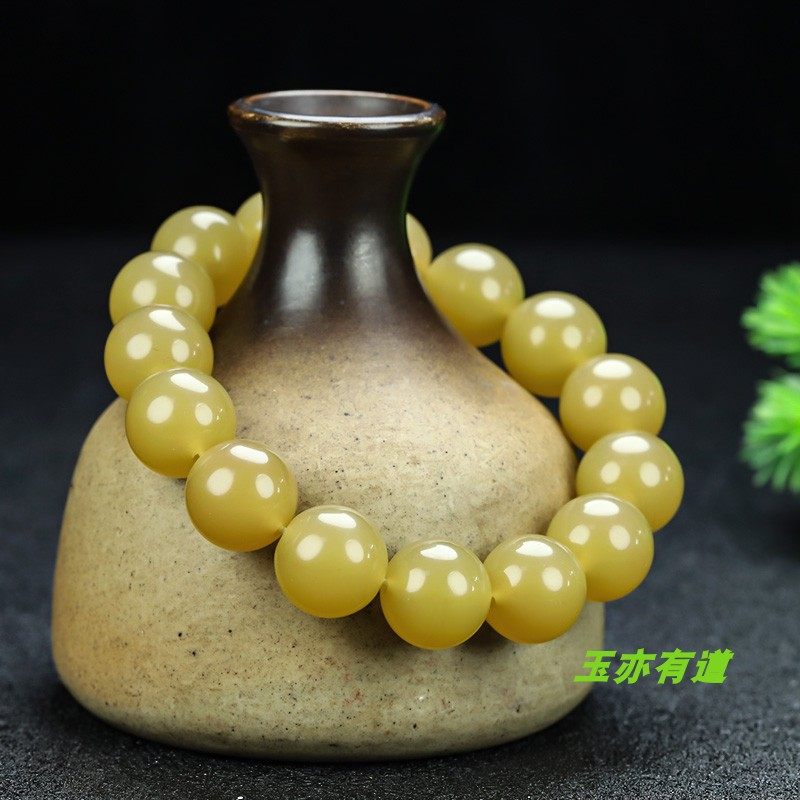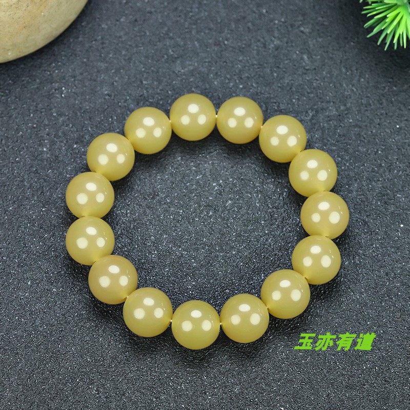 新疆和田玉黄玉手链天然玉石米黄玉14mm珠子手串戈壁玉糖料手串