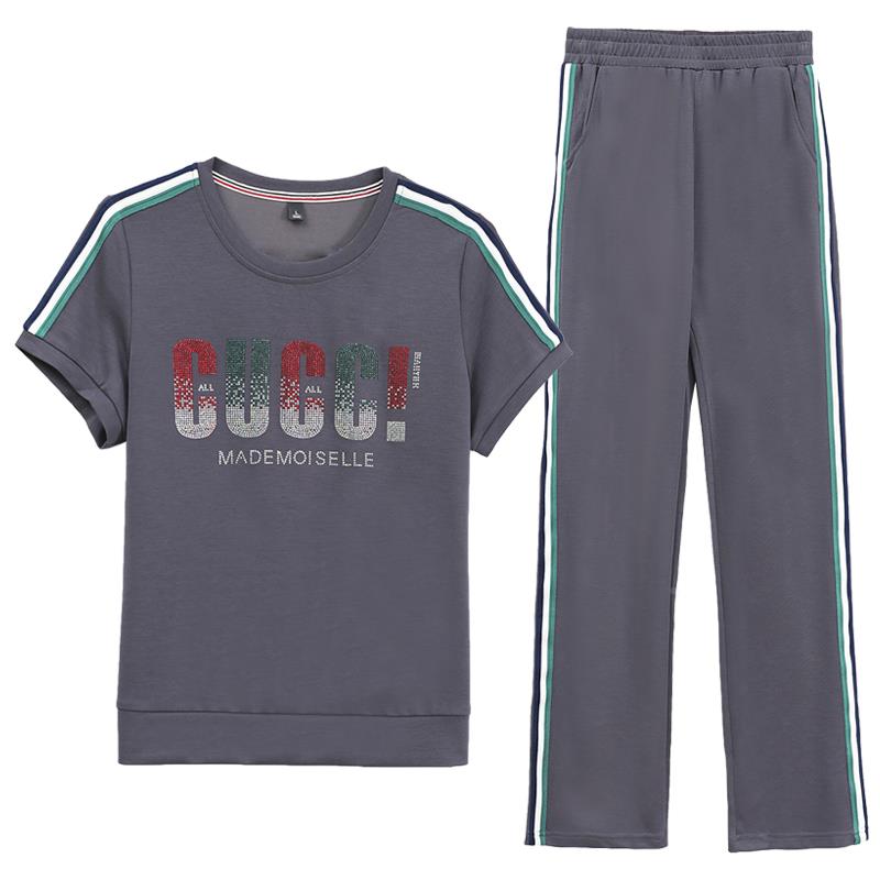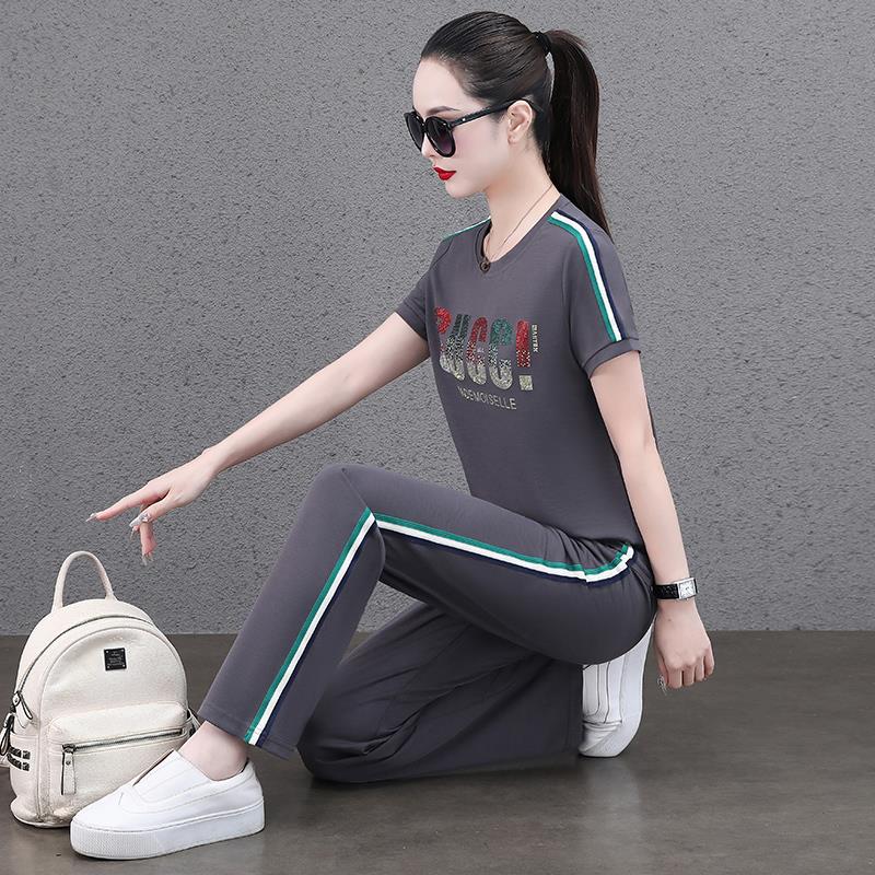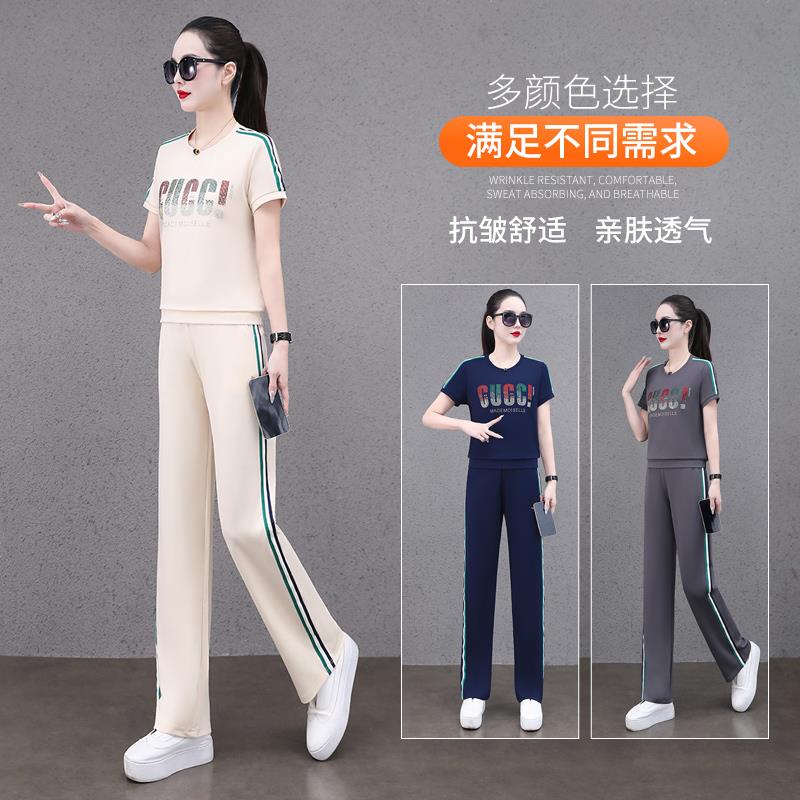 休闲运动气套装女夏季新款时尚洋领妈妈立短袖步长裤跑89826842两