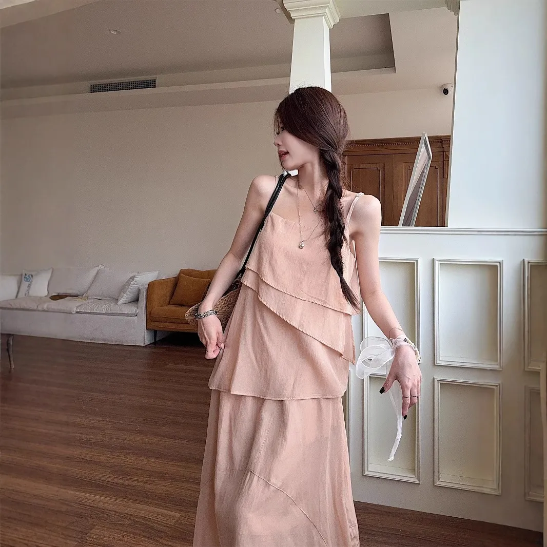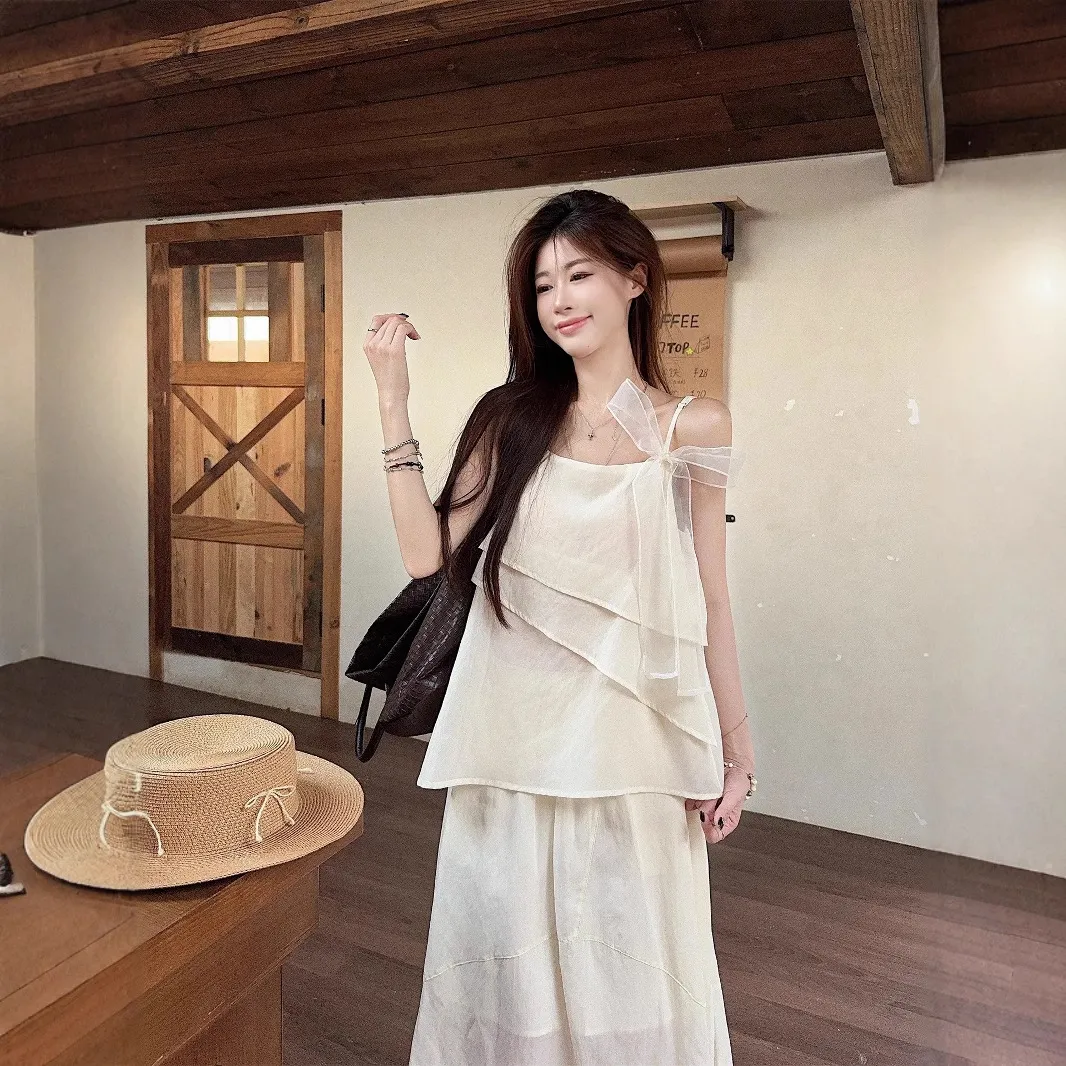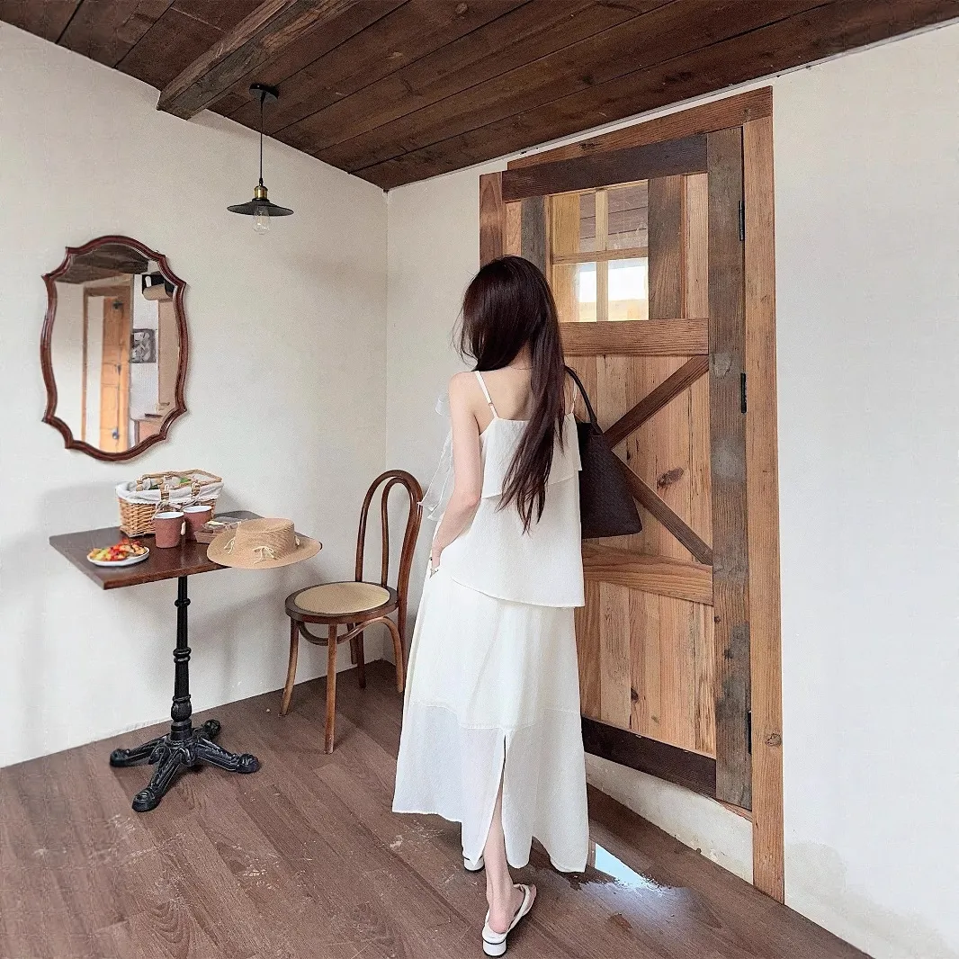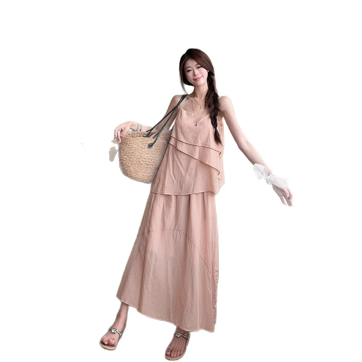 实拍 2025夏季新款简约纯色荷叶边吊带上衣女高腰半身裙两件套装