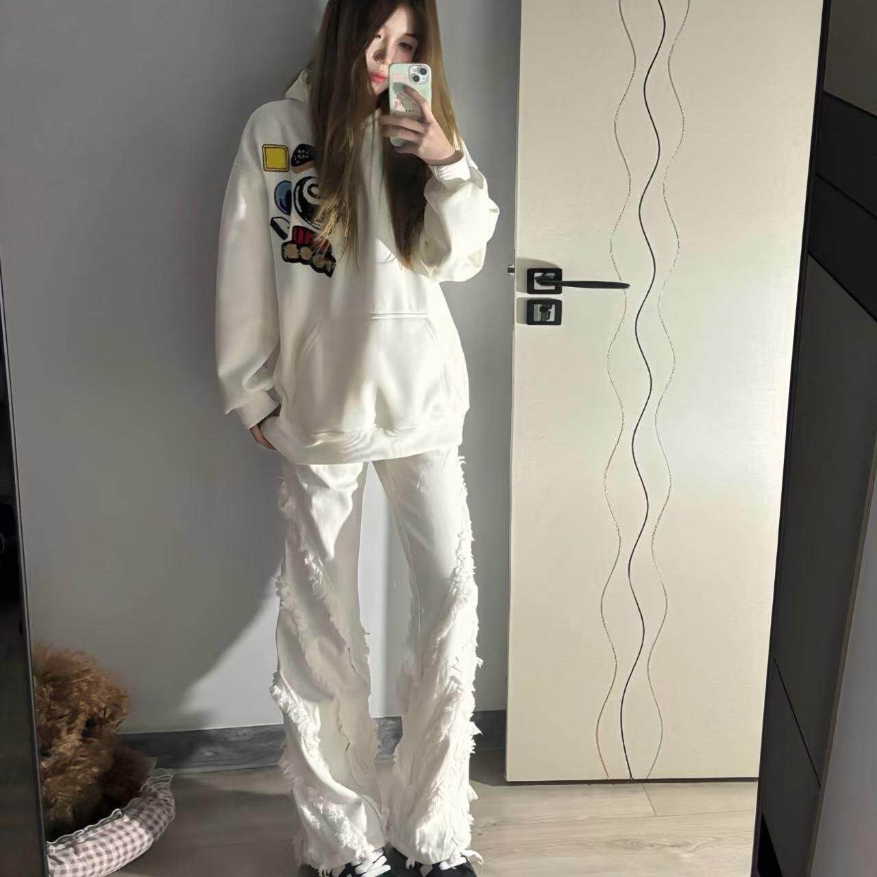 国潮牌美式复古勋章字母刺绣连帽卫衣女秋冬加绒加厚宽松情侣外套