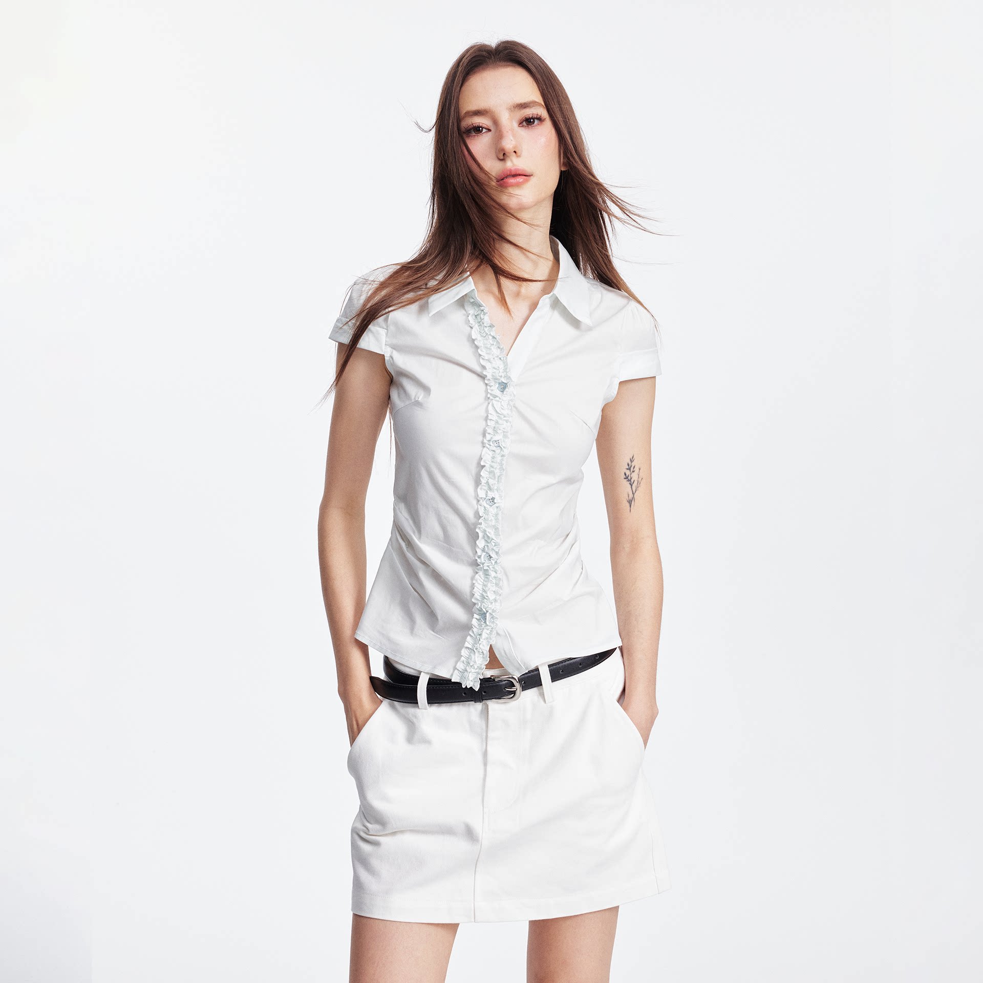SEGI原创设计夏季新款弹力收腰侧缝捏褶花边短袖衬衫女高级感上衣