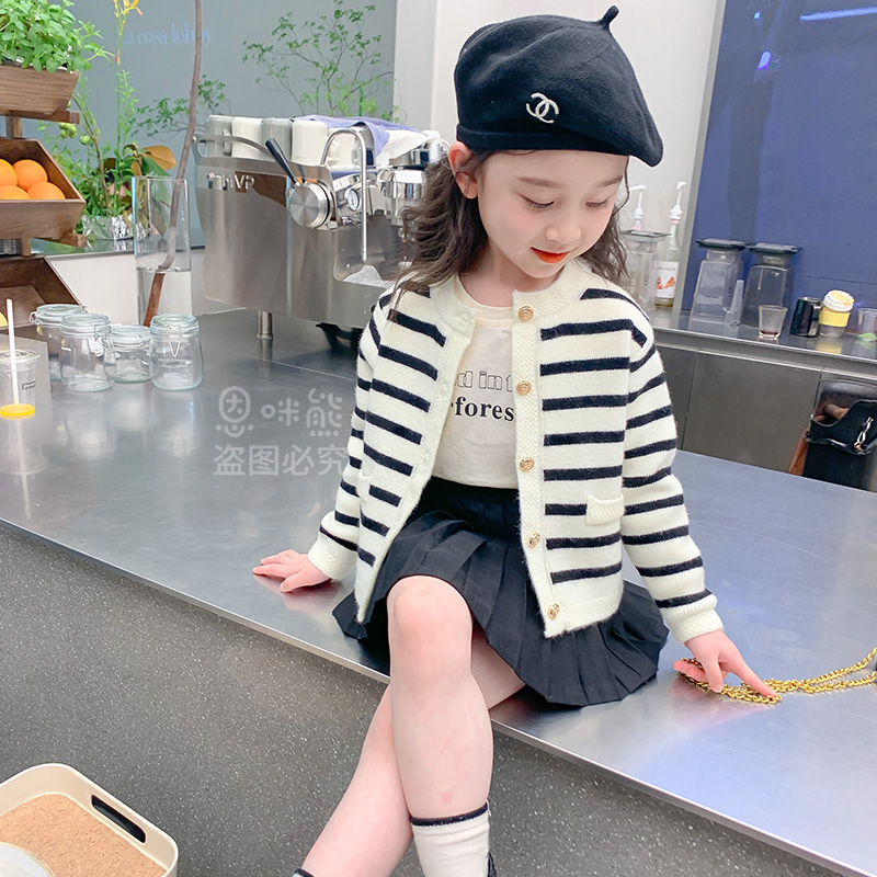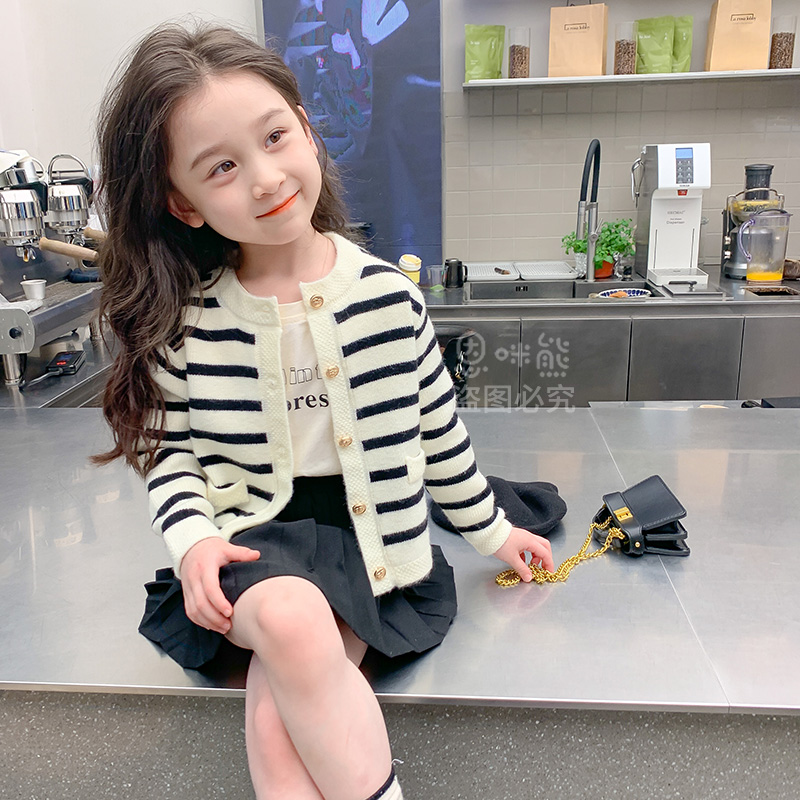 韩系女童针织开衫加绒春秋季新款韩版儿童洋气条纹毛衣外套长袖潮