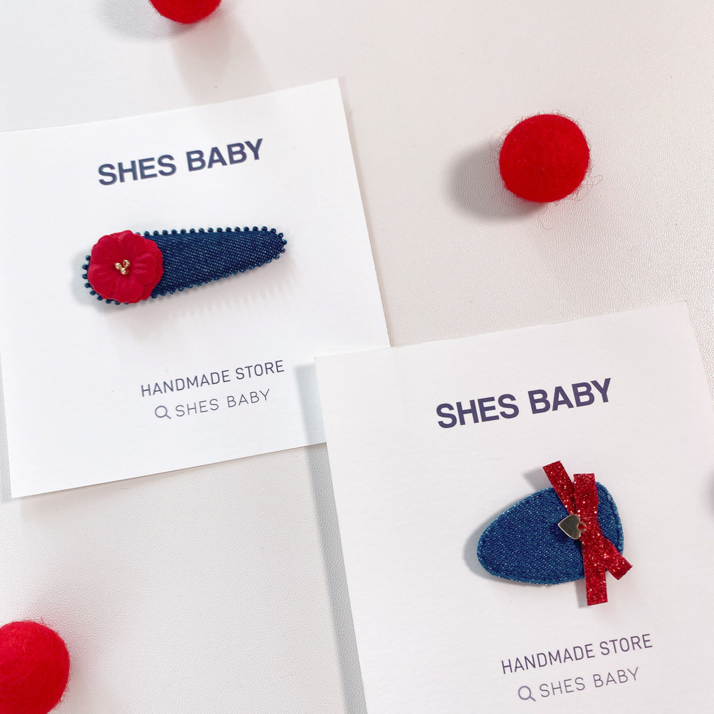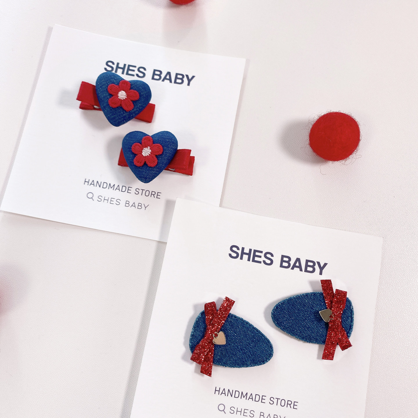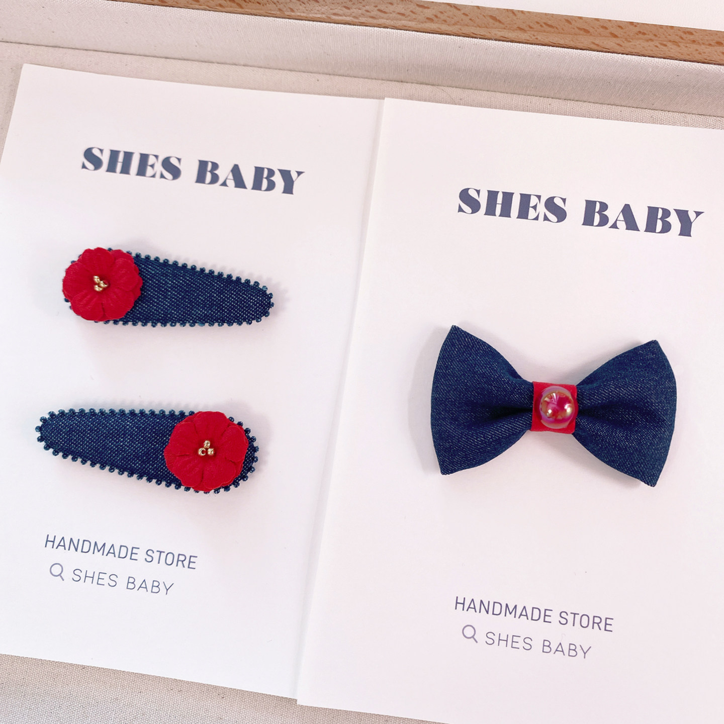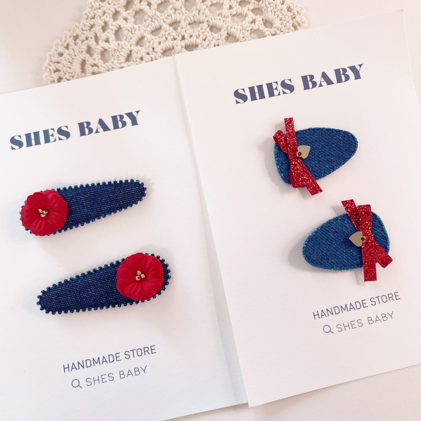 韩国设计师新品女童红色发夹牛仔蓝爱心花朵蝴蝶结发饰宝宝头饰