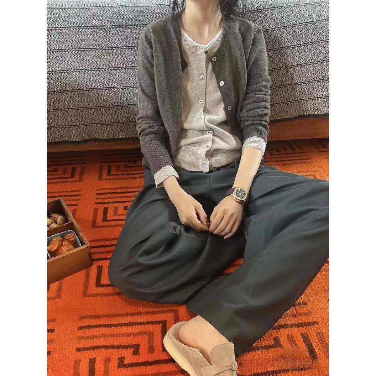 100%美丽诺羊毛开衫女秋冬灰色假两件针织衫高级感老钱风毛衣外套