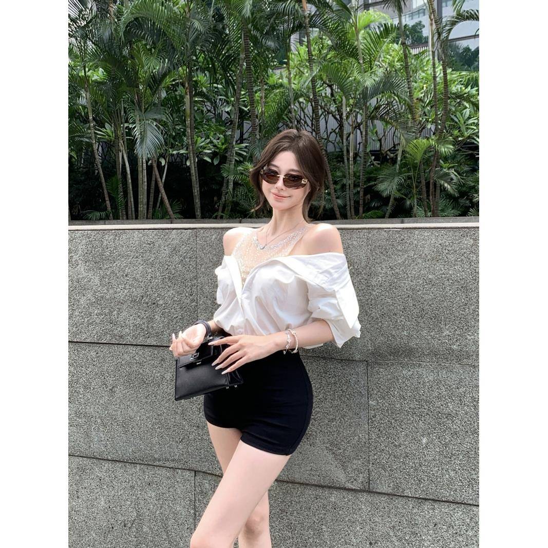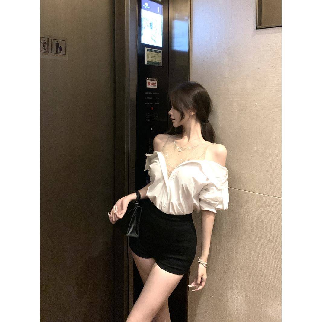拼接网纱假两件烫钻长袖衬衫女装秋季设计感收腰衬衣白色露肩上衣