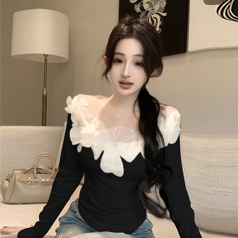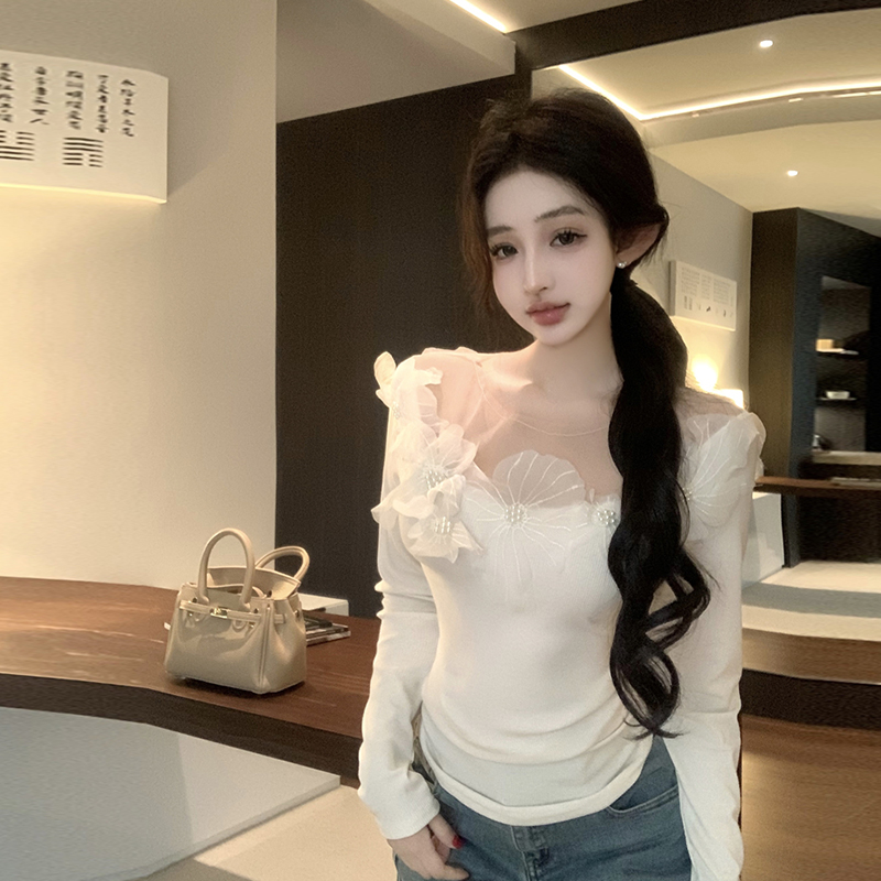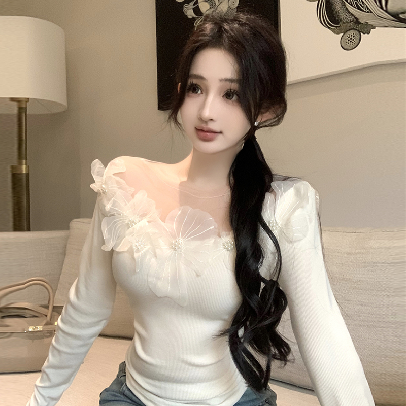 260克人棉蕾丝珍珠花边设计2025春秋修身打底衫女