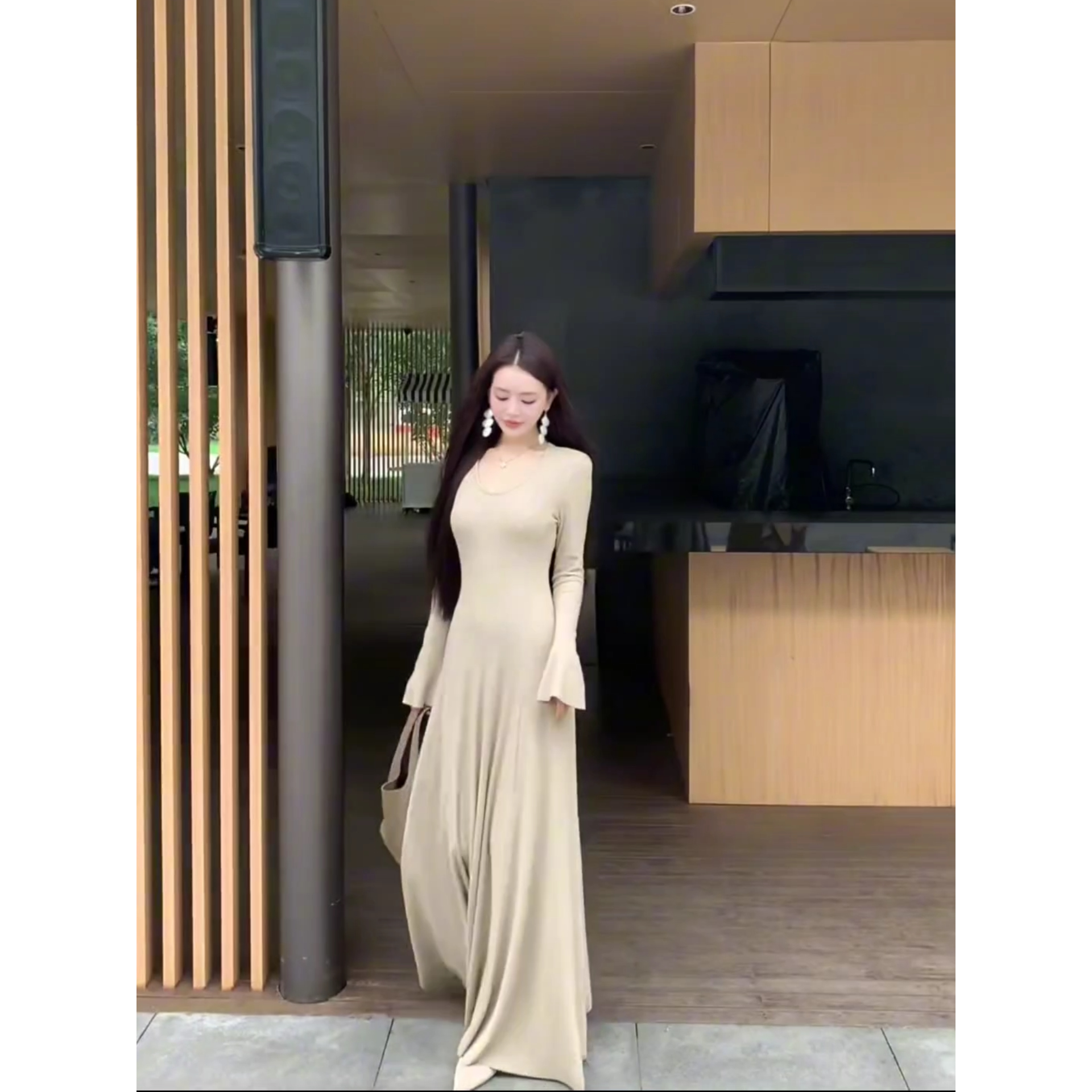 气质裙 v领喇叭袖坑条A摆连衣裙