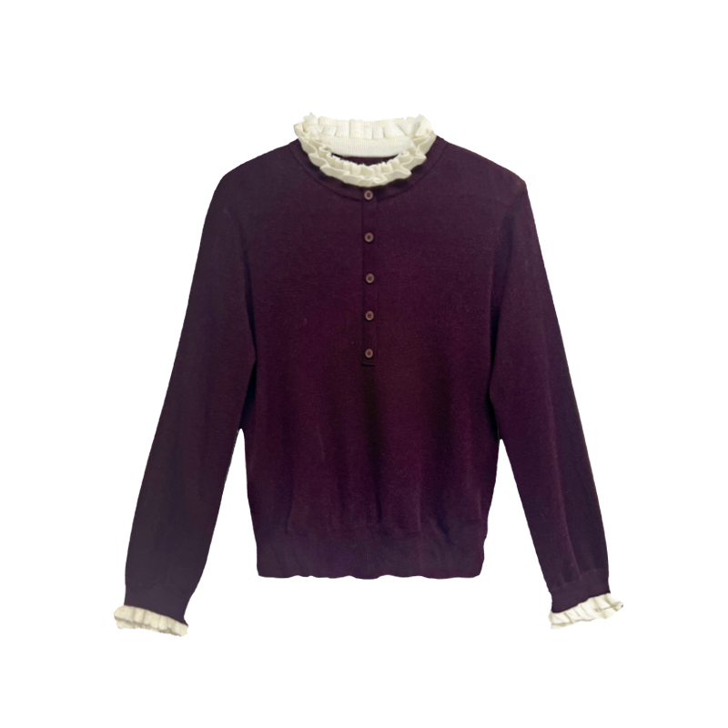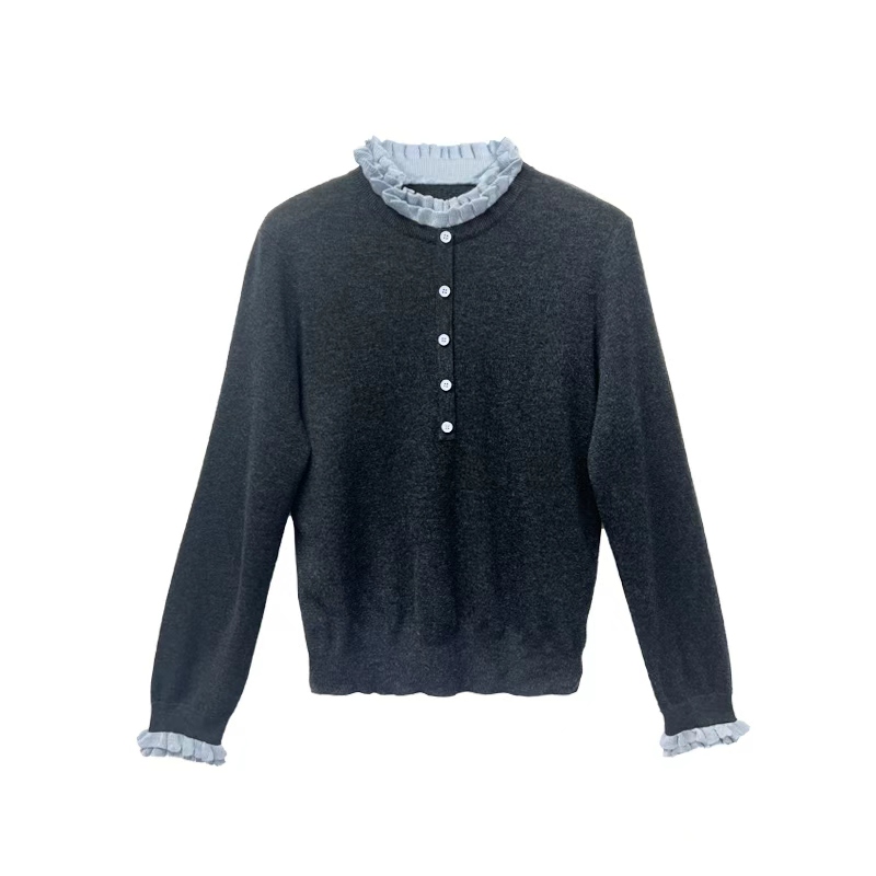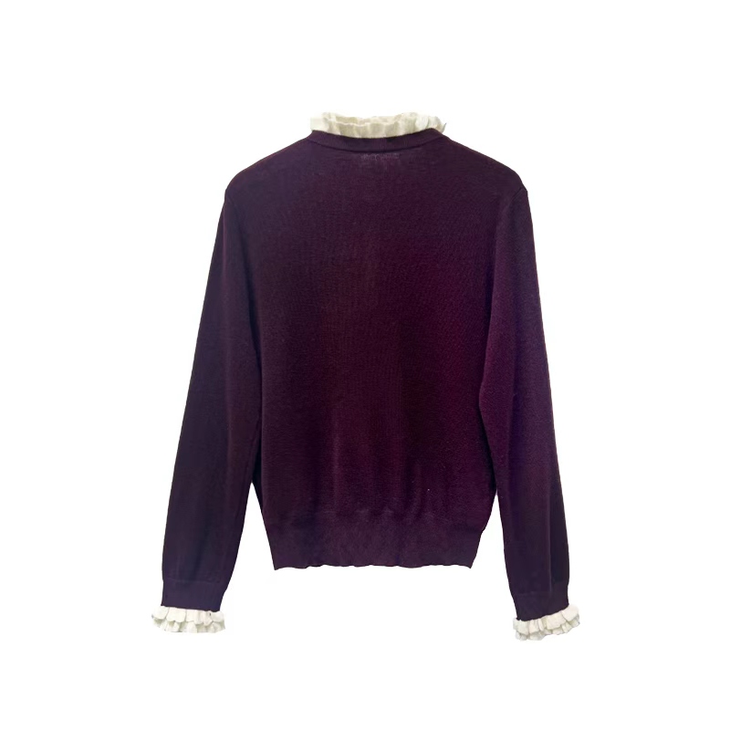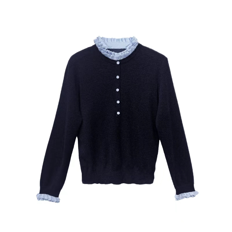 【橙庐】525826木耳边撞色假两件绵羊毛衫 春秋女气质时尚抗起球