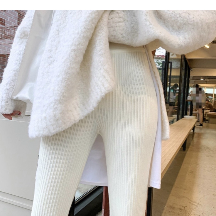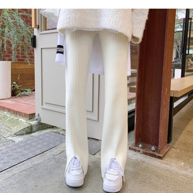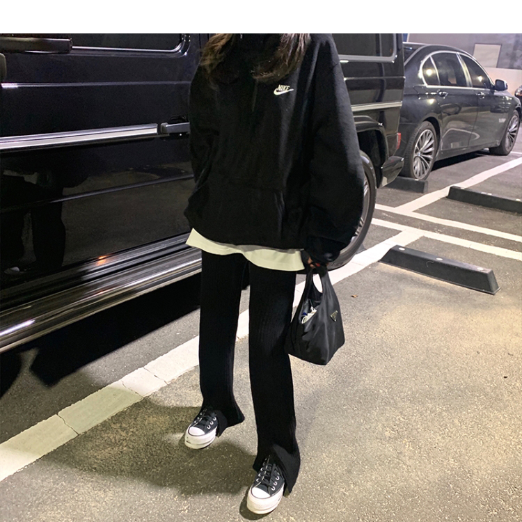 纯色竖条裤脚开衩松紧腰显瘦显腿长休闲裤