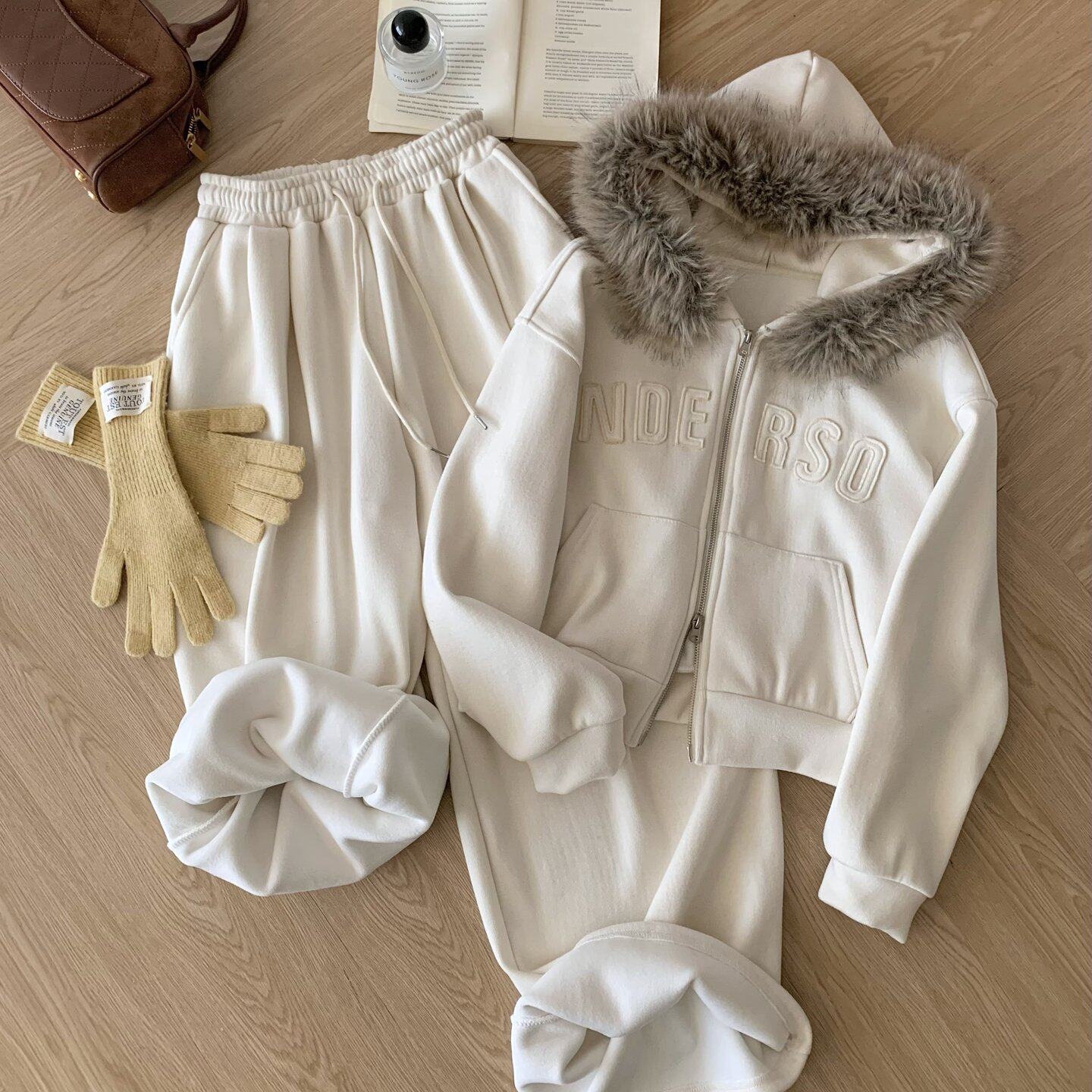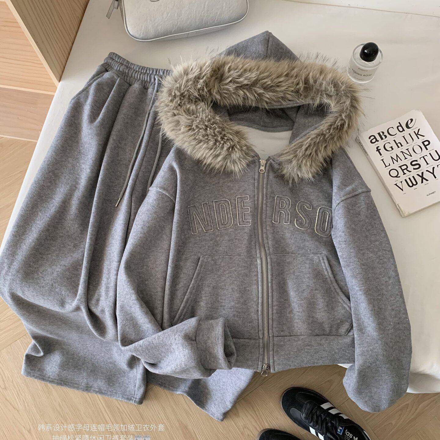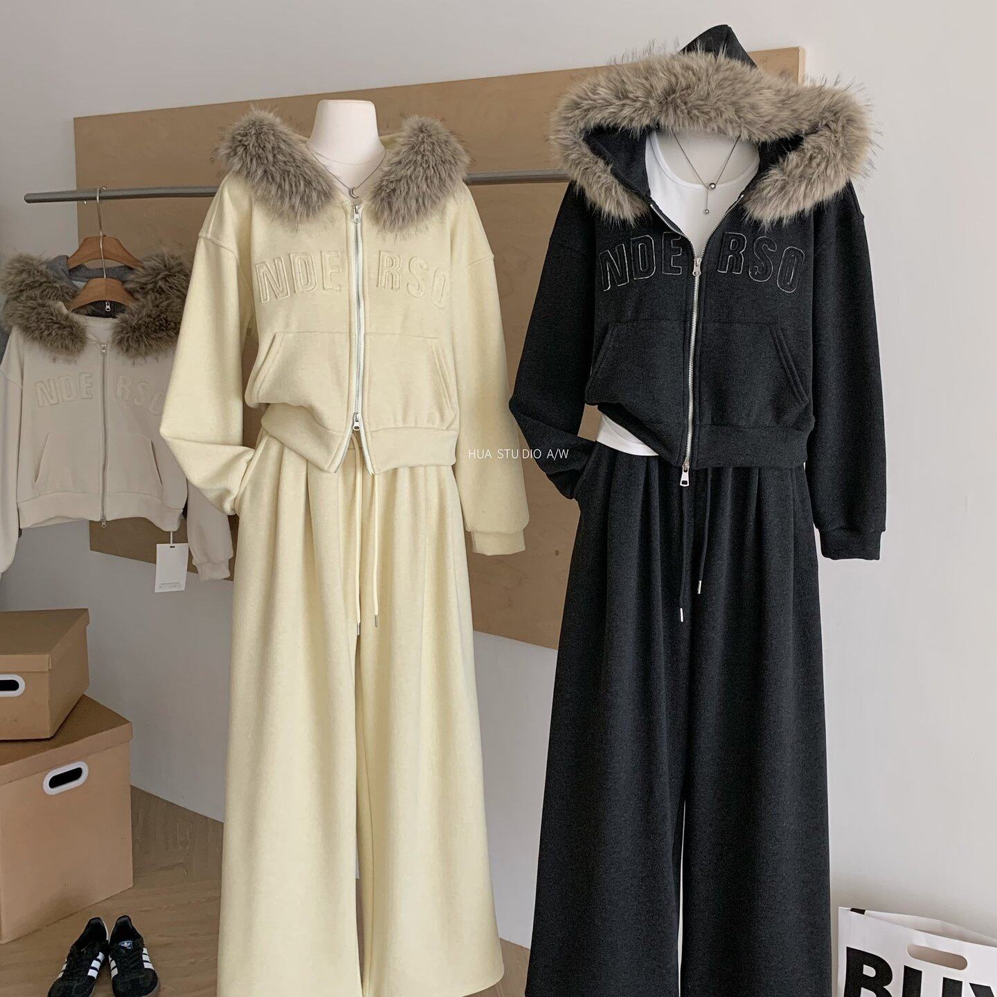 包邮韩系加绒卫衣套装可拆卸毛领开衫外套阔腿长裤两件套女秋