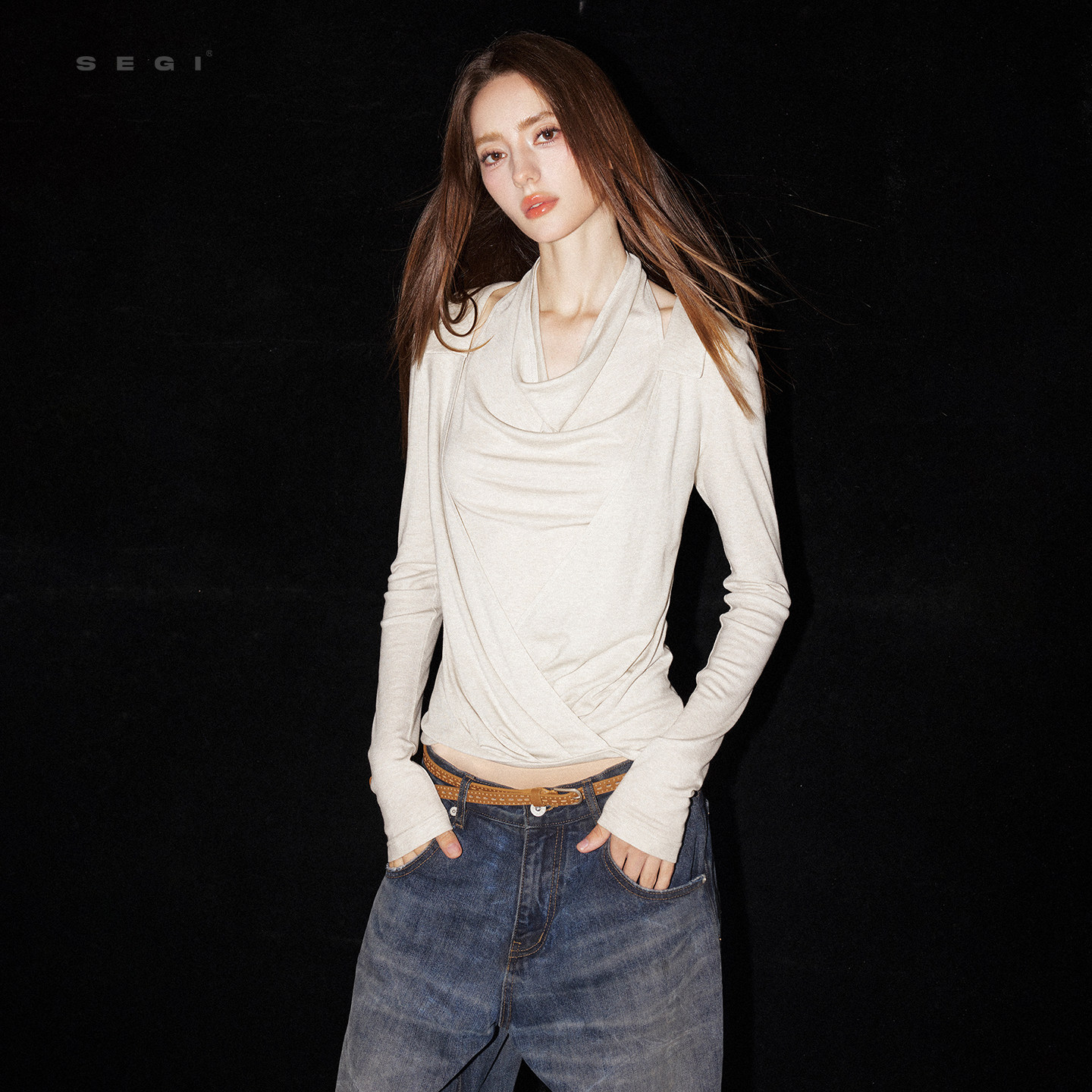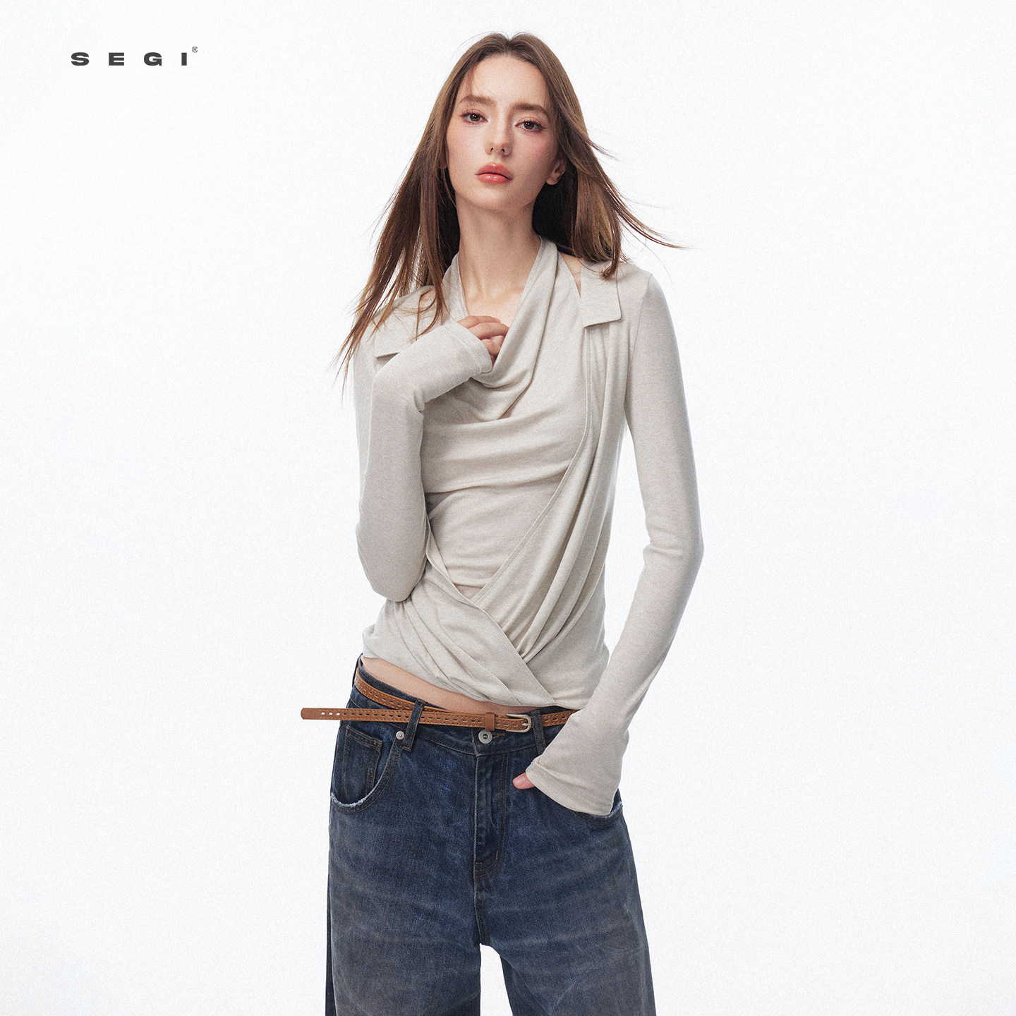 SEGI 原创设计早春新款天丝羊毛假两件荡领打底长袖女高级感上衣