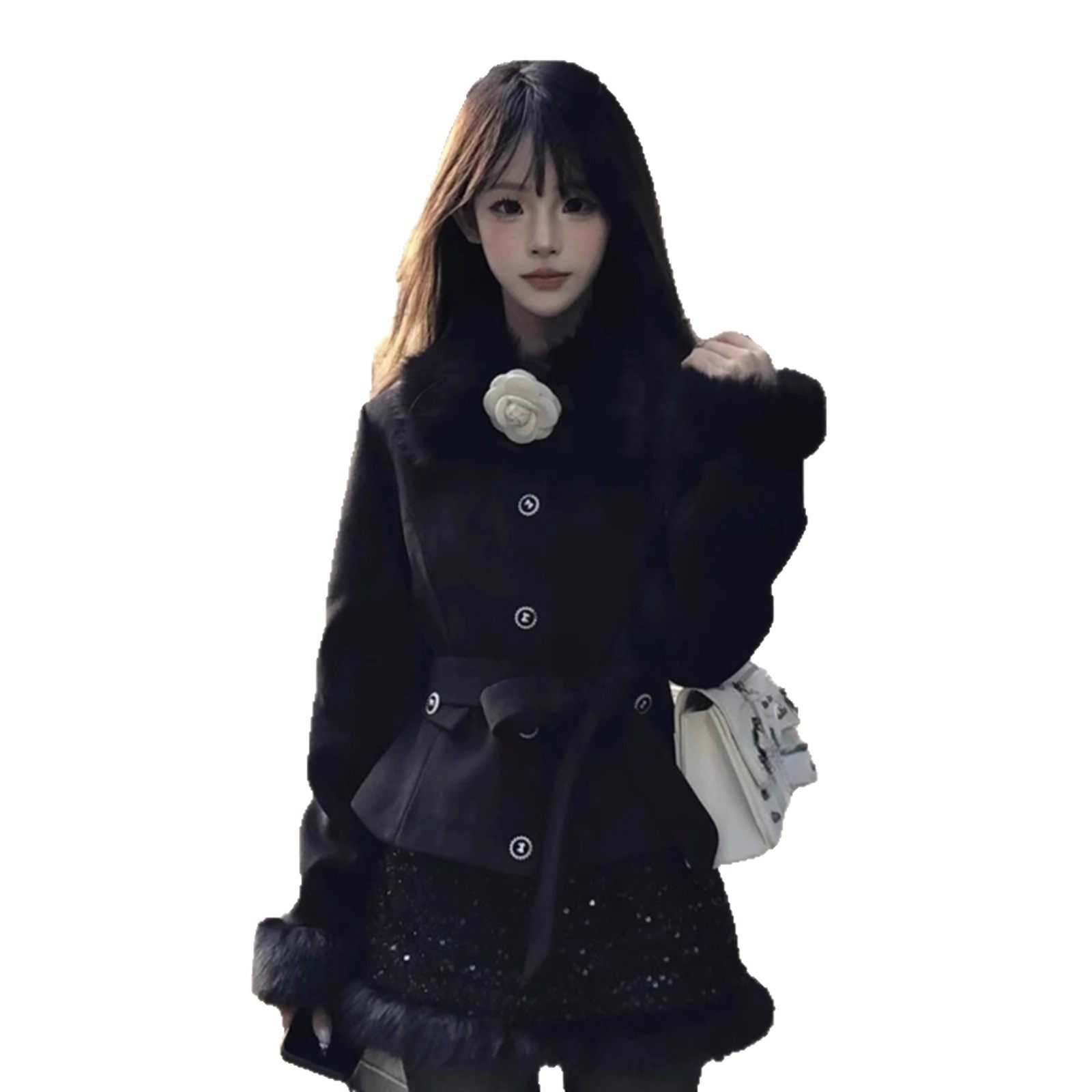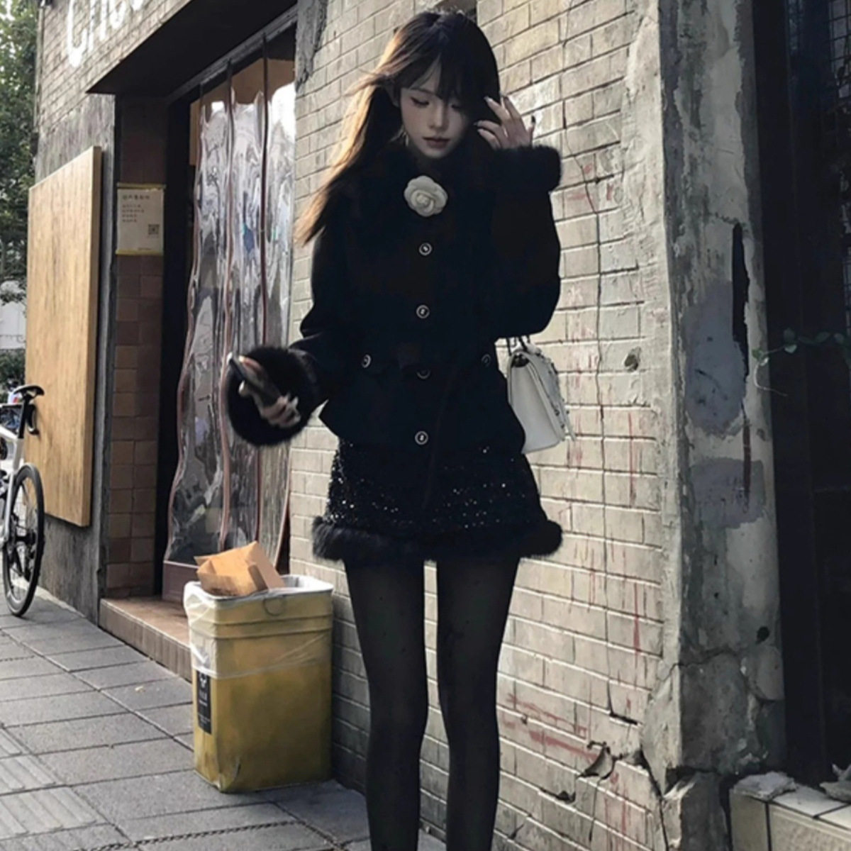 富家千金高级感法式气质加厚显瘦黑色毛领外套半身裙两件套装女冬