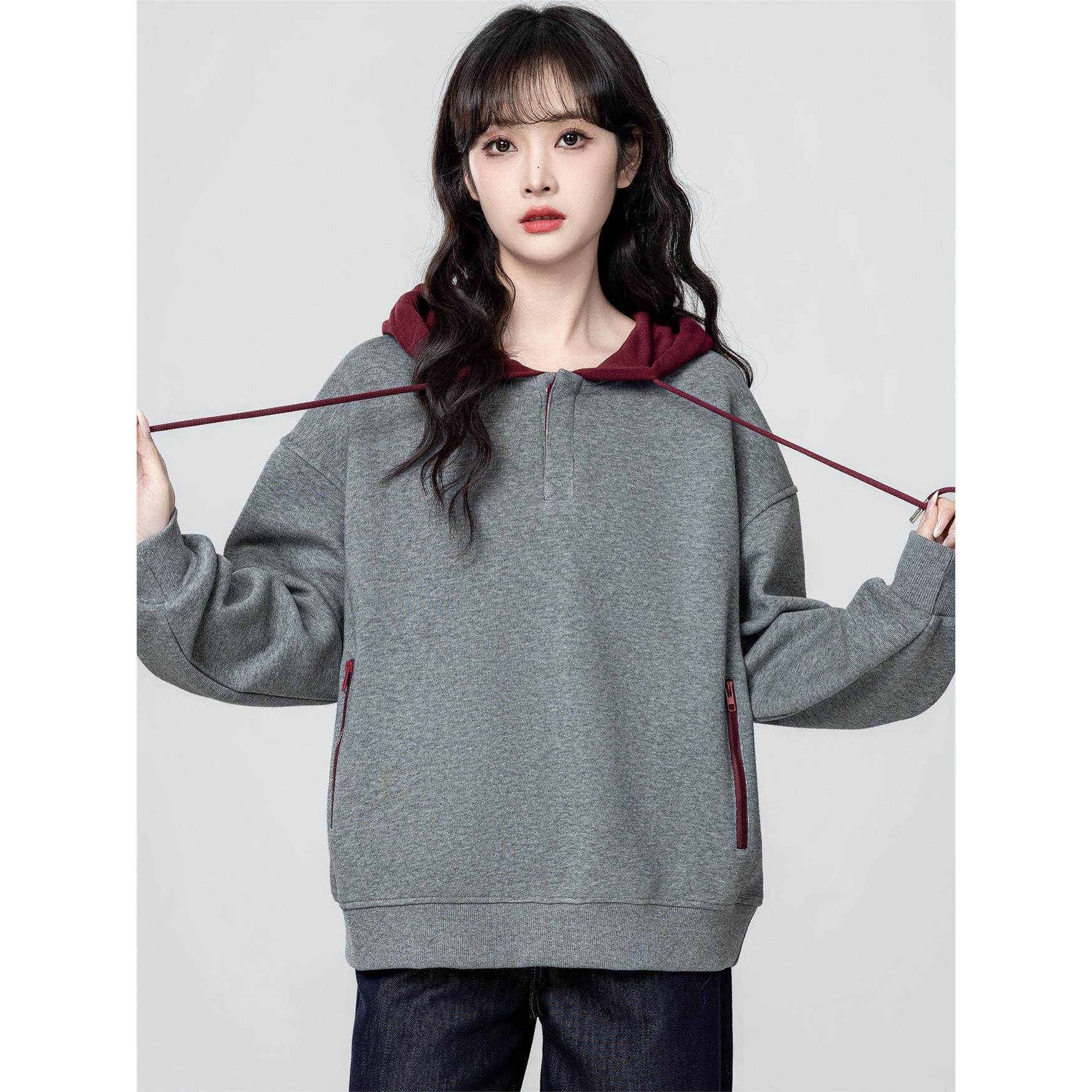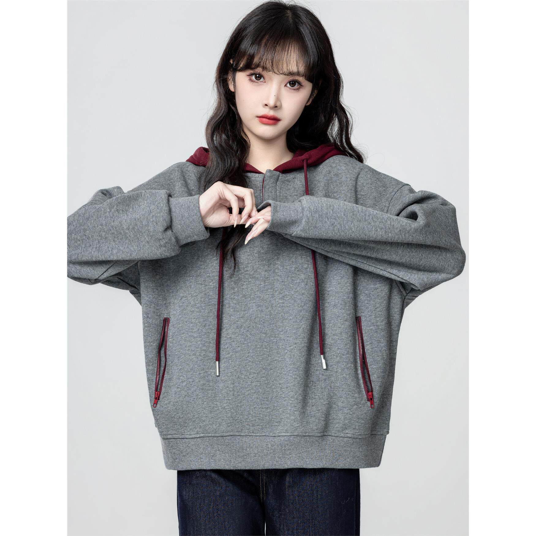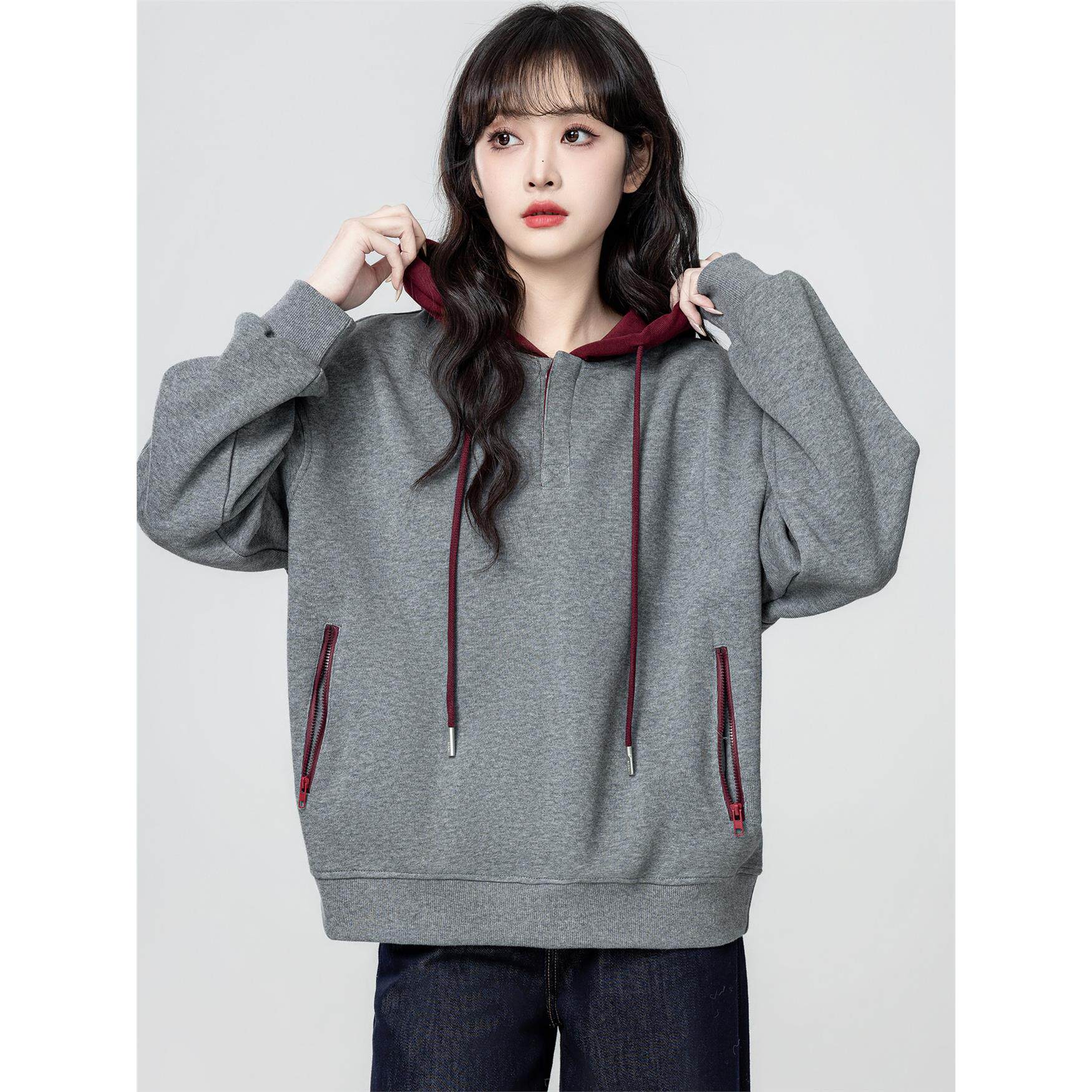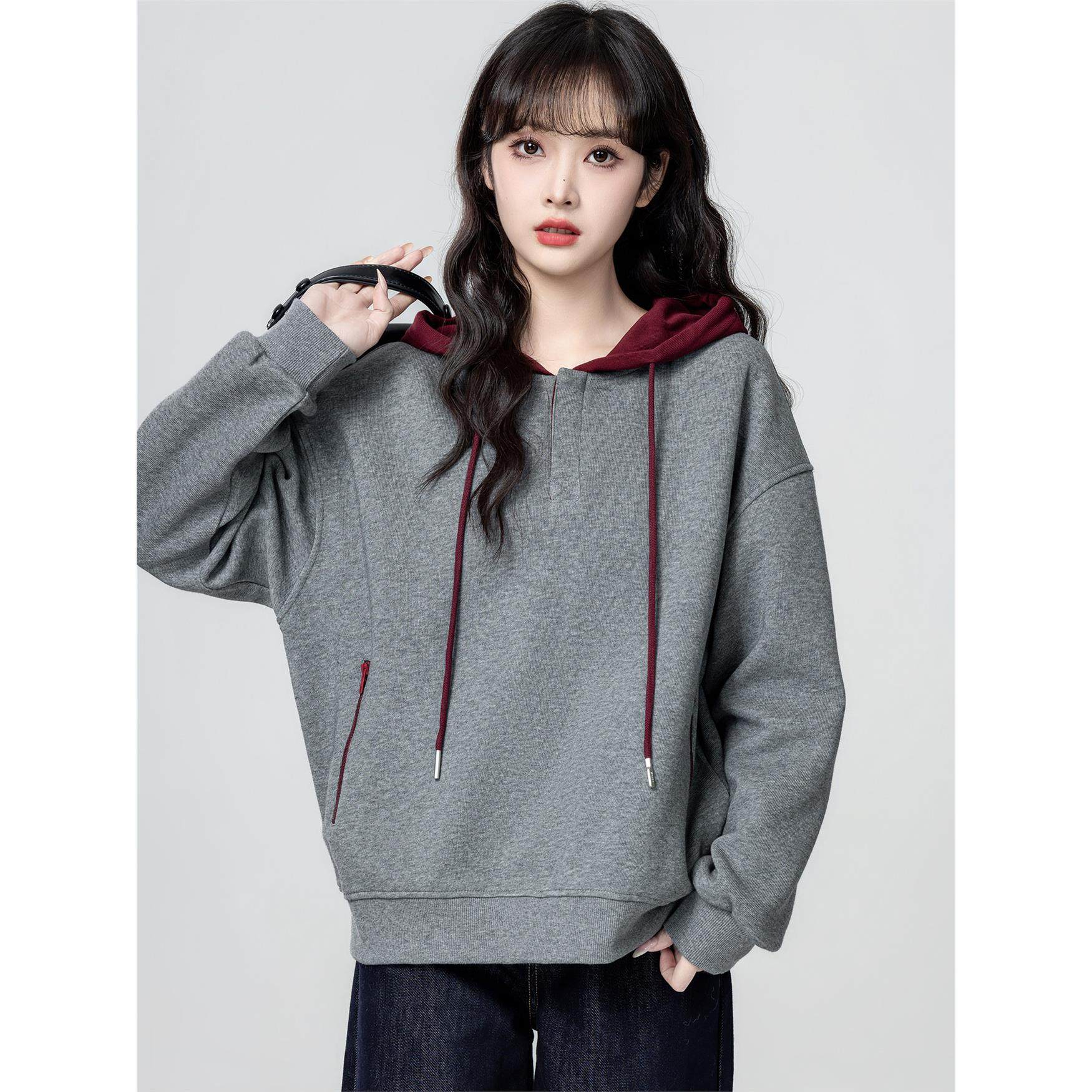 花灰色连帽卫衣女春秋2025秋季新款慵懒宽松学生套头带帽休闲上衣