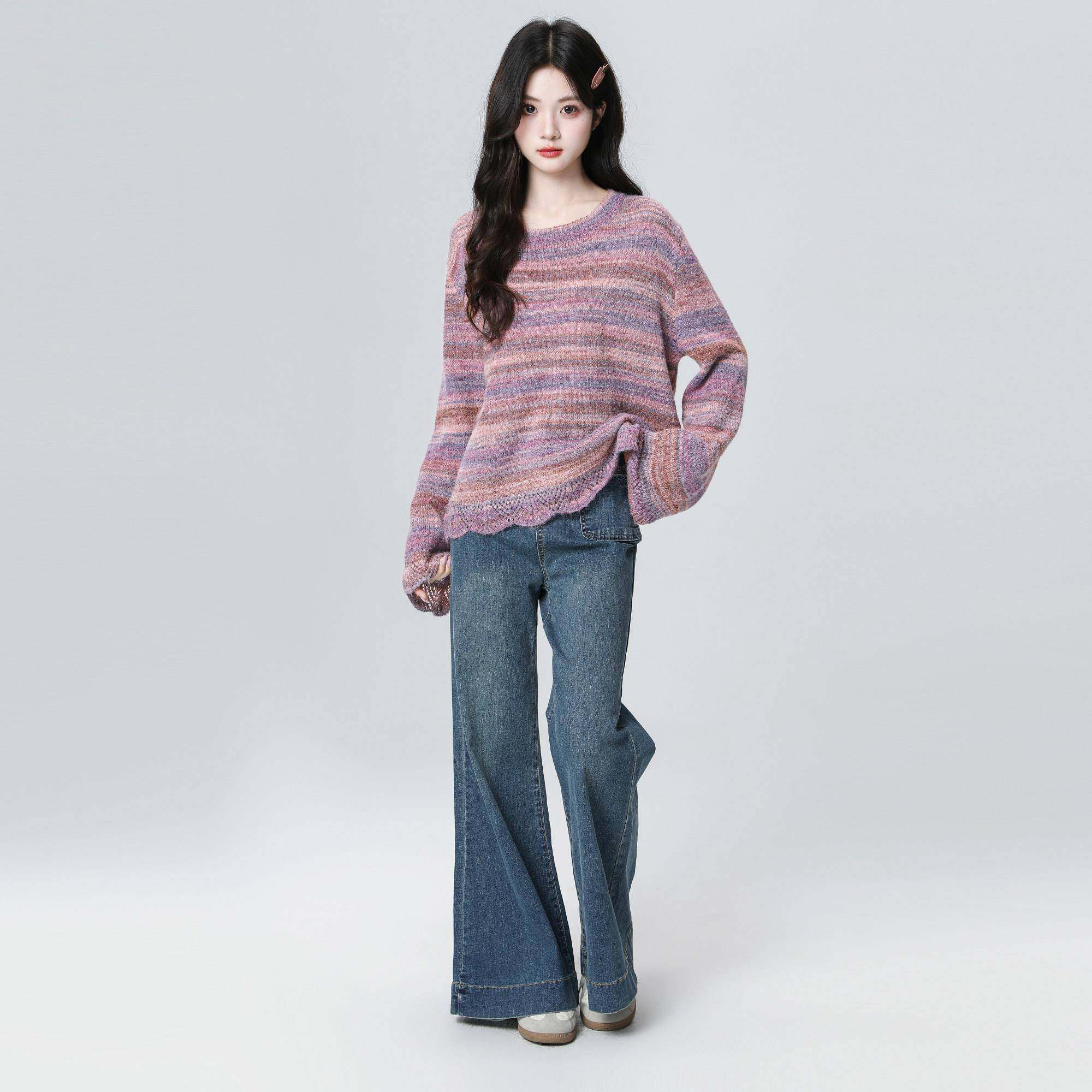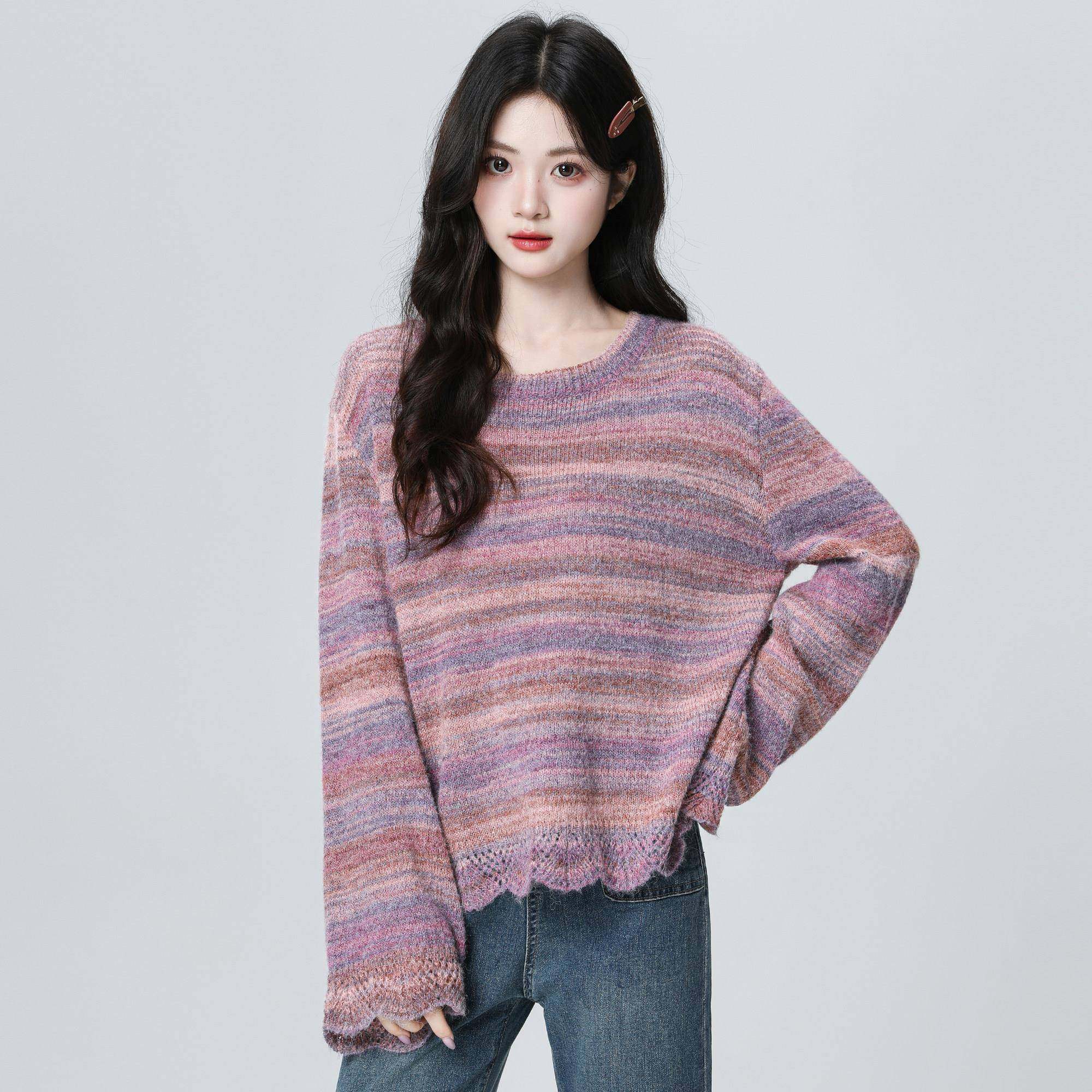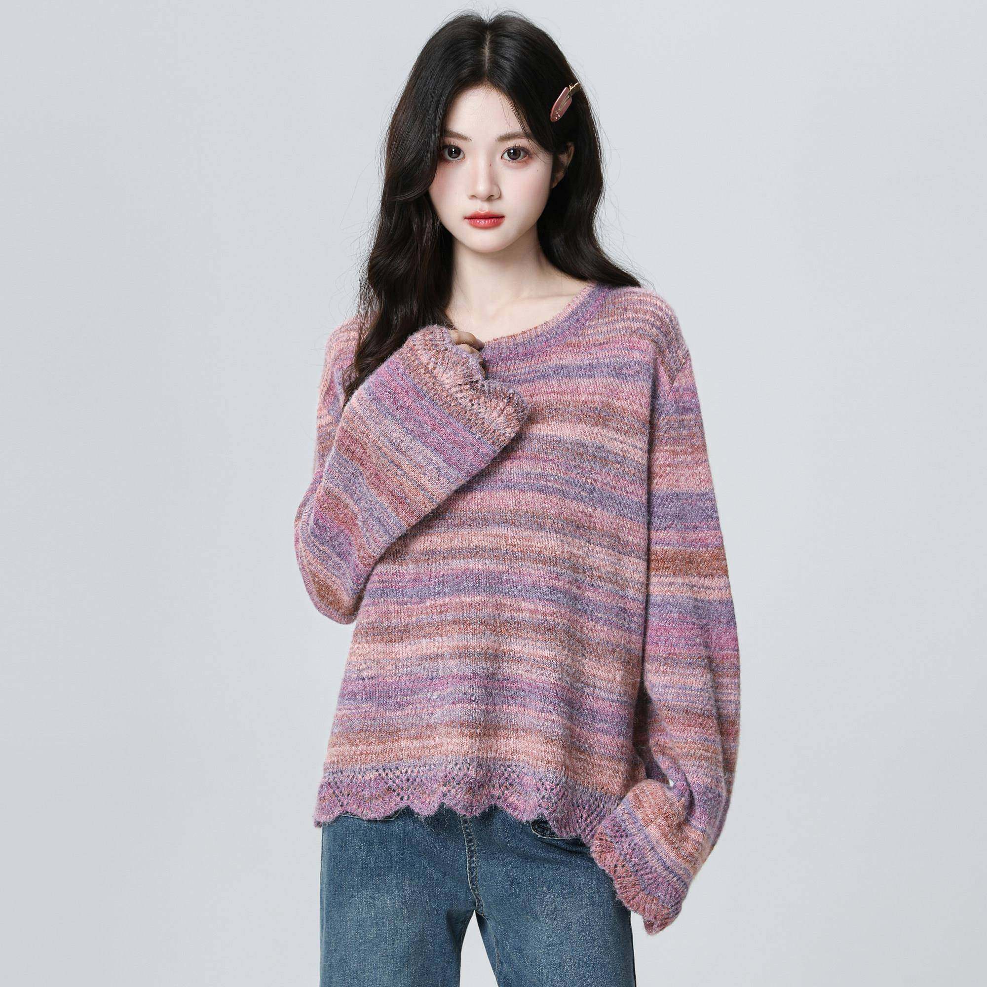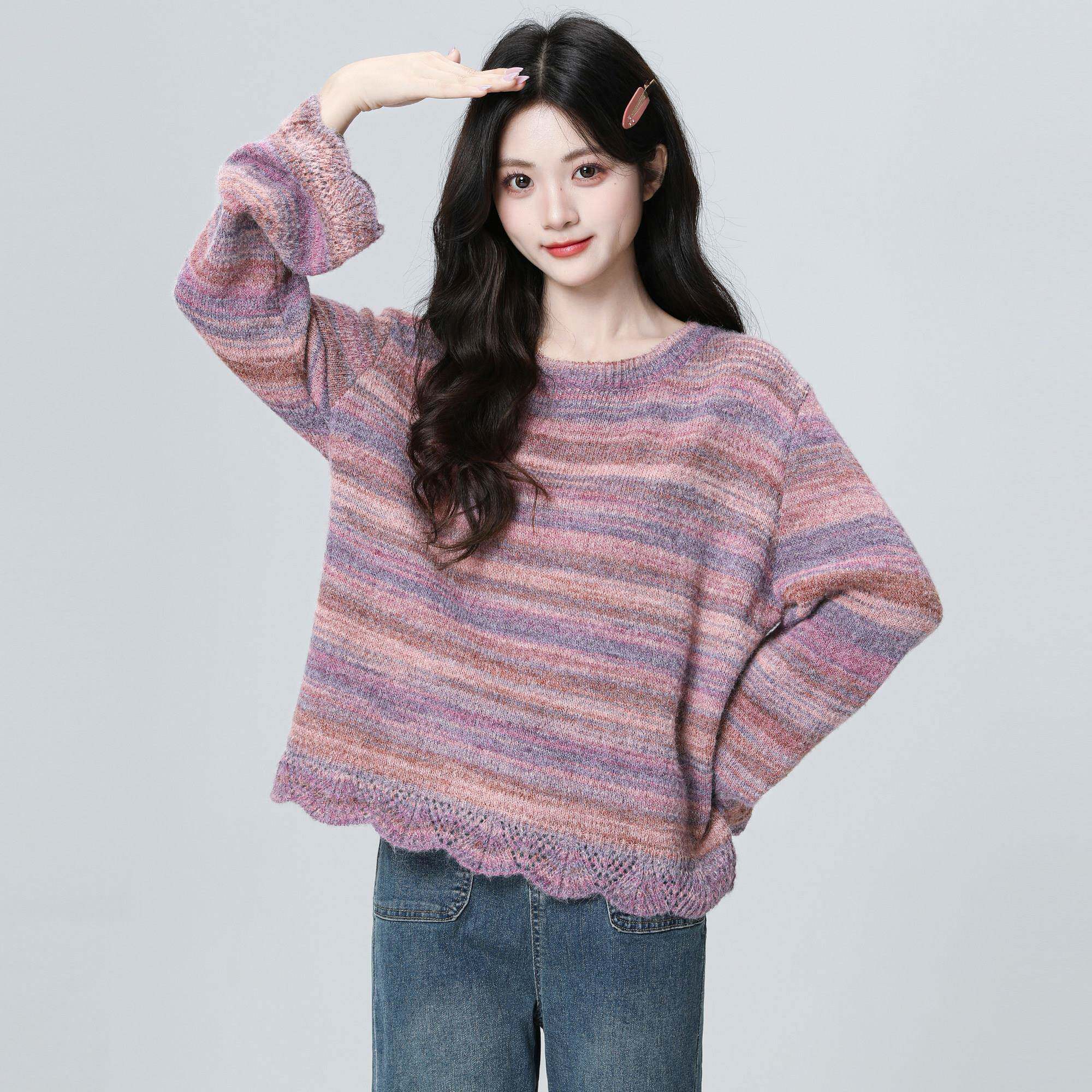 紫色条纹圆领针织衫女春秋2025秋新款复古宽松慵懒风软糯毛衣上衣