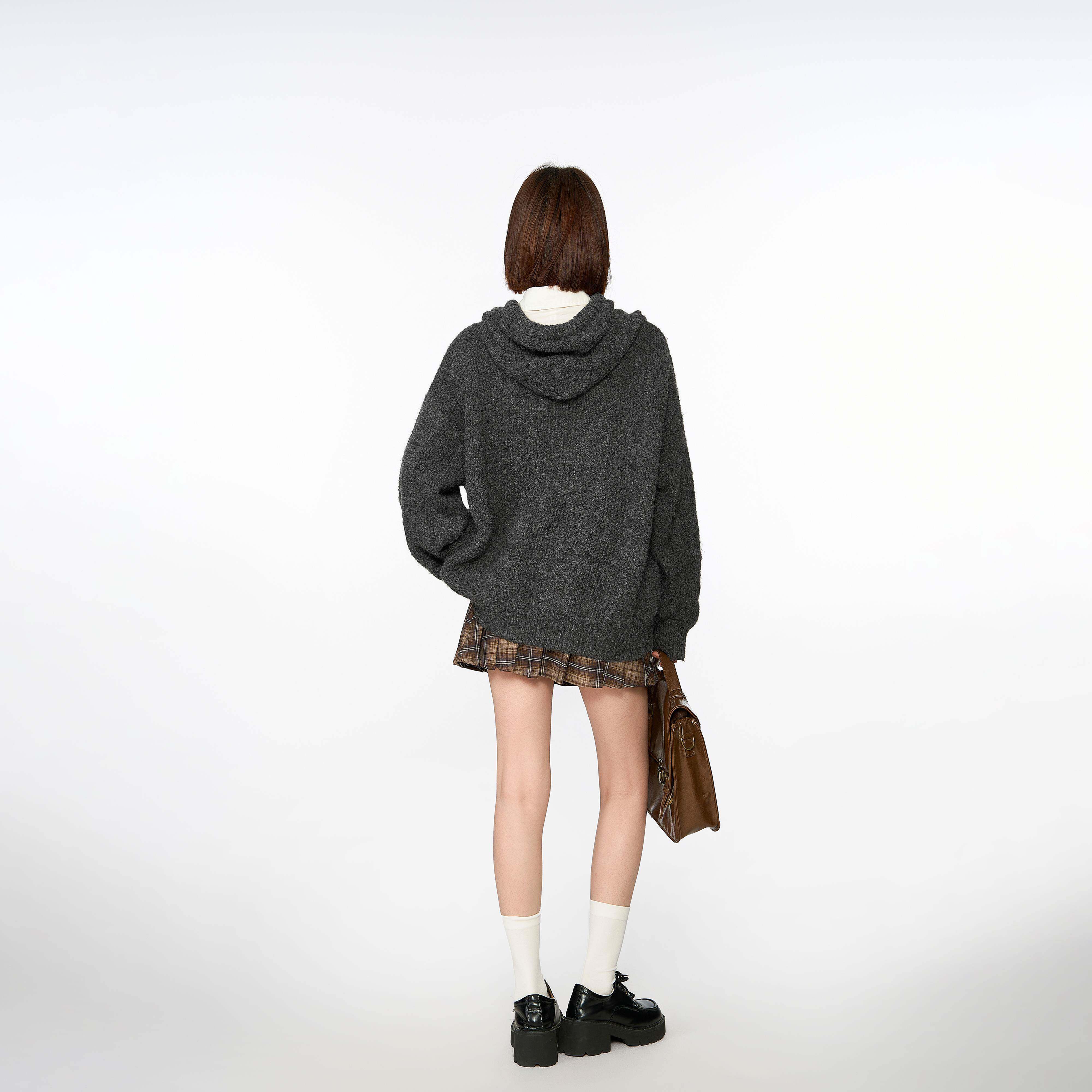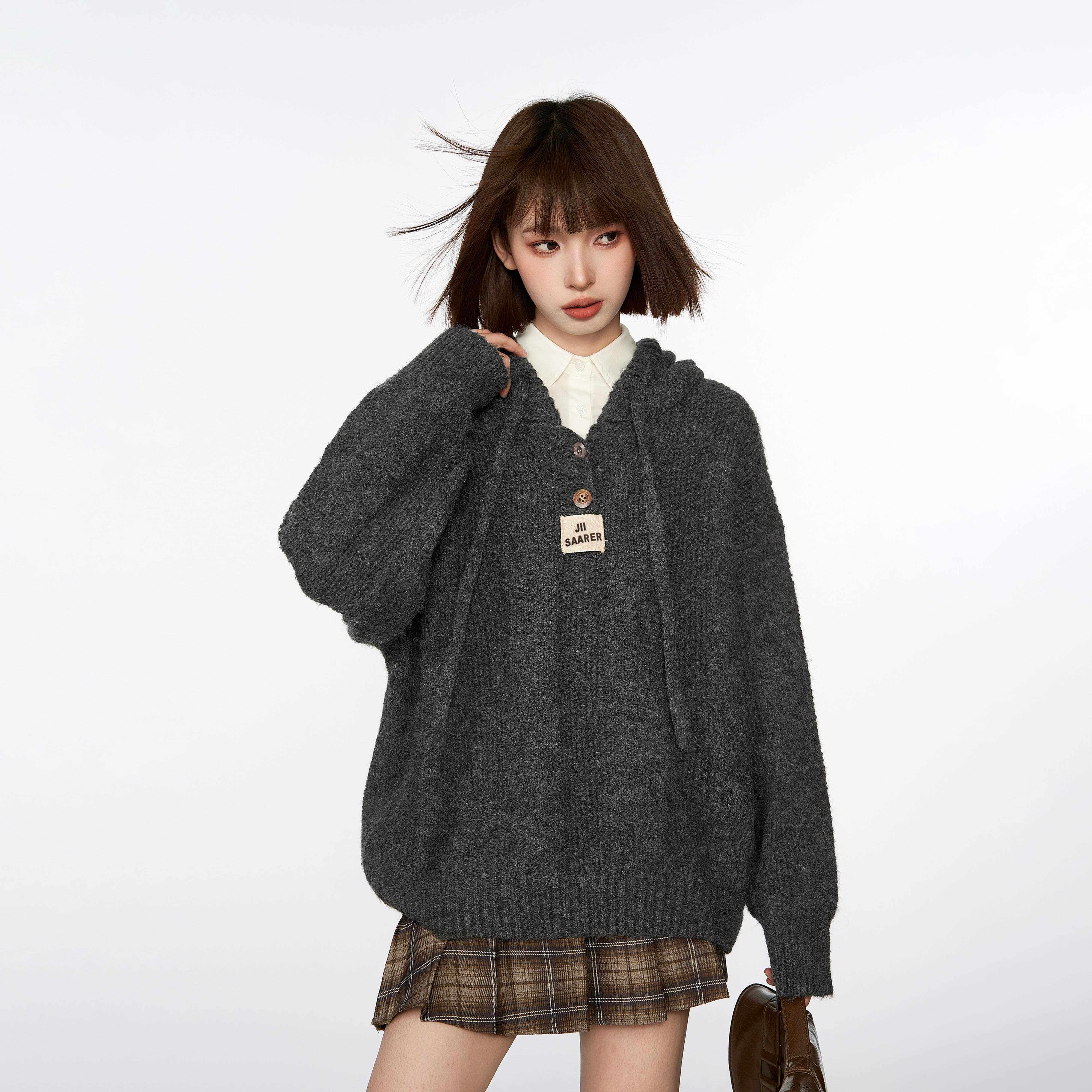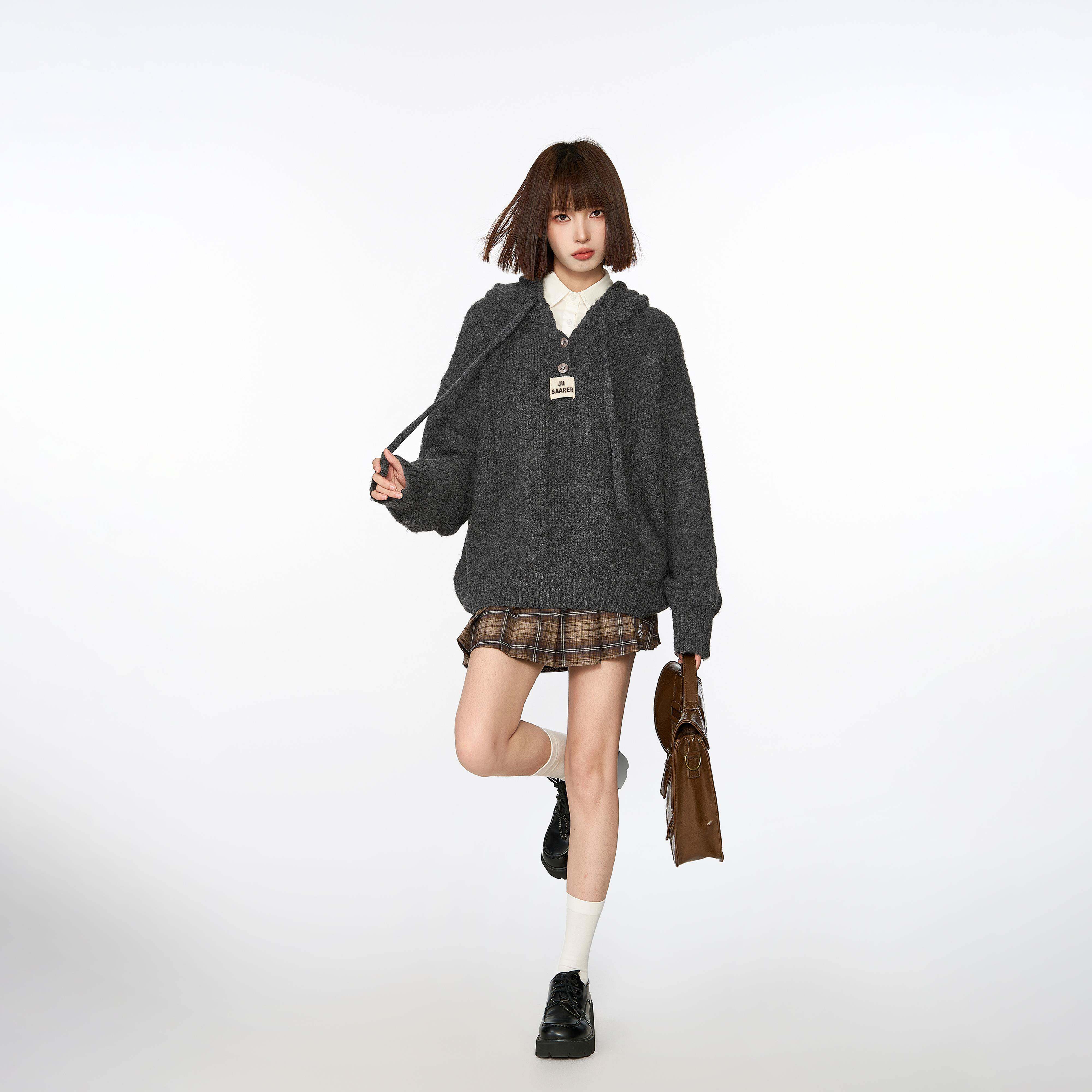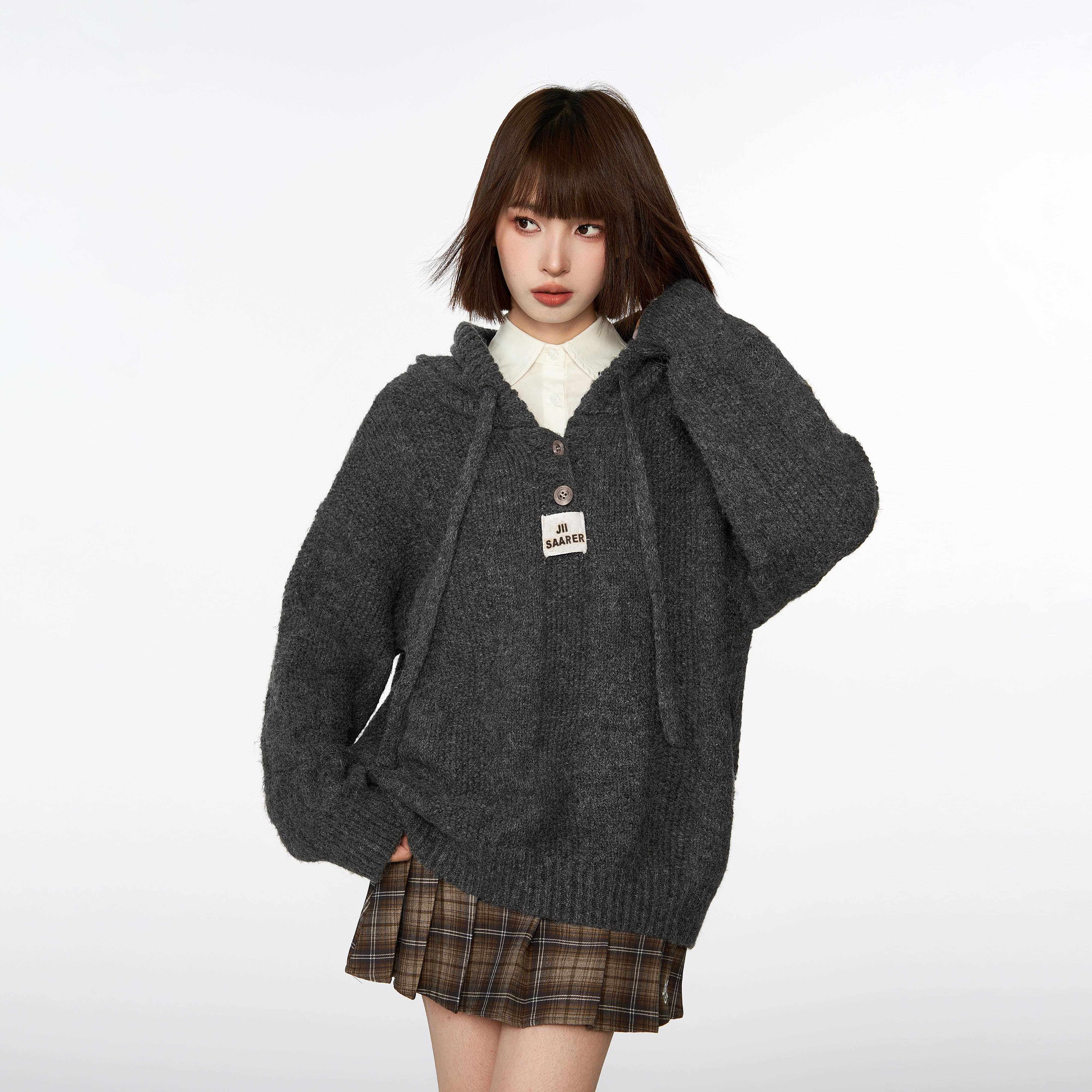 灰色连帽套头针织毛衣女秋冬冬季宽松韩系慵懒风加厚上衣卫衣外套