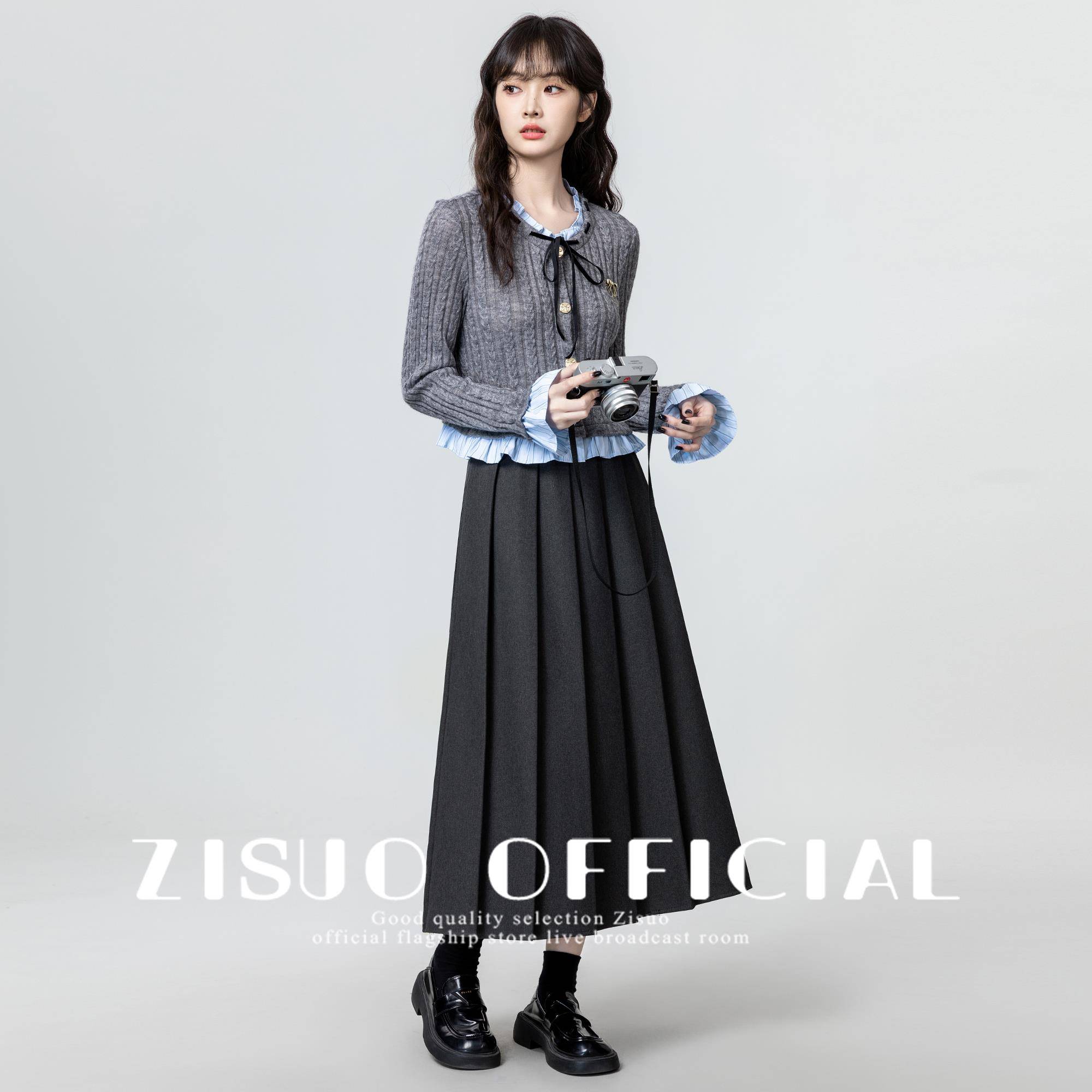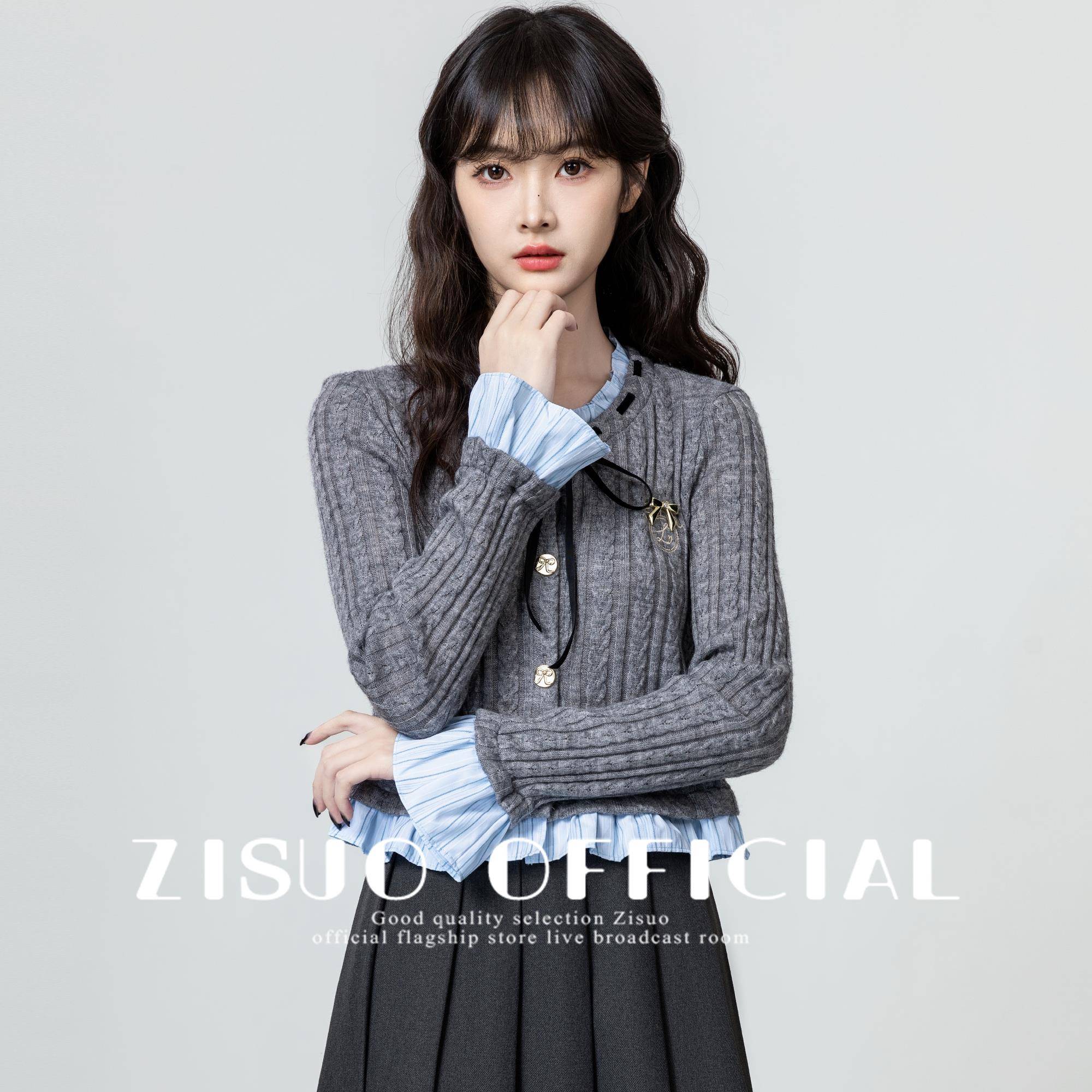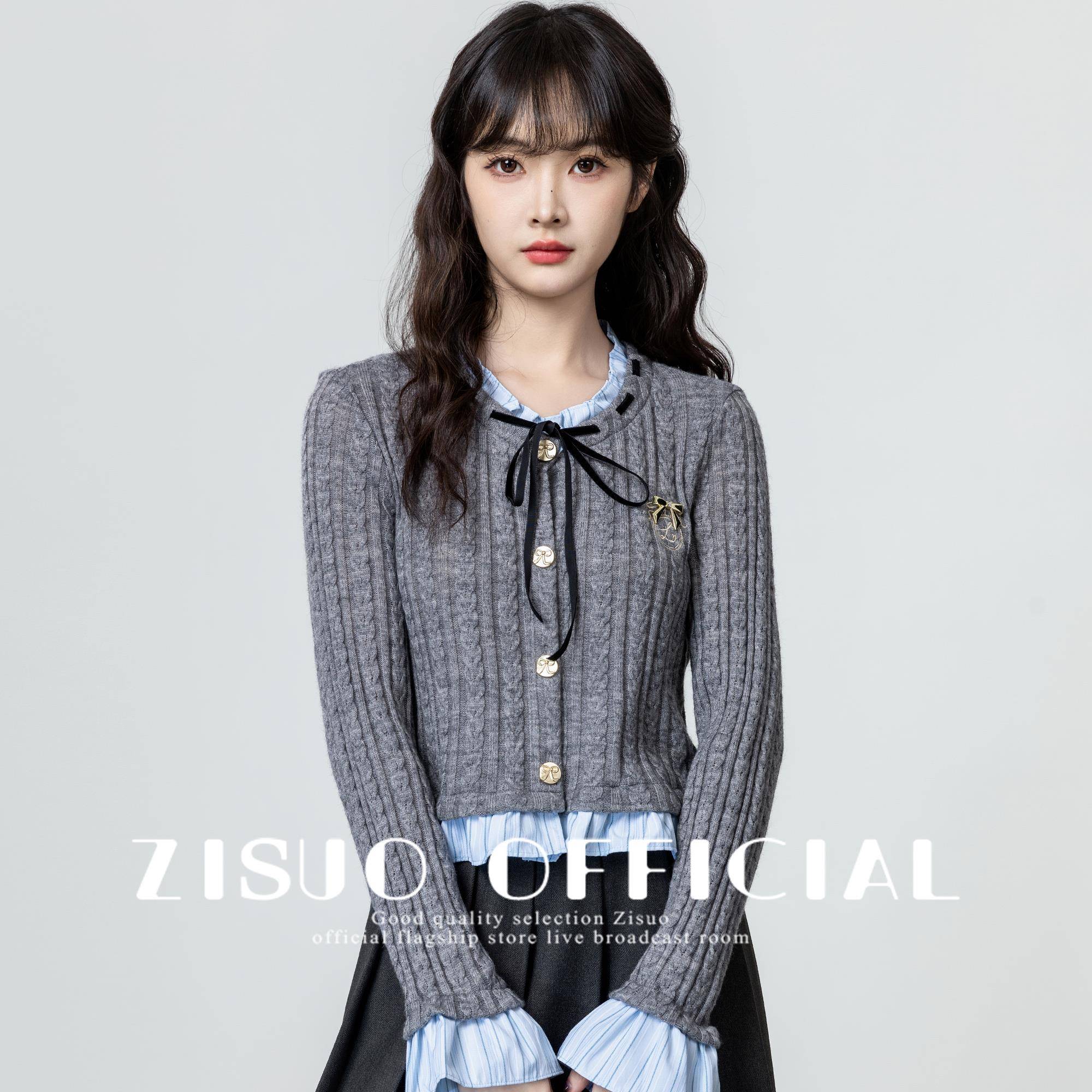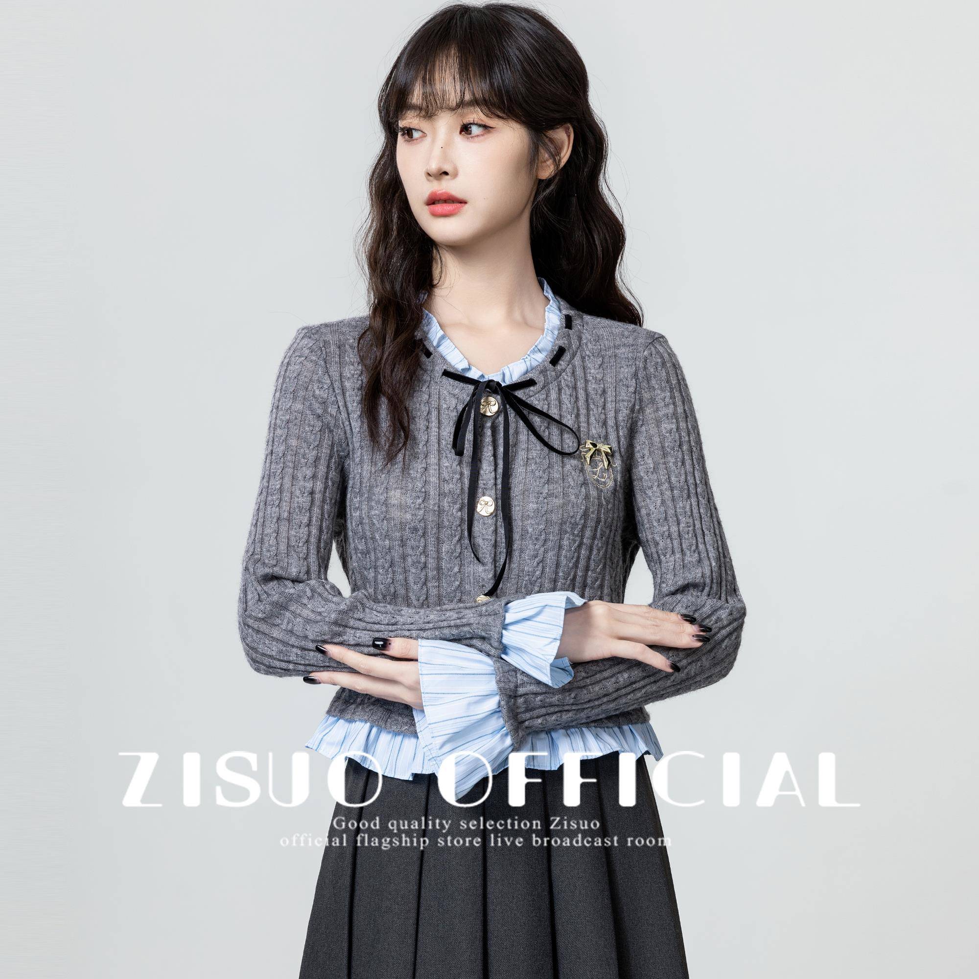 灰色假两件针织开衫女2025春秋新款学院风木耳边拼接显瘦短款上衣