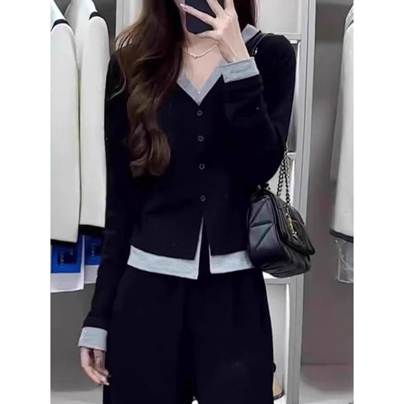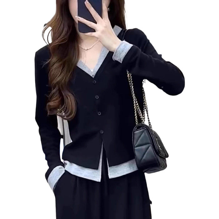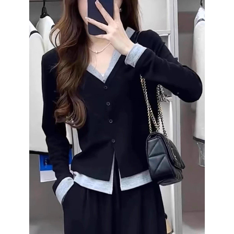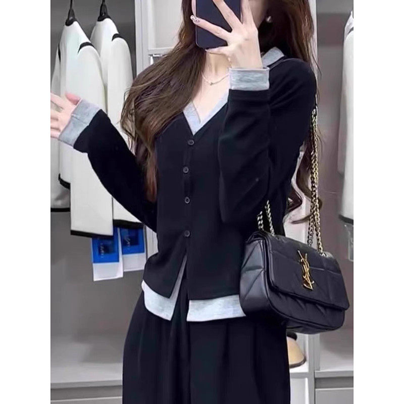 大尺码女装假两件T恤单排扣修身遮肉显瘦早秋款2025胖妹妹百搭上
