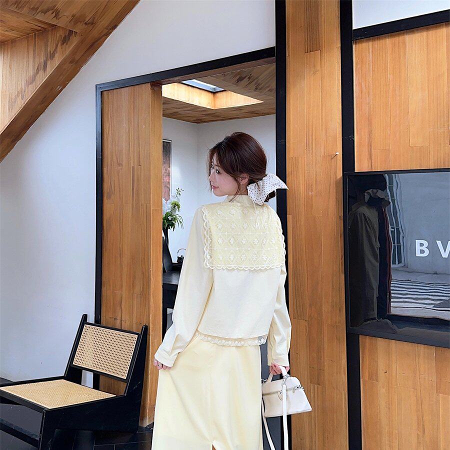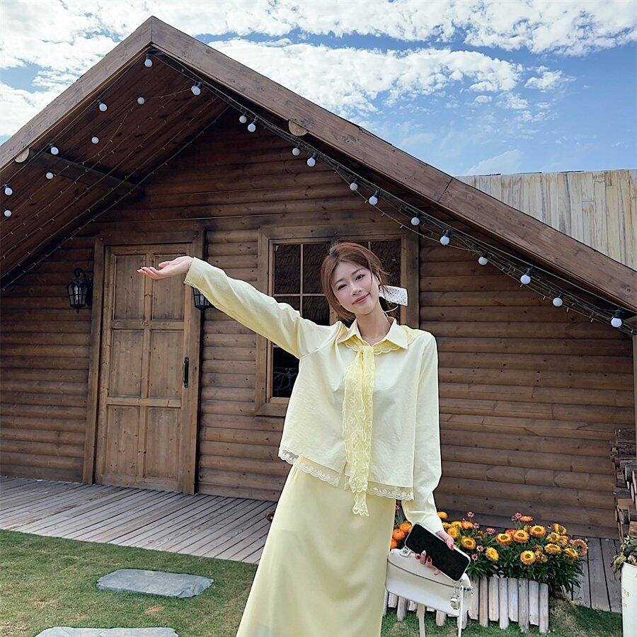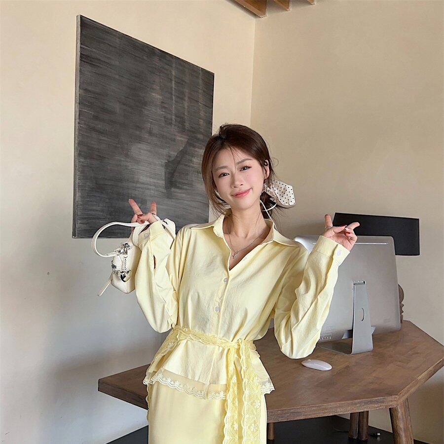 实拍实价开春季设计感穿搭2025年新款法式黄色蕾丝衬衫连衣裙子女