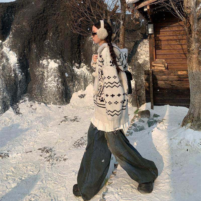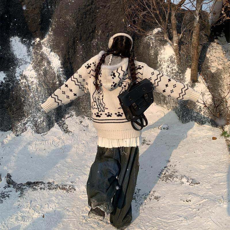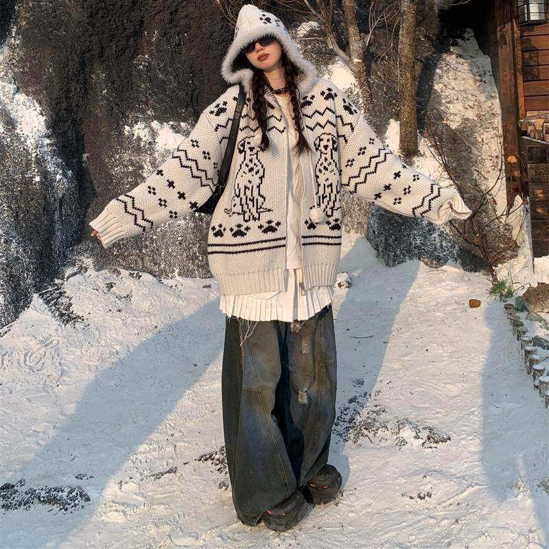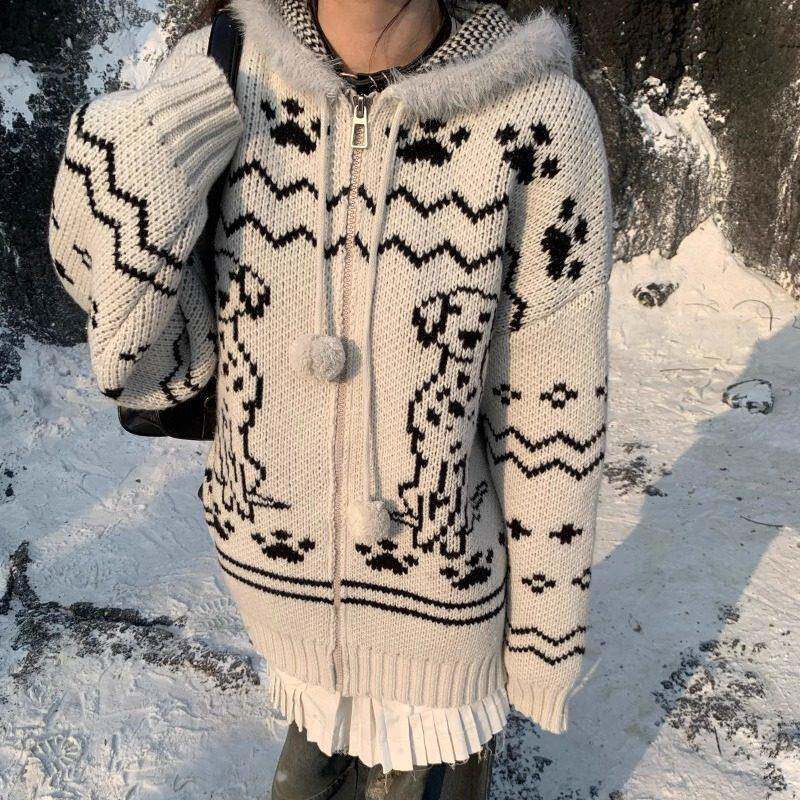 1拉98布丁 美复毛古斑点LGK狗提花连帽衣外套女秋冬设计式感链针