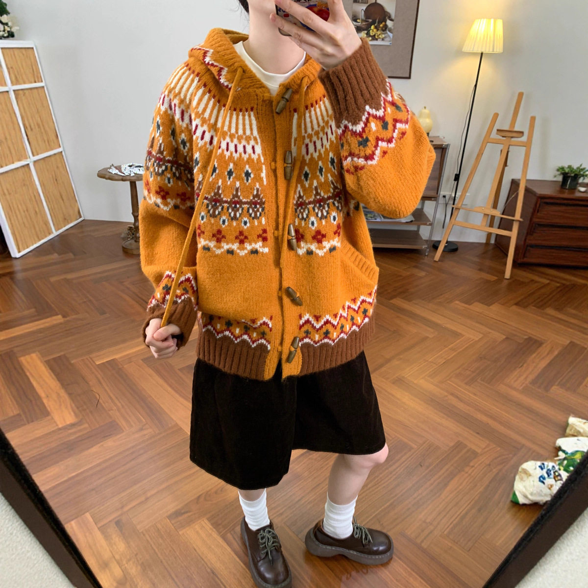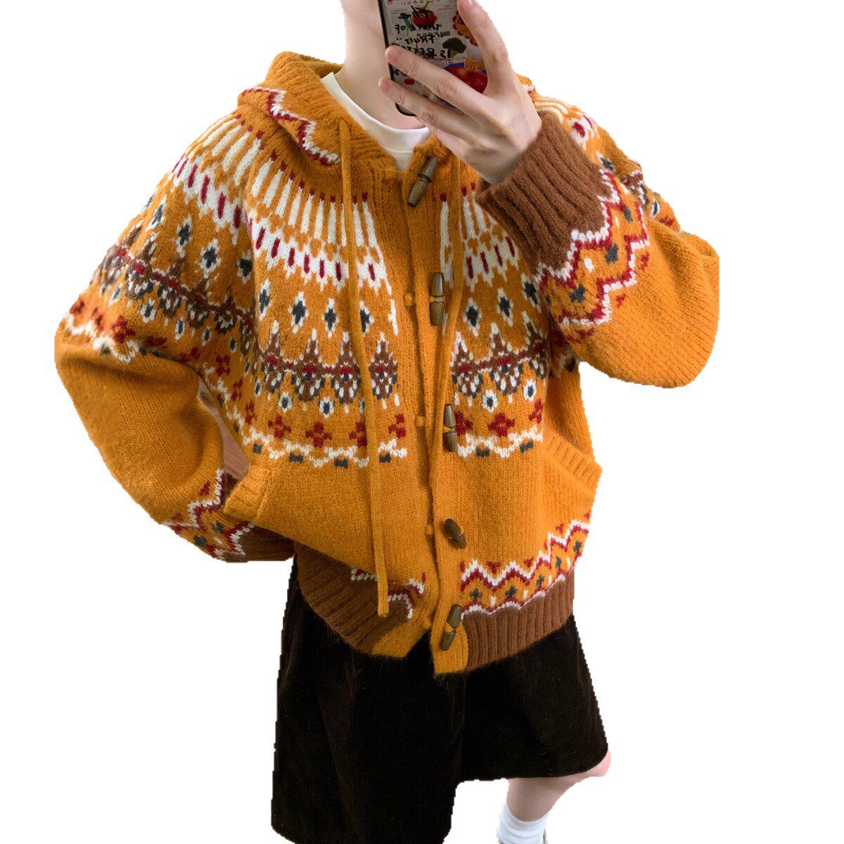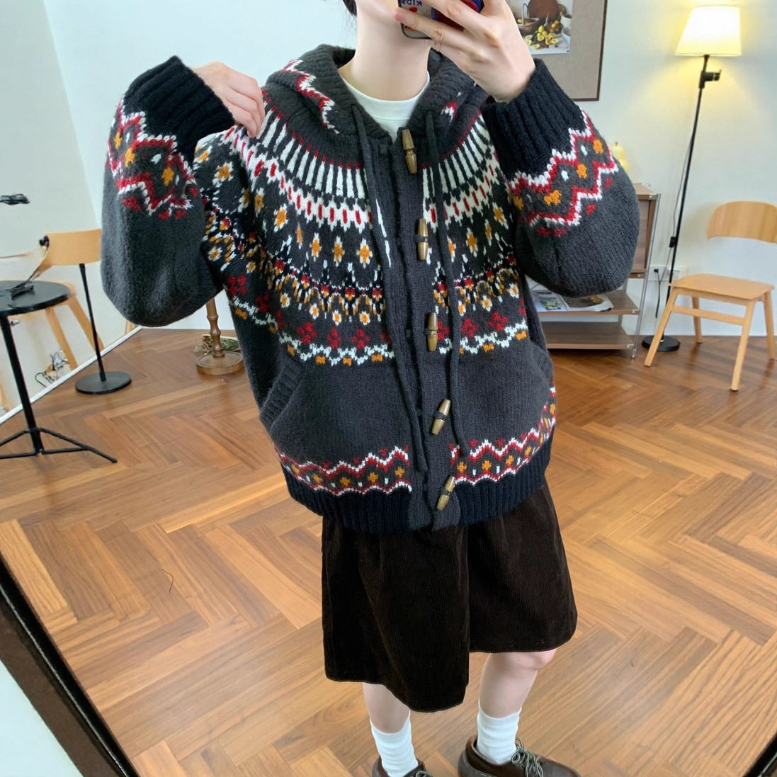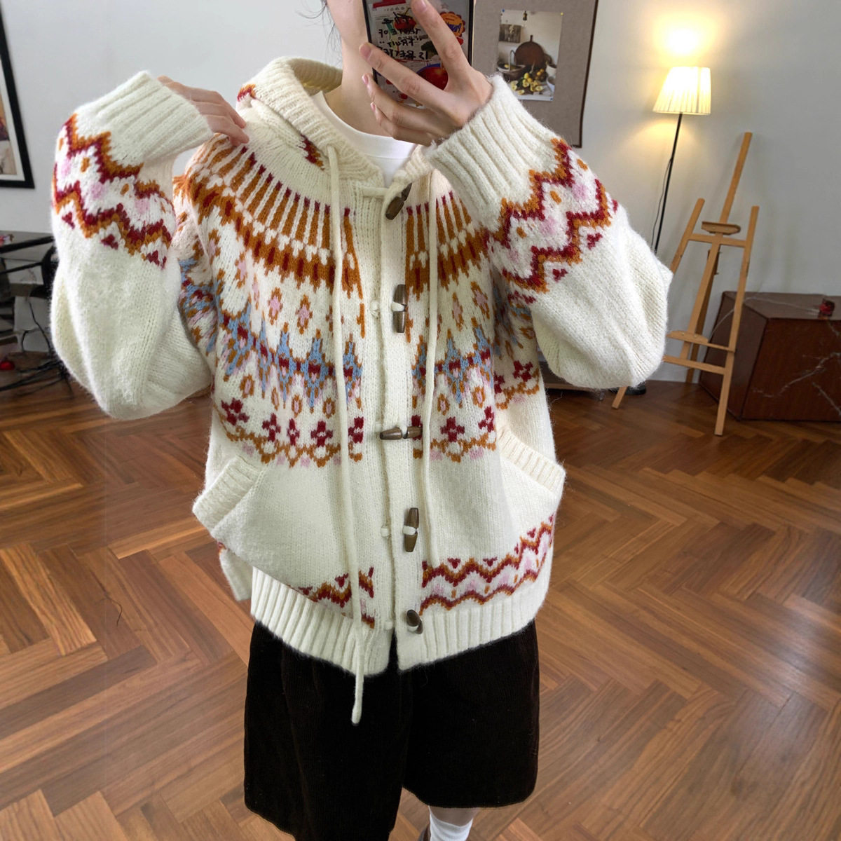 韩系复古提花牛角扣费尔岛毛衣外套女宽松秋冬新款连帽针织开衫厚
