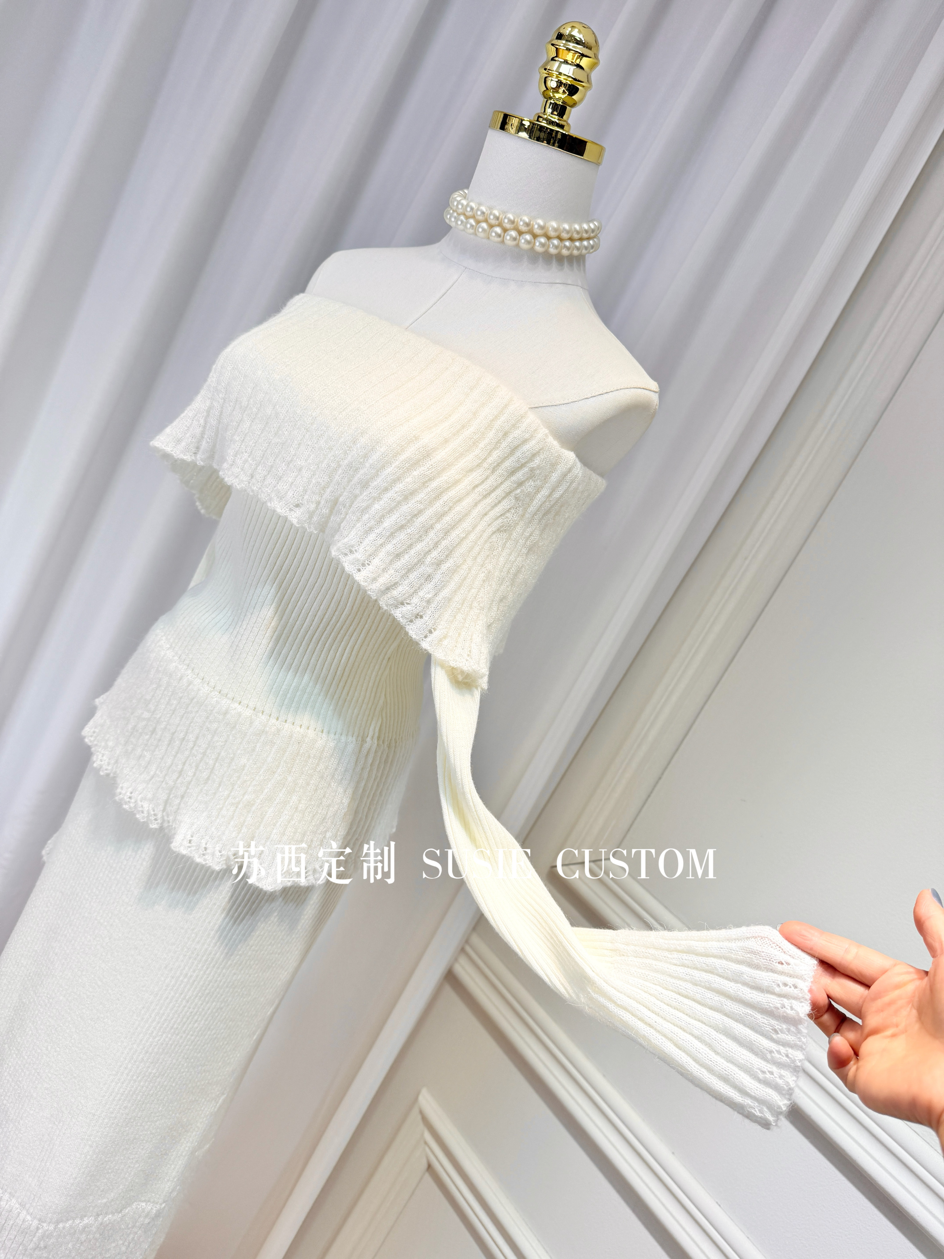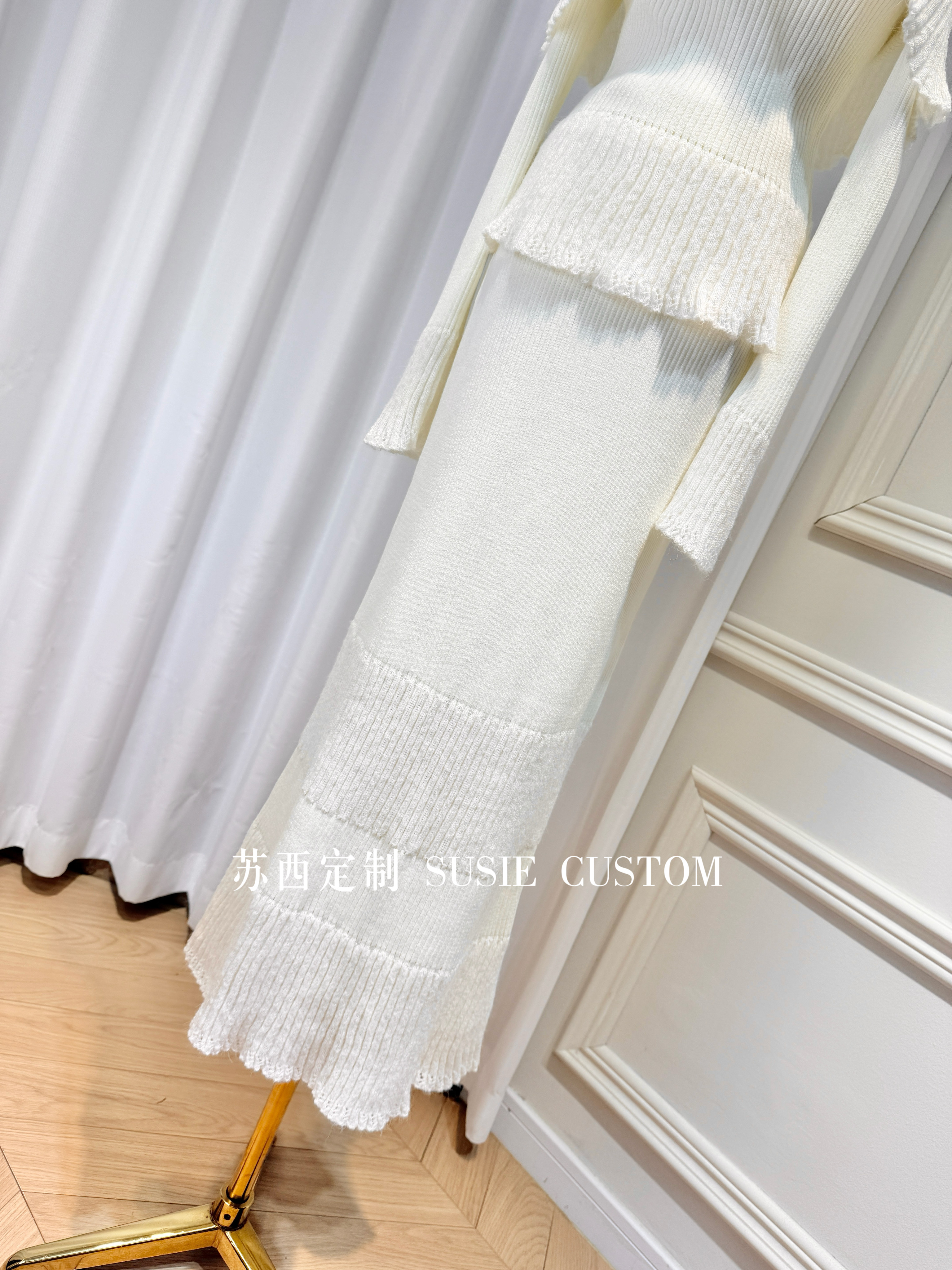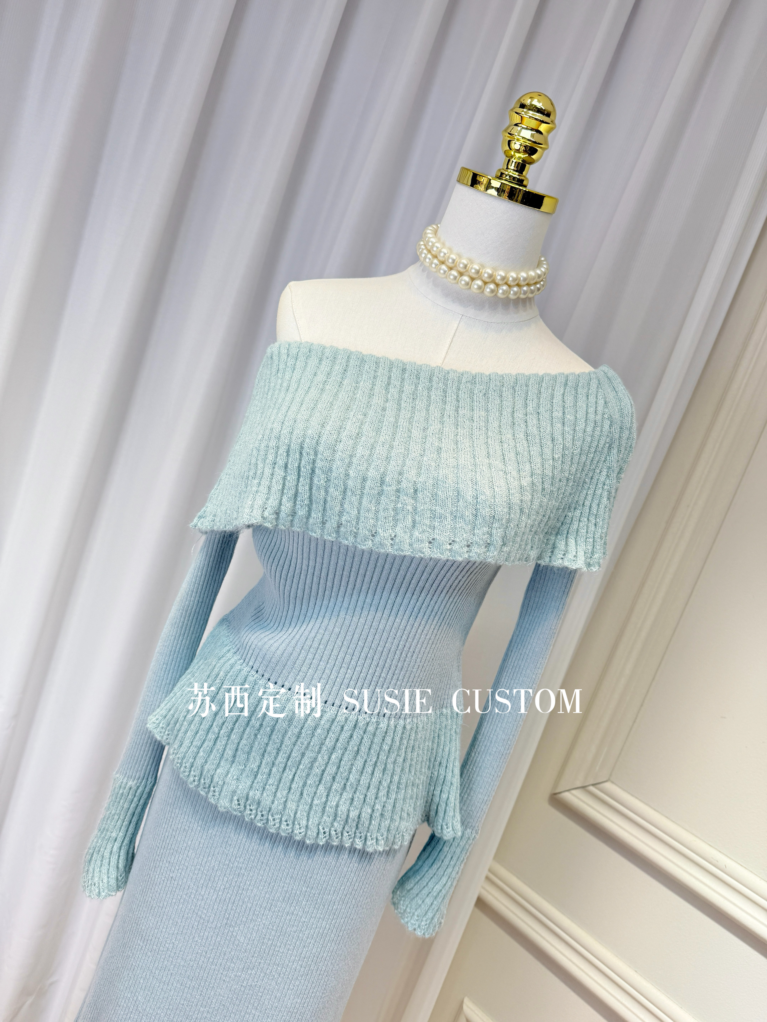 气质一字肩斜肩弹力翻领针织毛线上衣松紧腰包臀鱼尾长裙毛衣套装