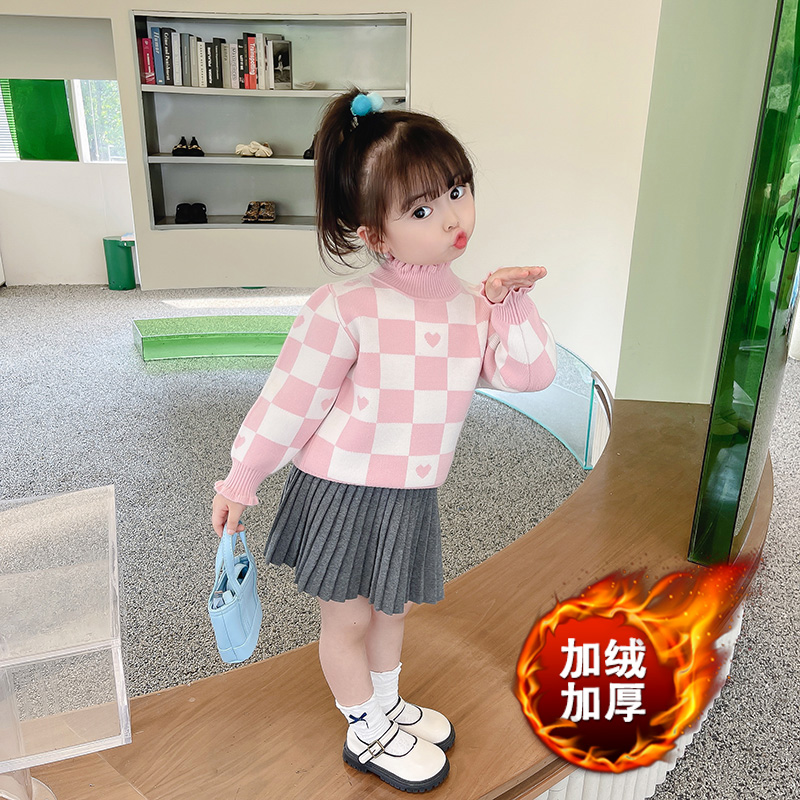 新款女童格子加绒加厚针织毛衣儿童时髦休闲洋气粉色儿童打底上衣