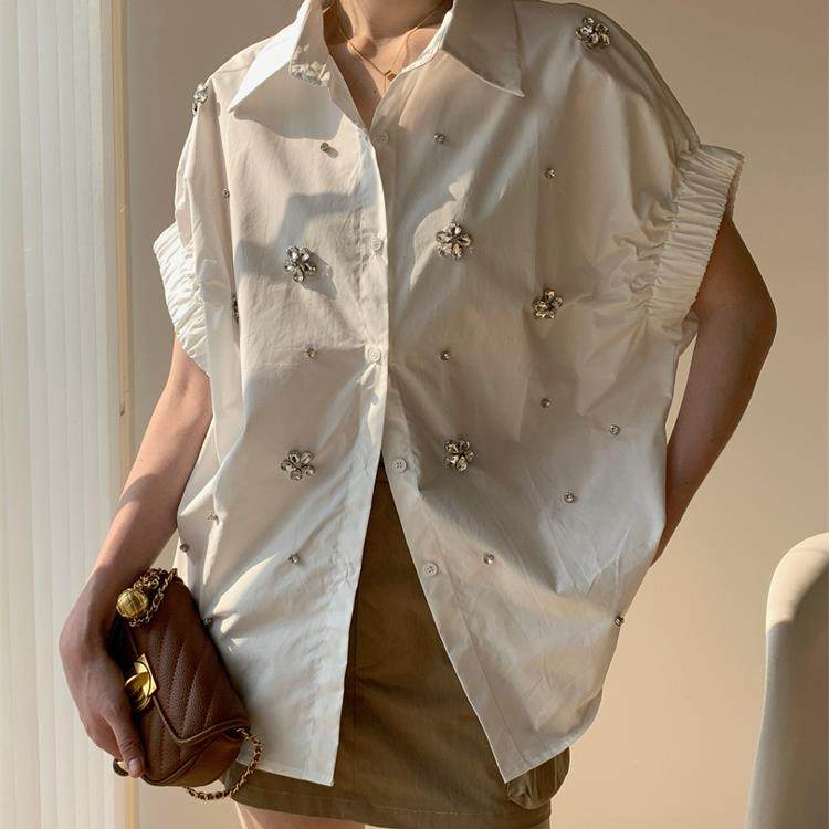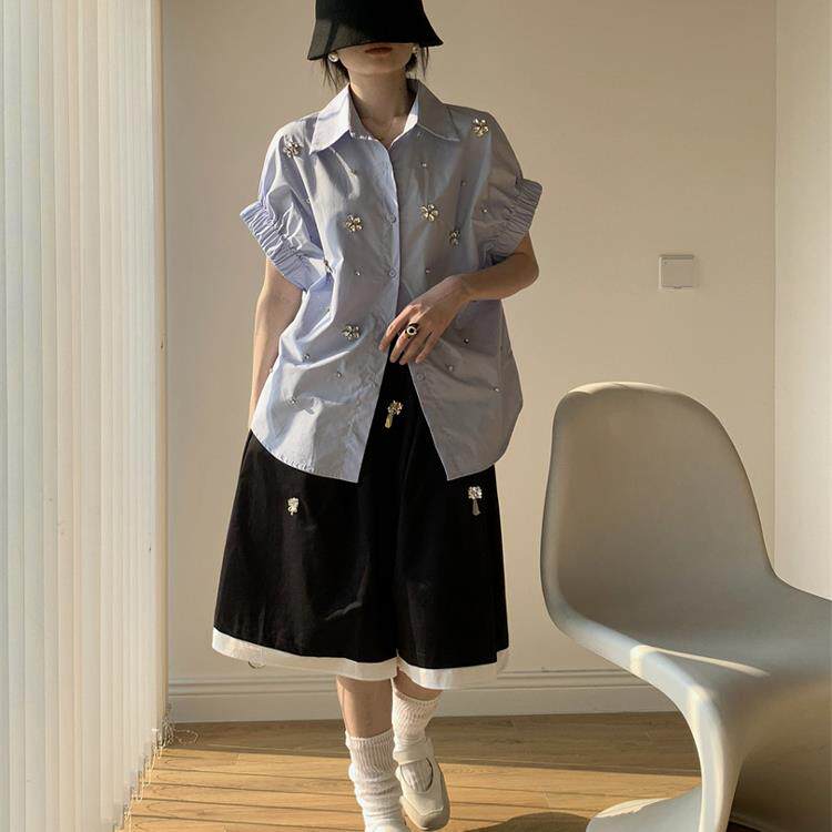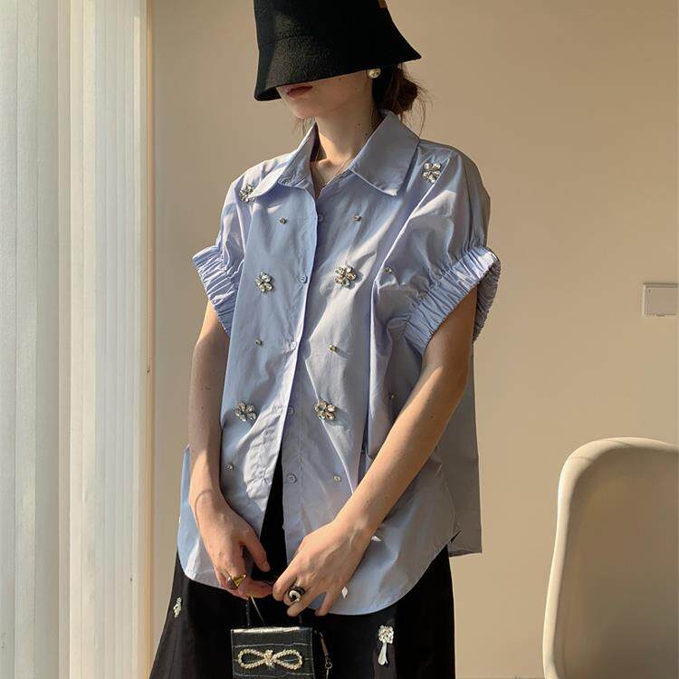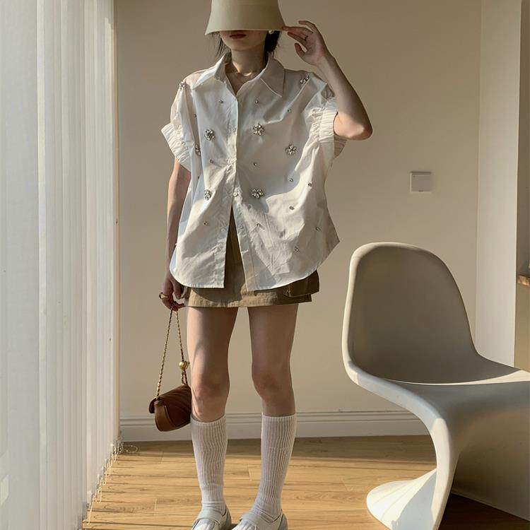 奥吻2025夏季欧货时尚纯色宽松短袖衬衫女钉珠宽松显瘦中长款衬衣