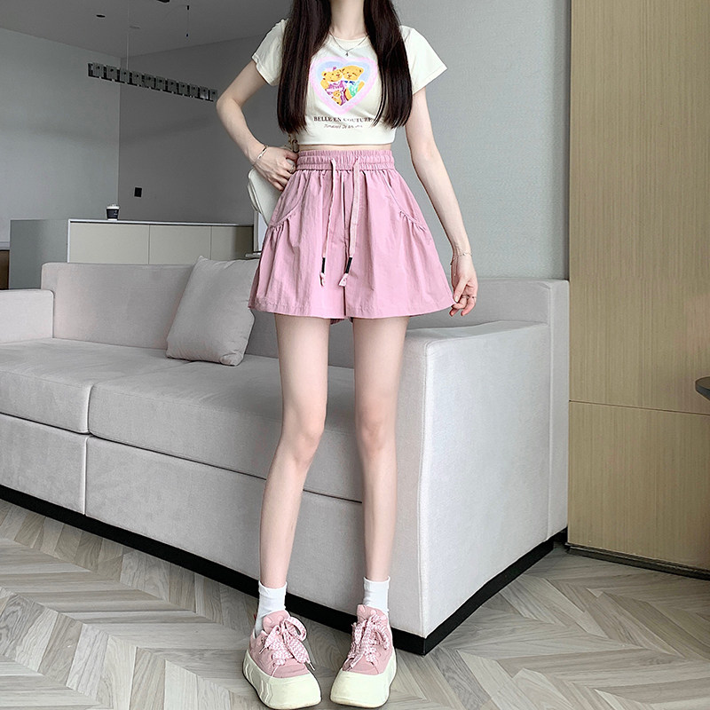 实拍松紧腰粉色休闲短裤女夏季新款抽绳高腰宽松a字速干阔腿裤
