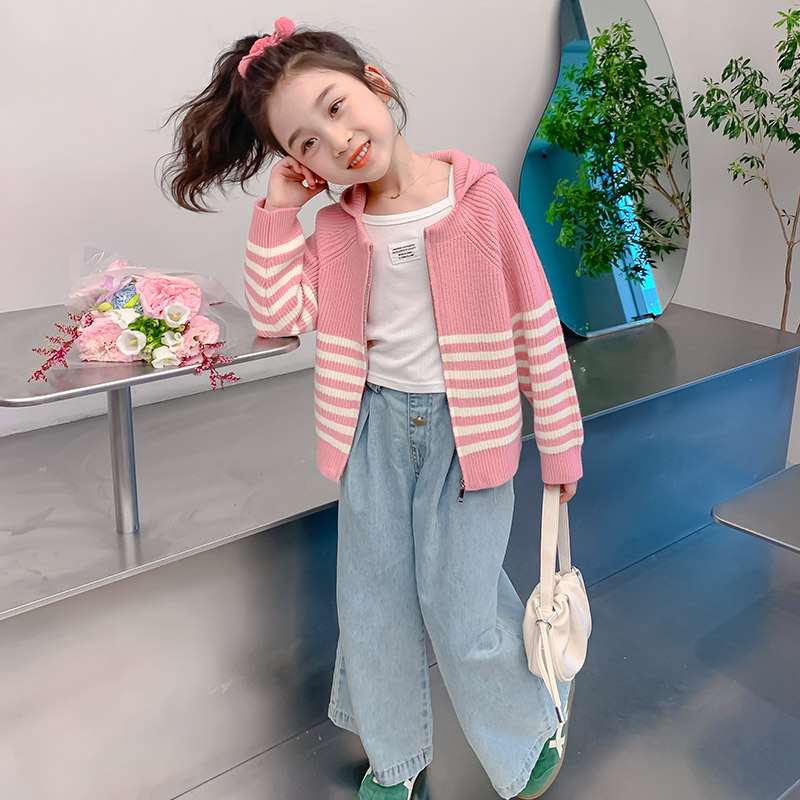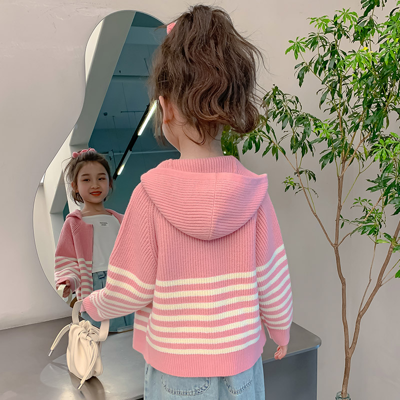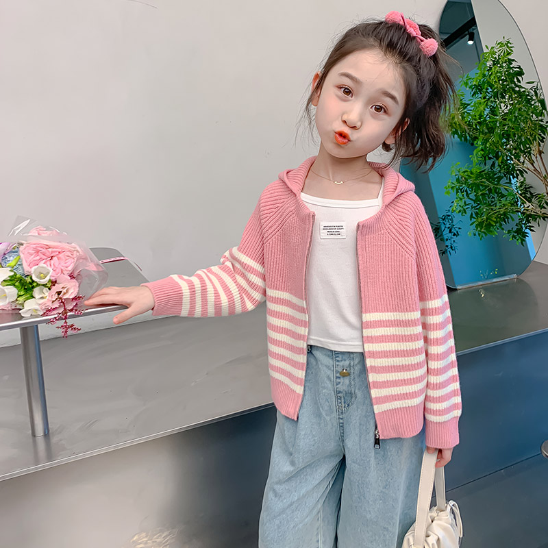 女童开衫毛衣春秋装新款儿童拉链上衣女孩连帽针织衫时髦外套洋气