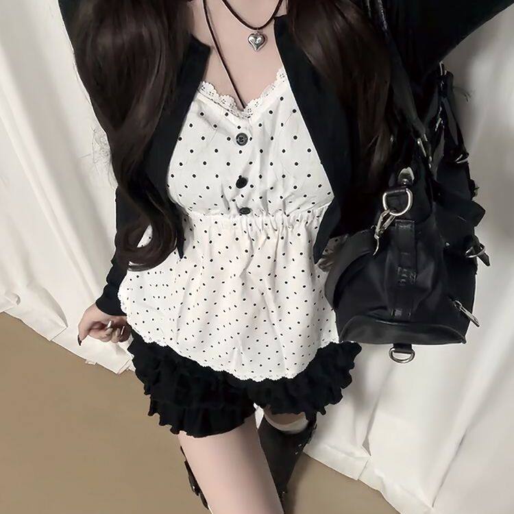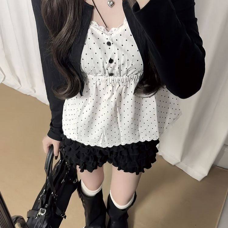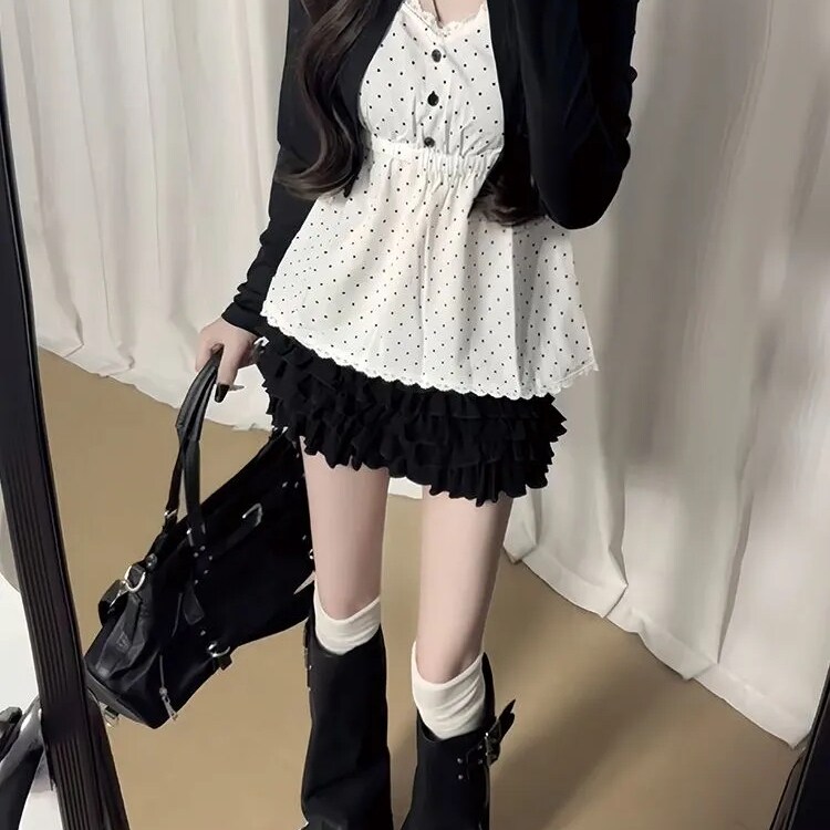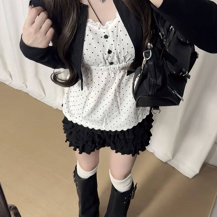 古早感复古波点套装女早秋季新款设计感假两件上衣蛋糕半裙两件套