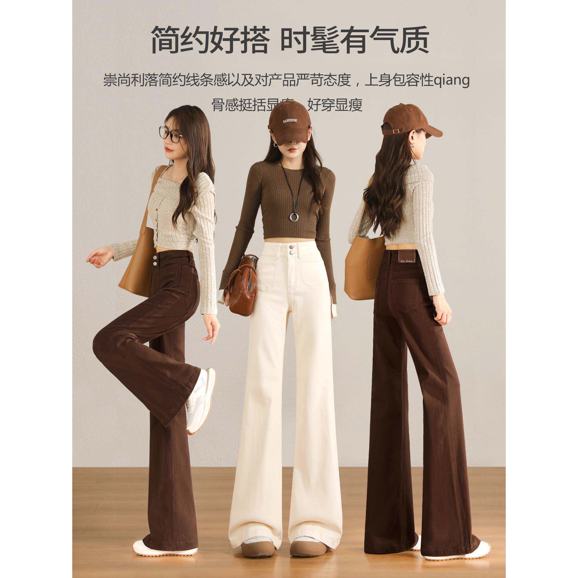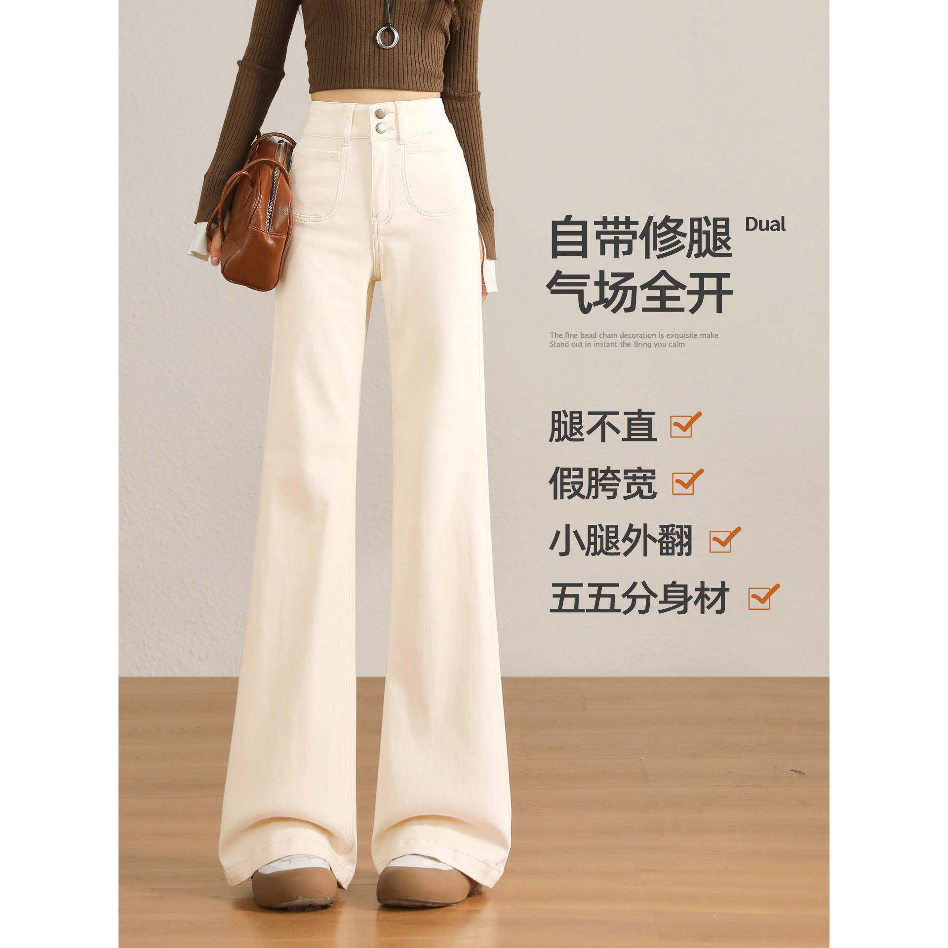 米白色加绒阔腿牛仔裤女秋季2025新款高腰不贴腿直筒微喇叭裤子女