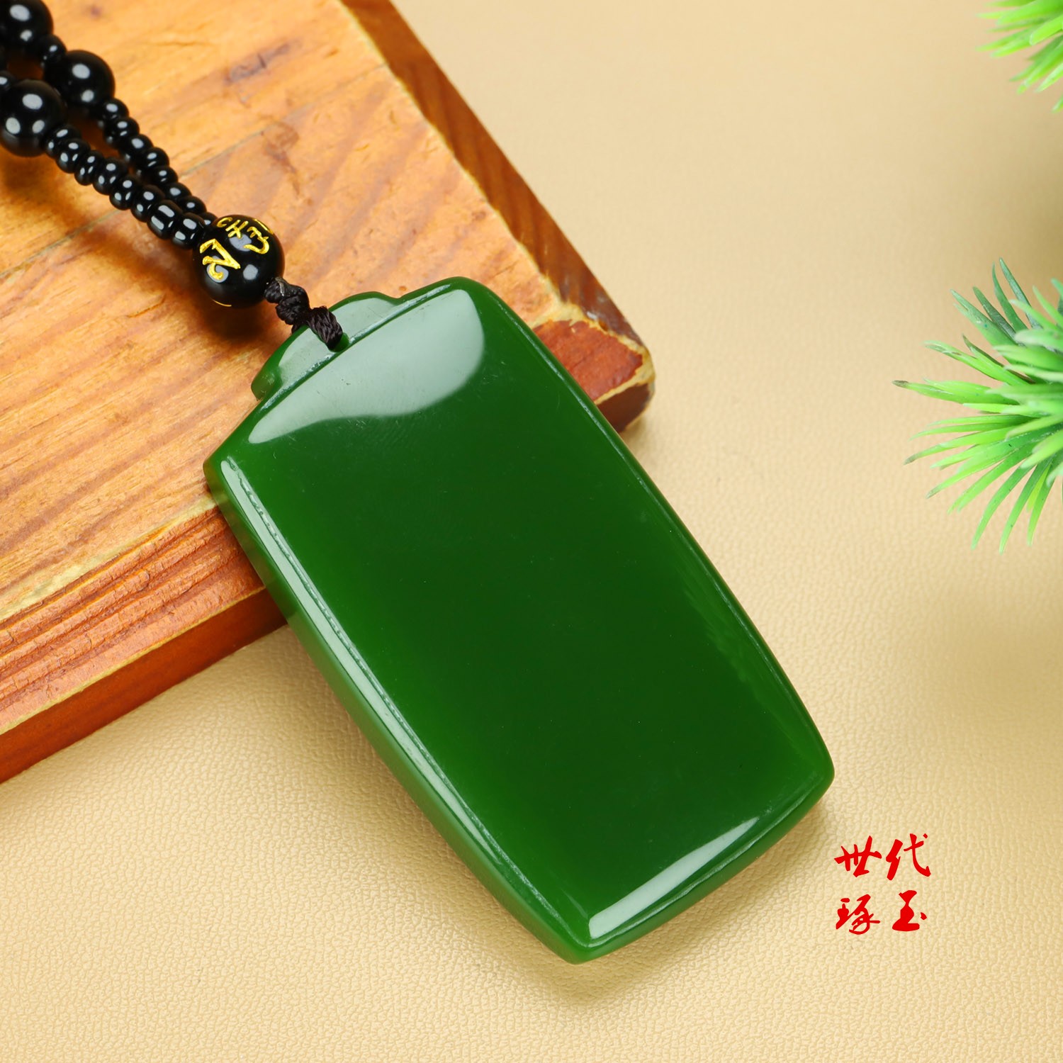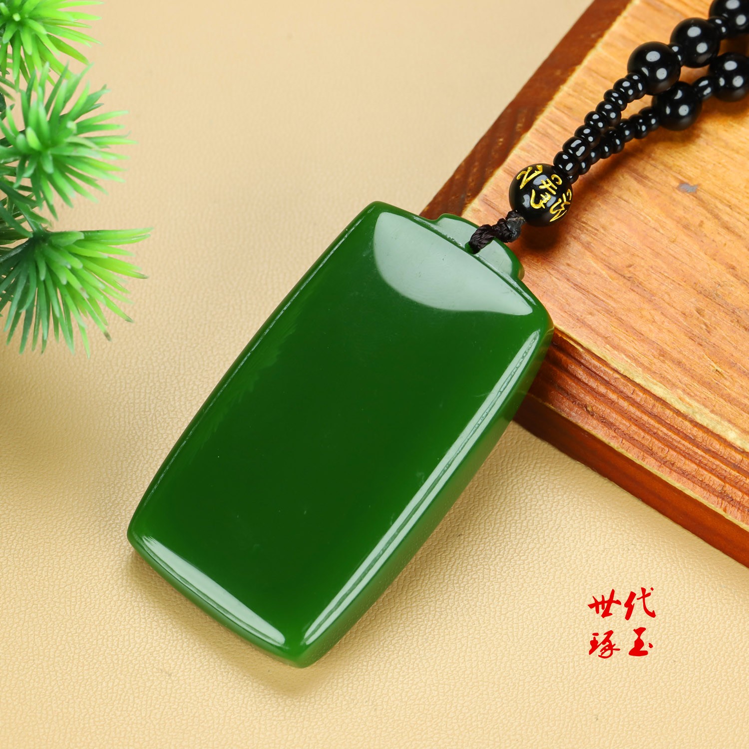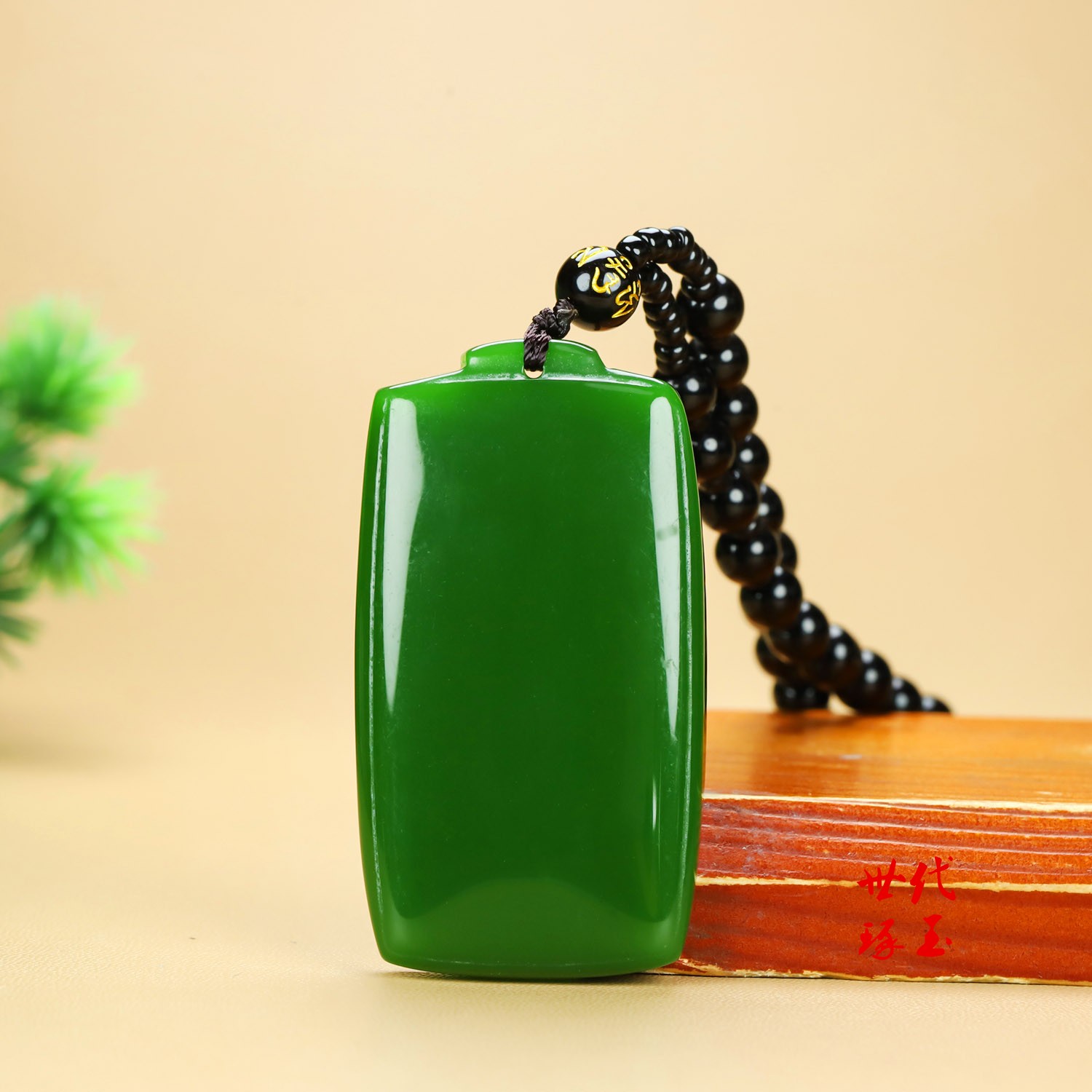 和田玉平安无事牌吊坠男女款新疆玉菠菜绿碧玉面包牌玉佩项链挂件