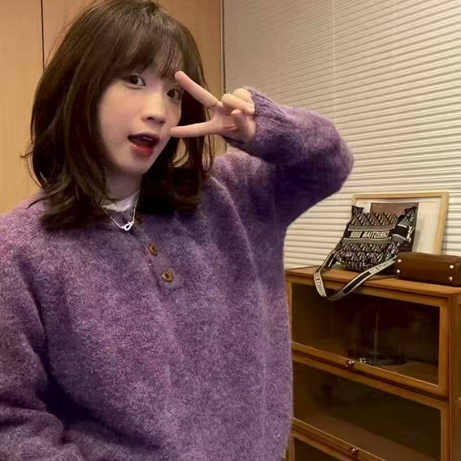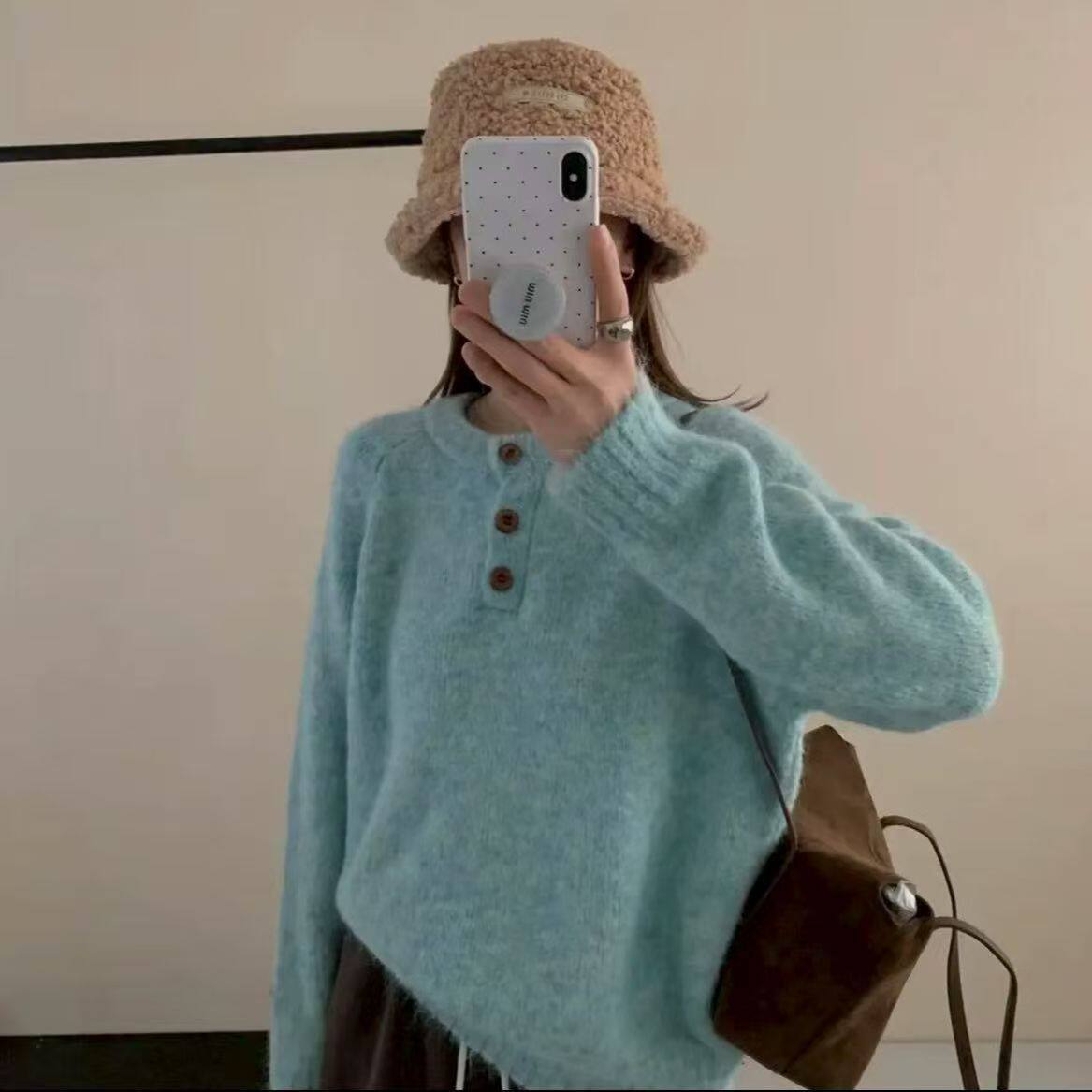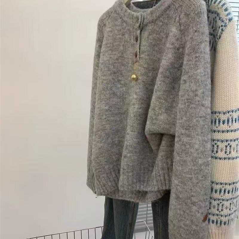 韩版慵懒风圆领短款毛衣开衫春秋款设计感纽扣小众气质针织衫外穿