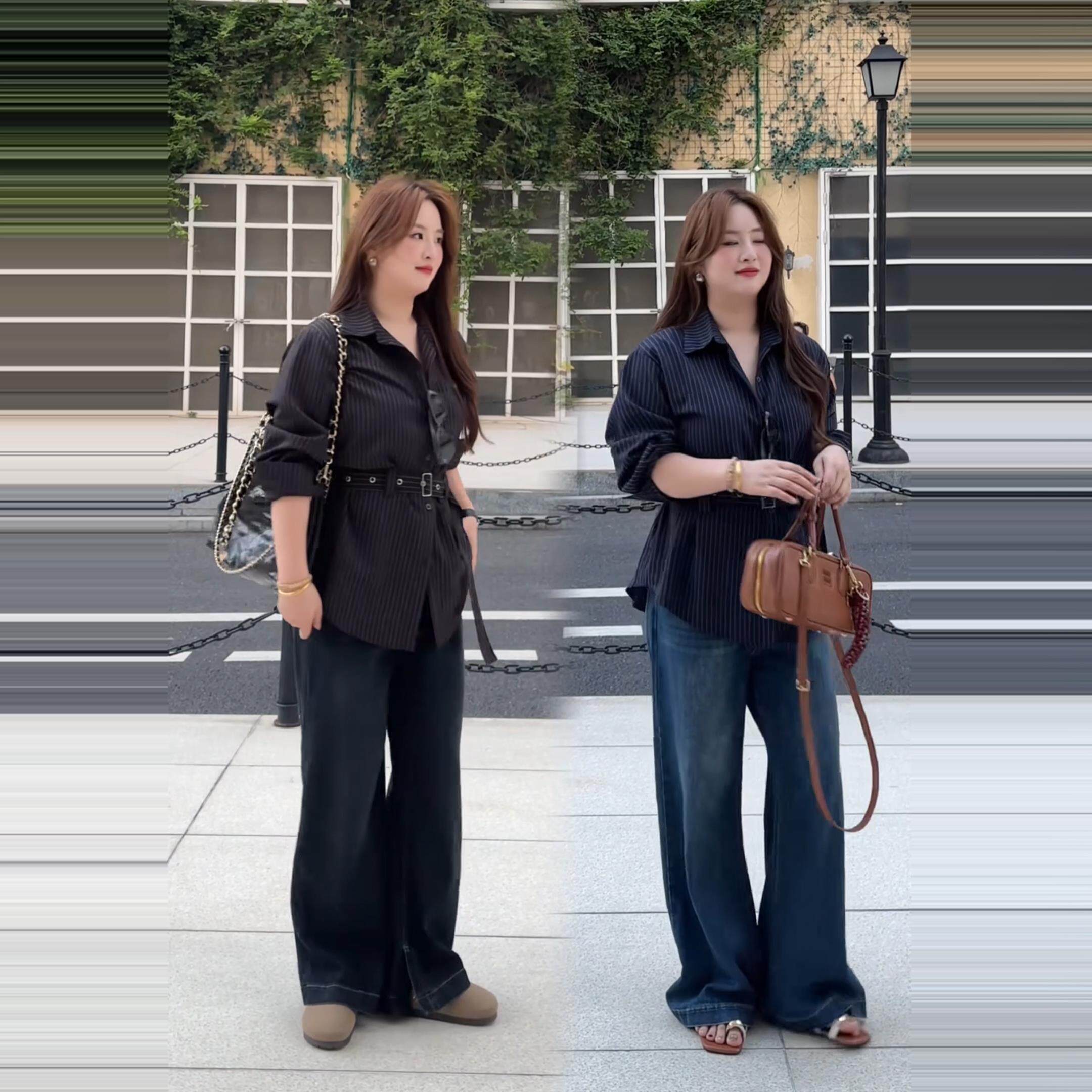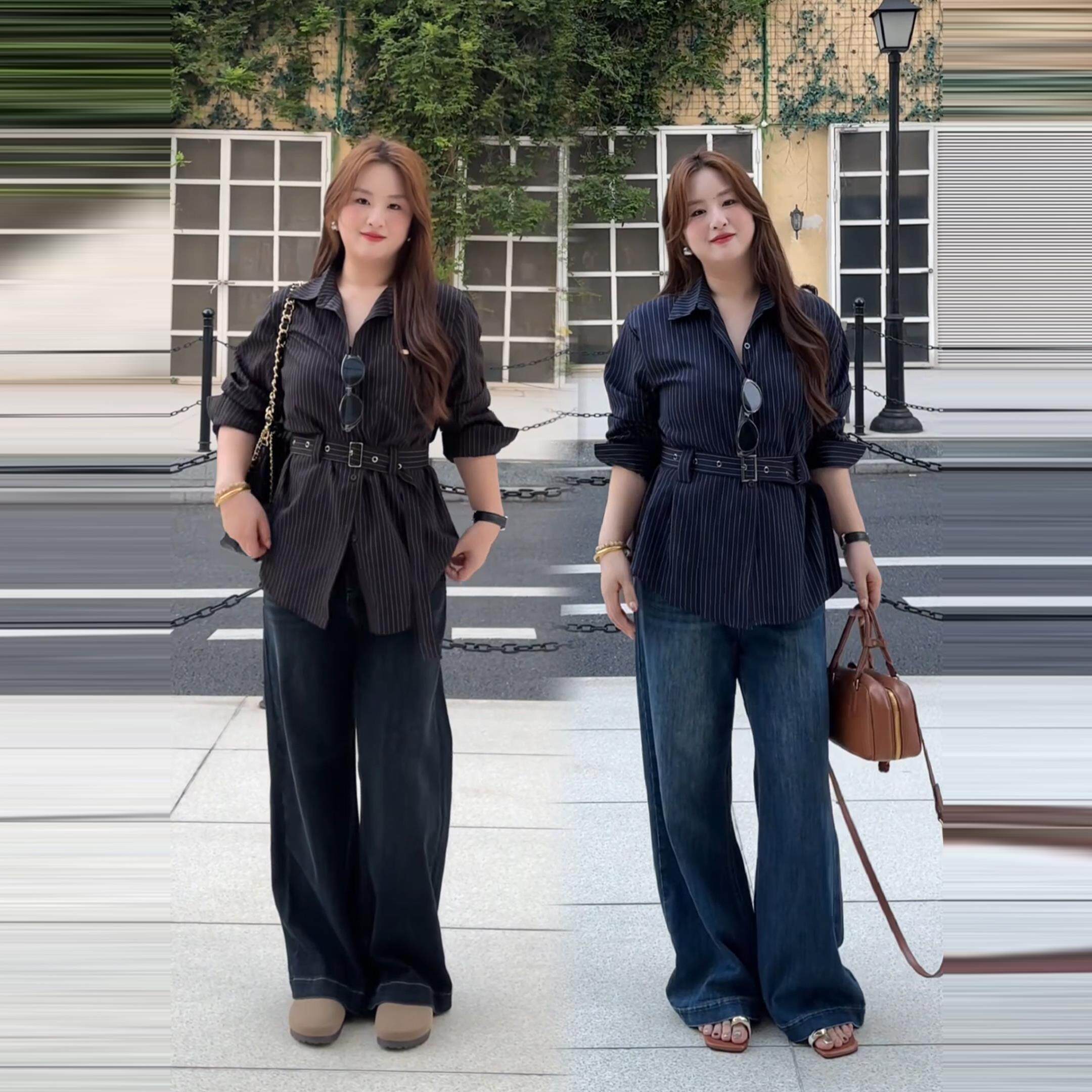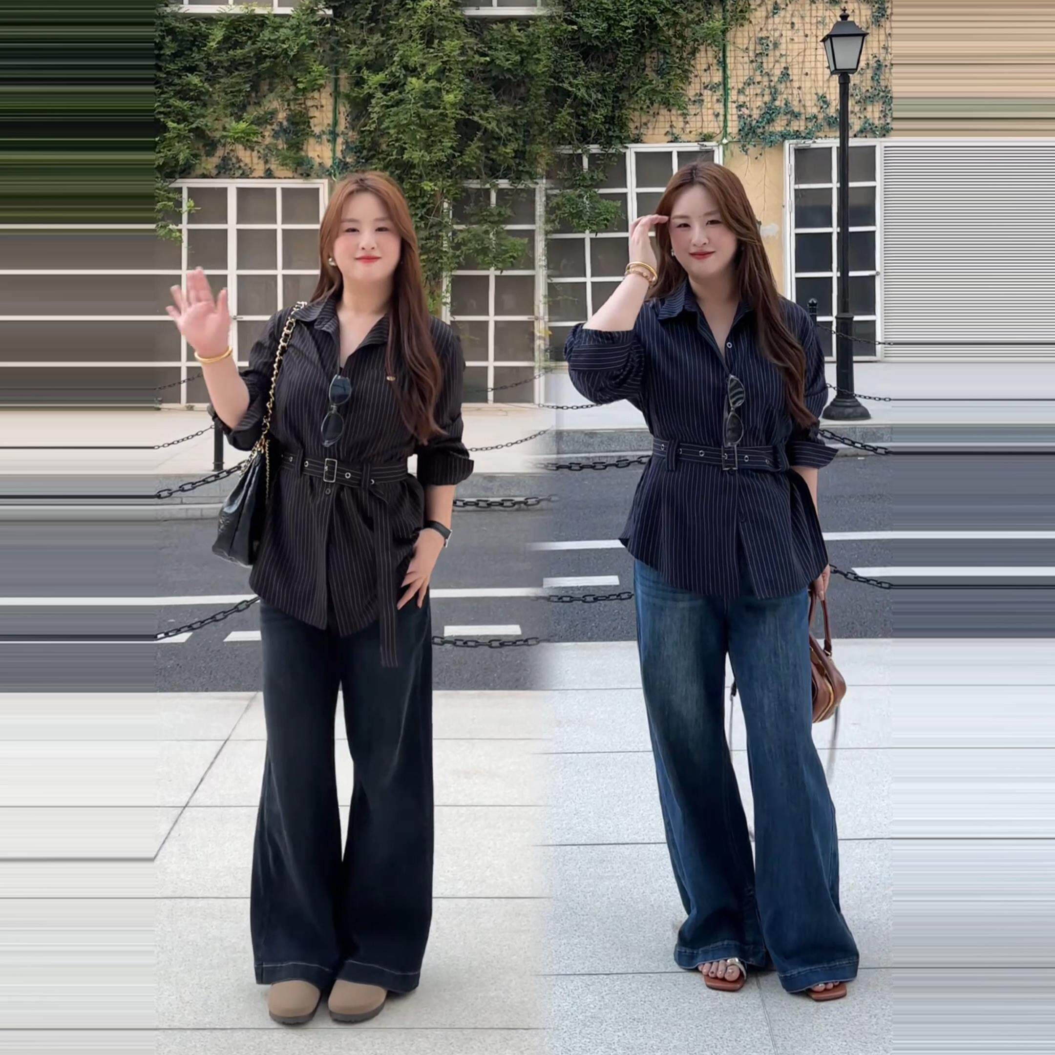 大码覆古小众条纹长袖衬衫女秋季胖mm显瘦系带收腰高级感开衫上衣
